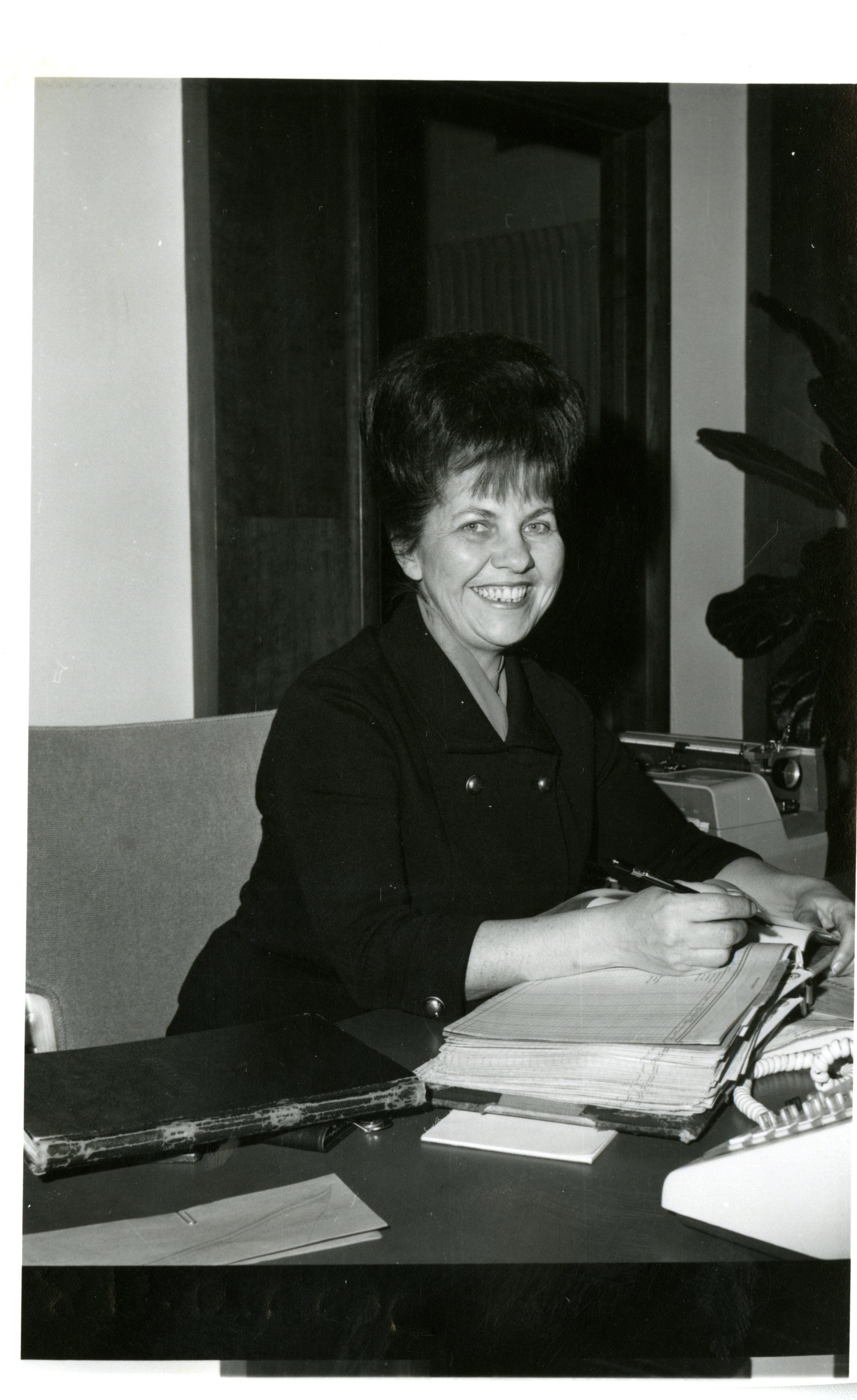 Female bank employee seated at a desk writing in a ledger.