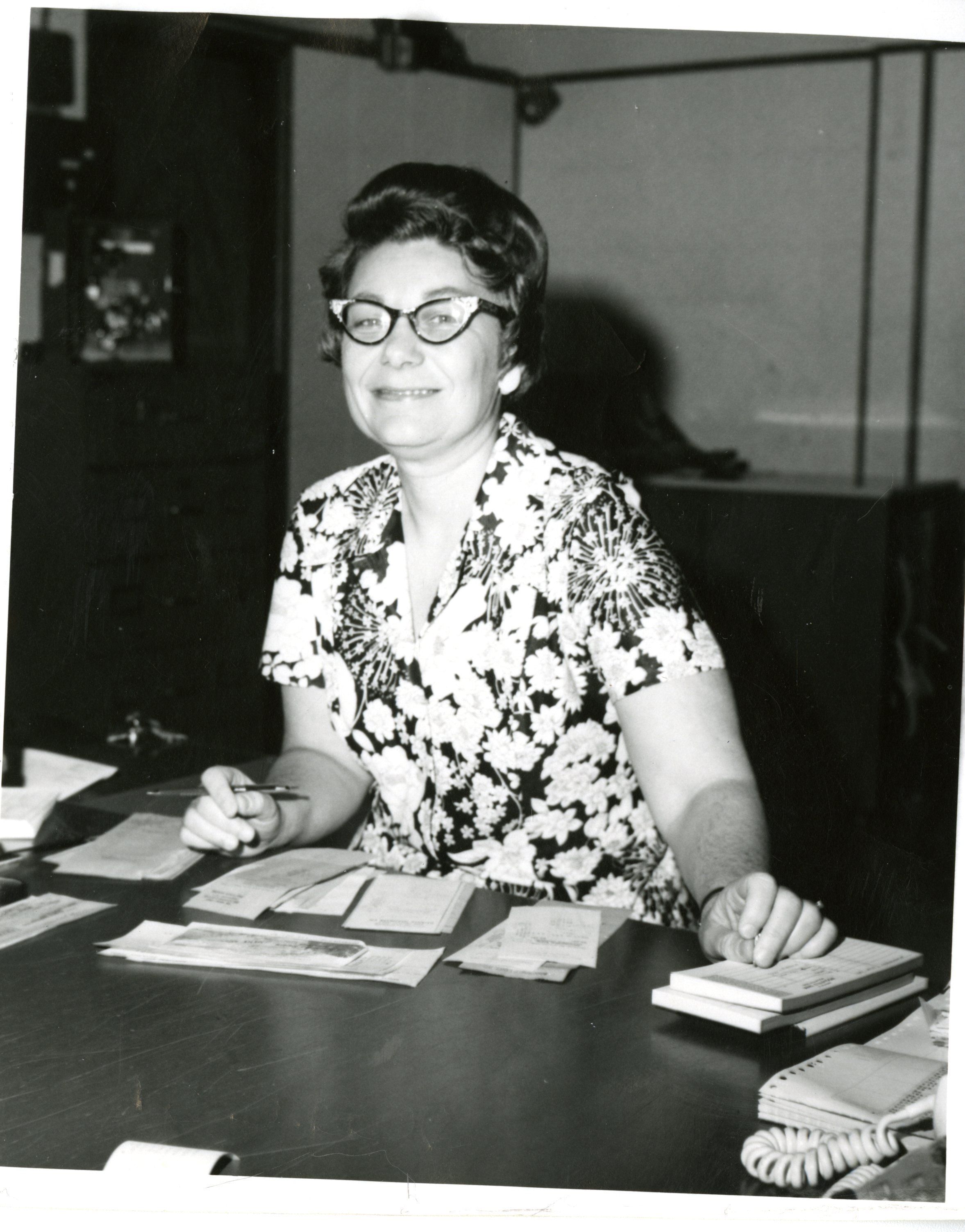 Female bank employee seated a desk where clients could be seated to conduct bank business. Possibly Thelma Dawson.
