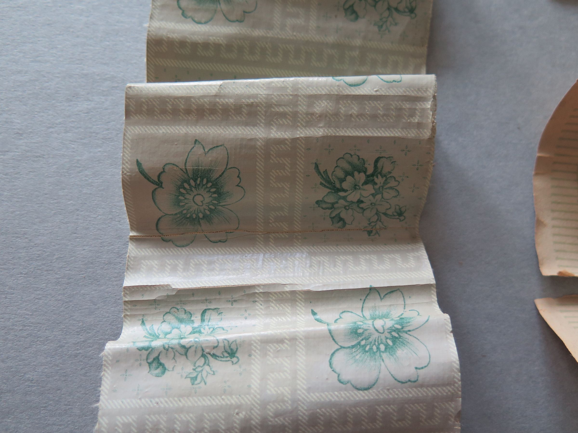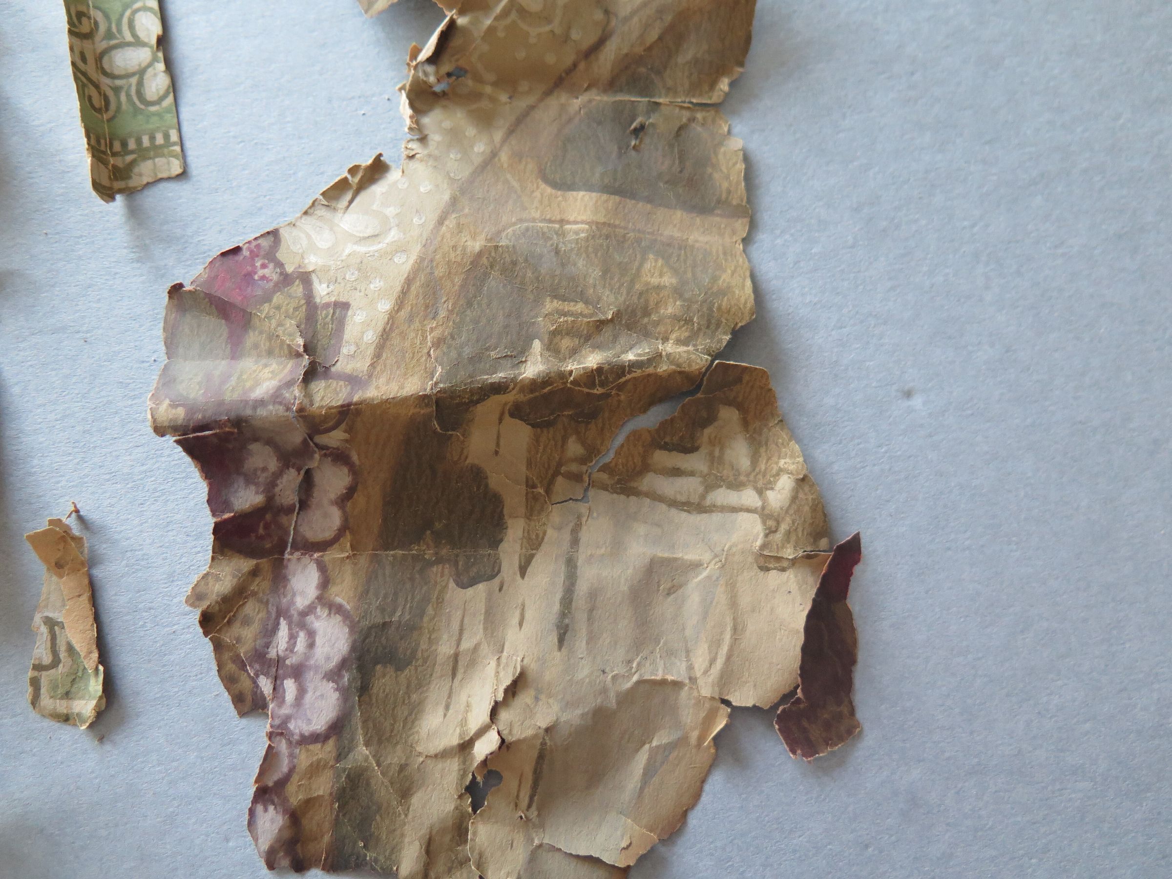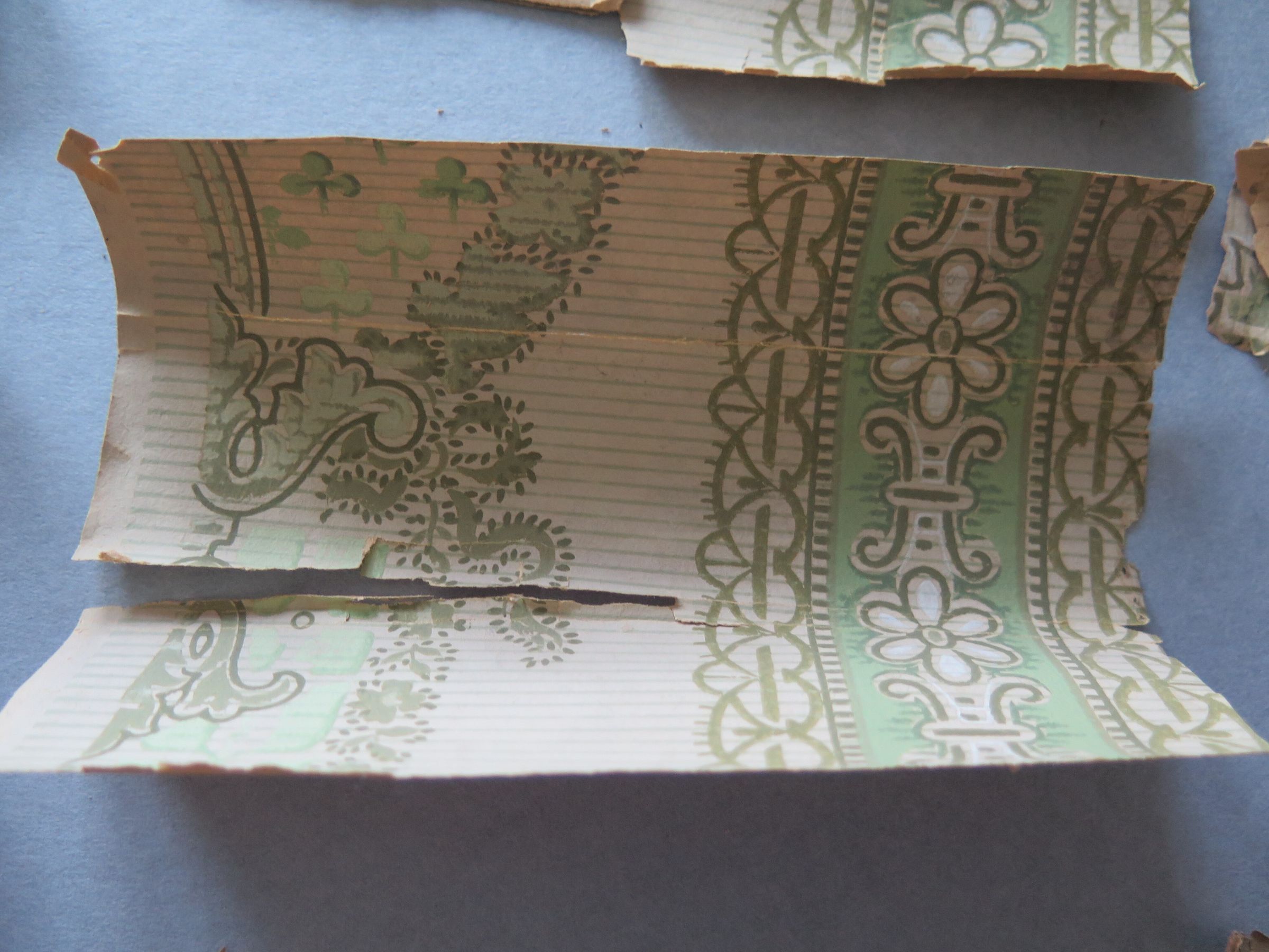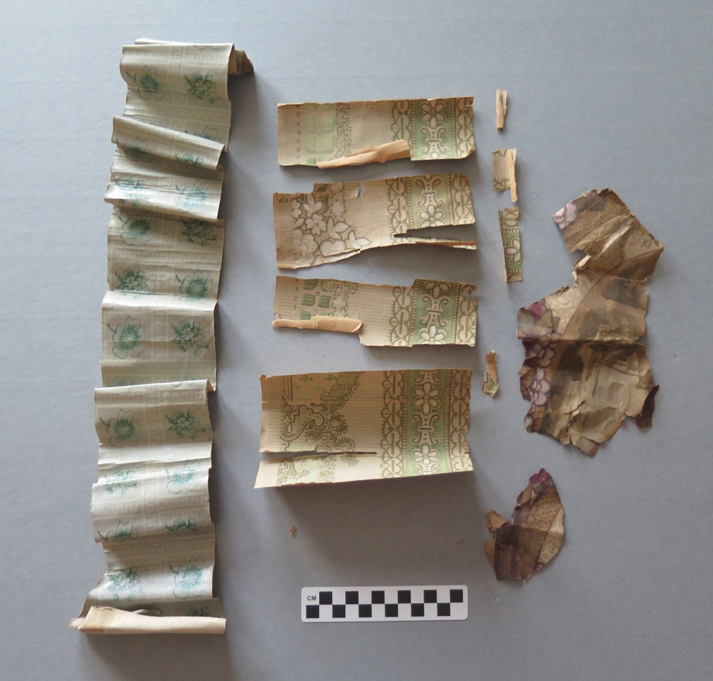 This is fragments of three different wallpaper patterns. The wallpaper is very brittle. One pattern is grey with white lines and green flowers (a). This wallpaper fragment measures 6.5" (w) x 29" (l). Another patten is green with white flowers on it (b). This piece has broken into 3 pieces due to the brittleness of the paper. The last pattern is grey and green, but too fragmented to see the pattern (c).