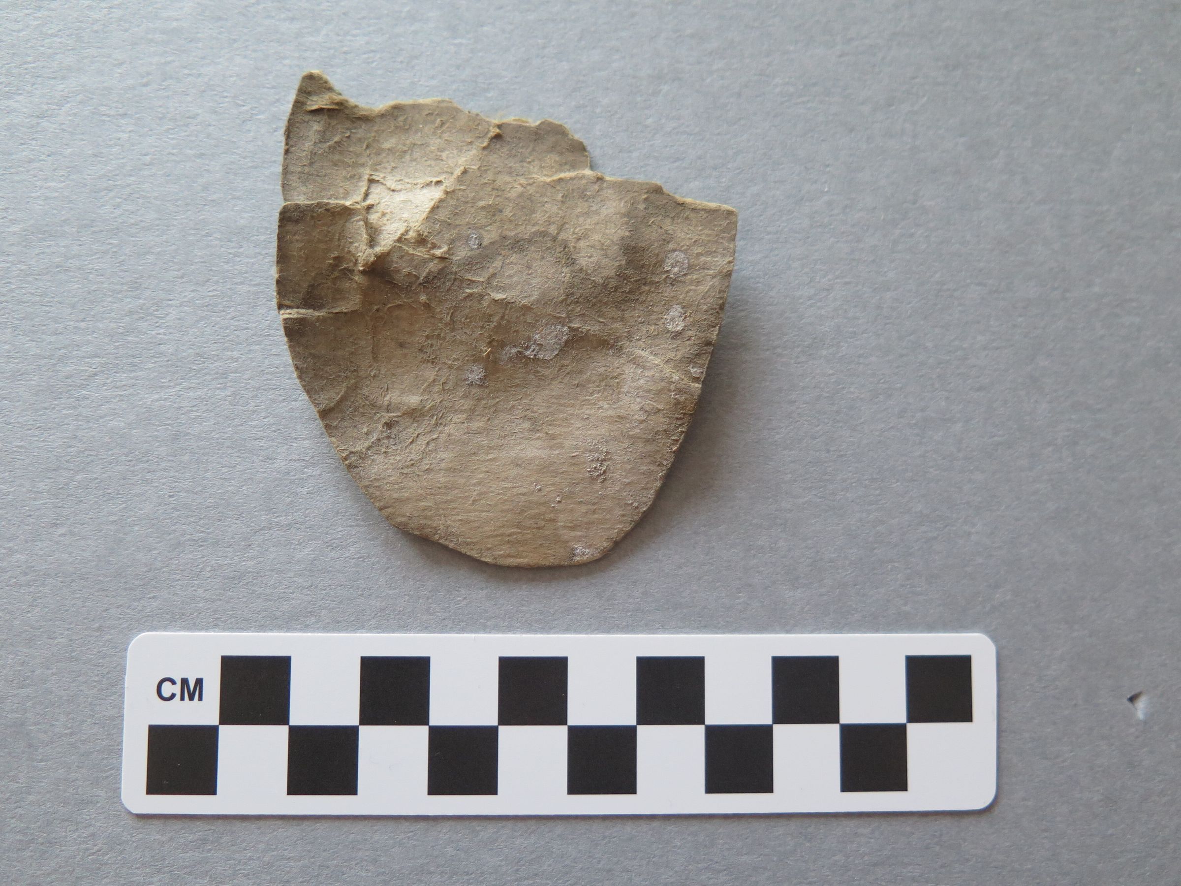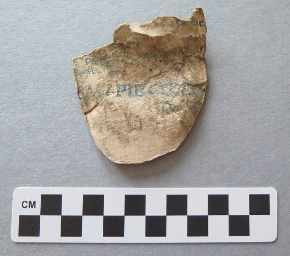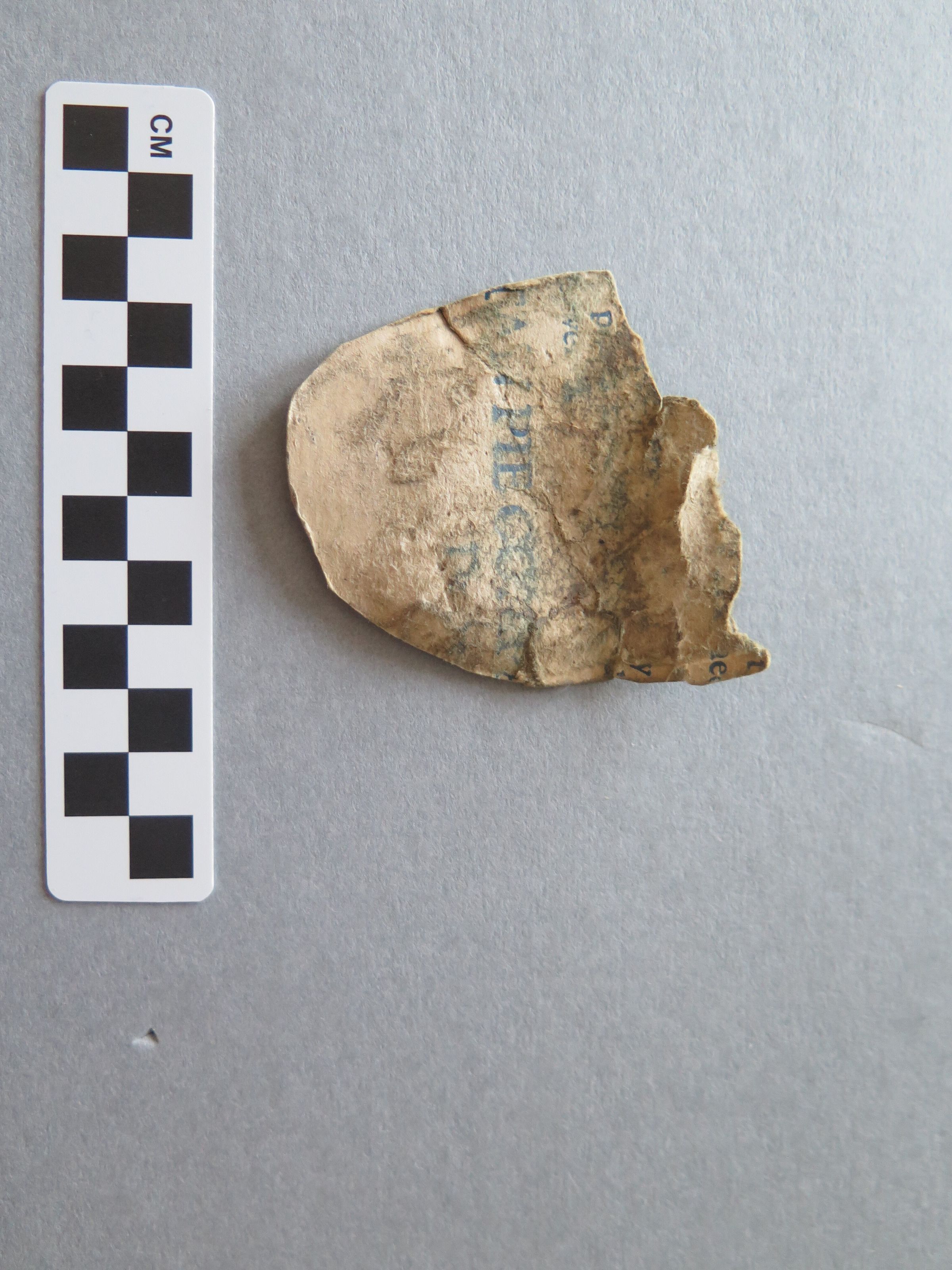 This is listed on the registration sheet as a pie tin found covering chimney opening in bedroom at top of stairs. While the pie tin was not found with the other items in the accession, a fragment of cardboard was found with the text "??TAN PIE ??". It is possible that this cardboard was part of the packaging for the pie tin.