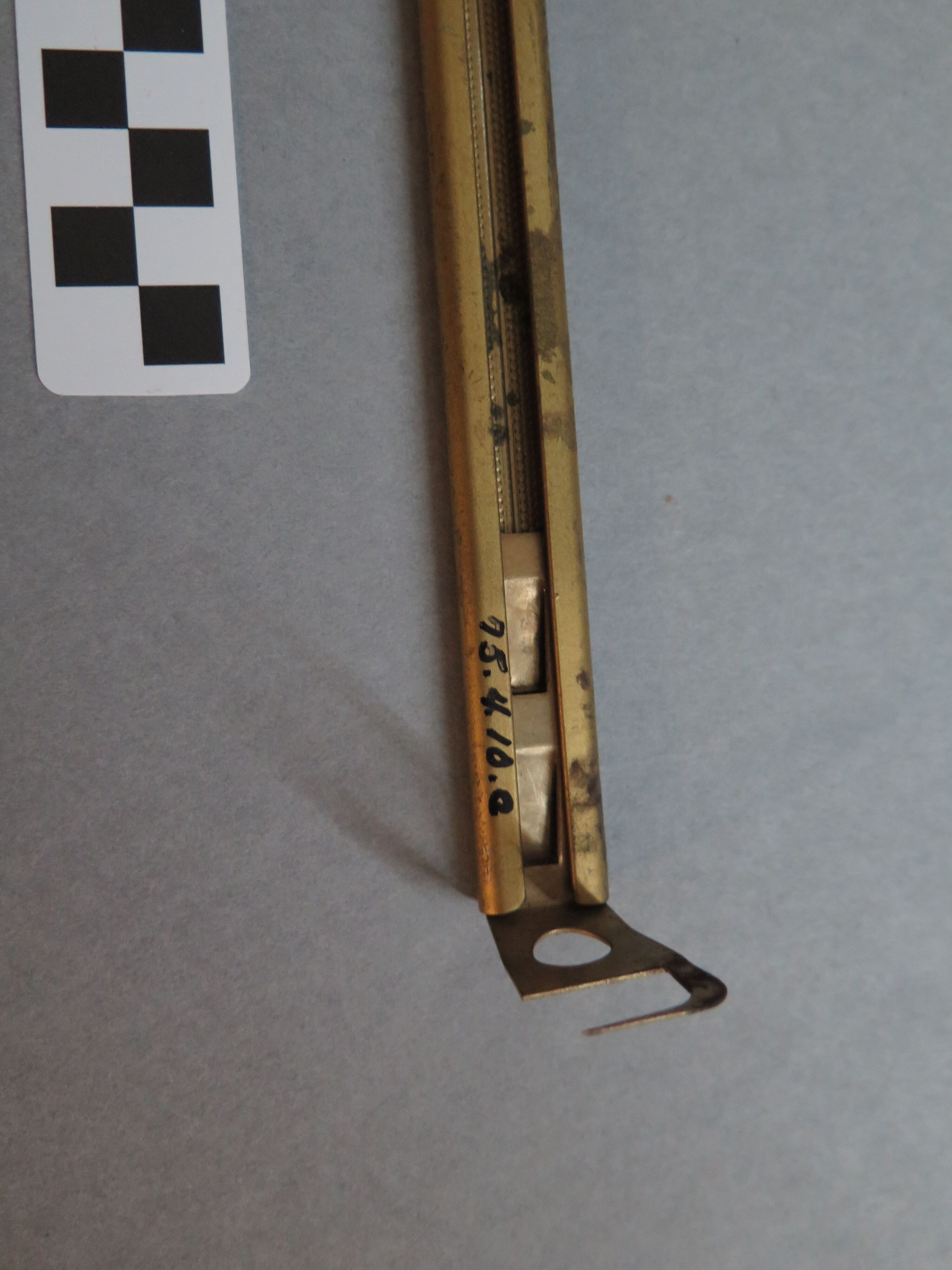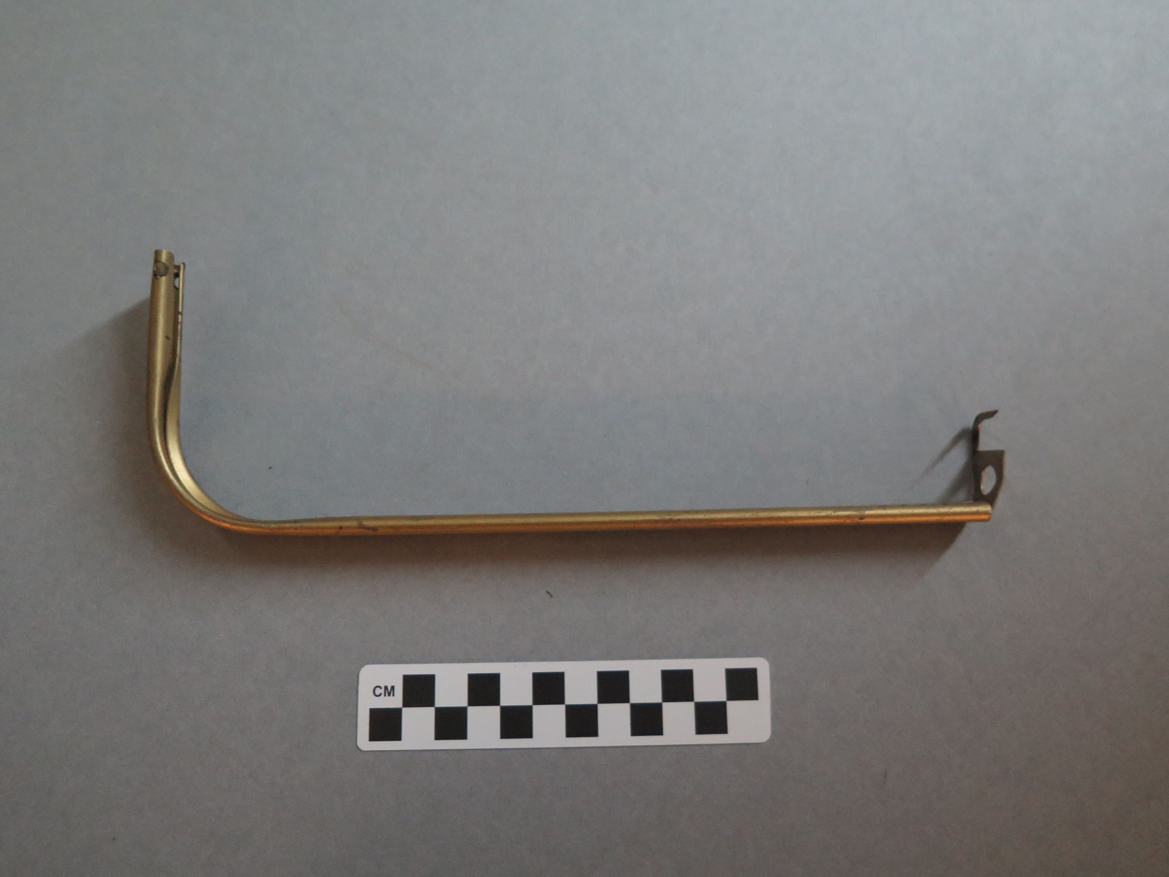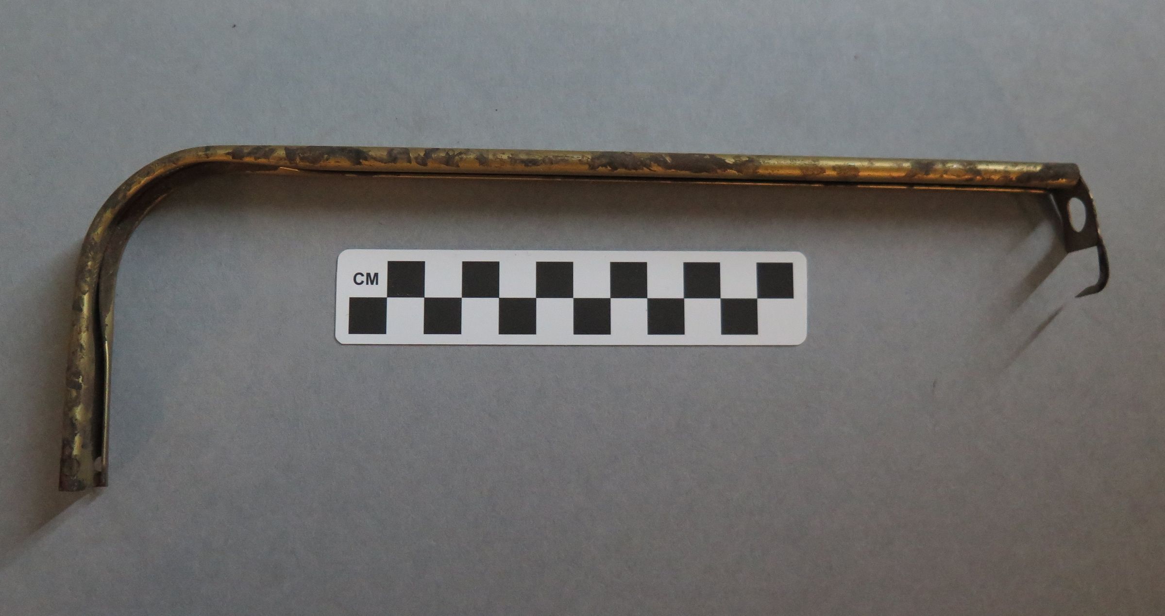 This is a gold colored short curtain rod. The rod is curved on both ends. One end has a round hole and a hook. The rod would have attached to another piece to cover the whole window. The curtain rod measures 0.75" (h) x 3.5" (w) x 10.5" (l).Collection