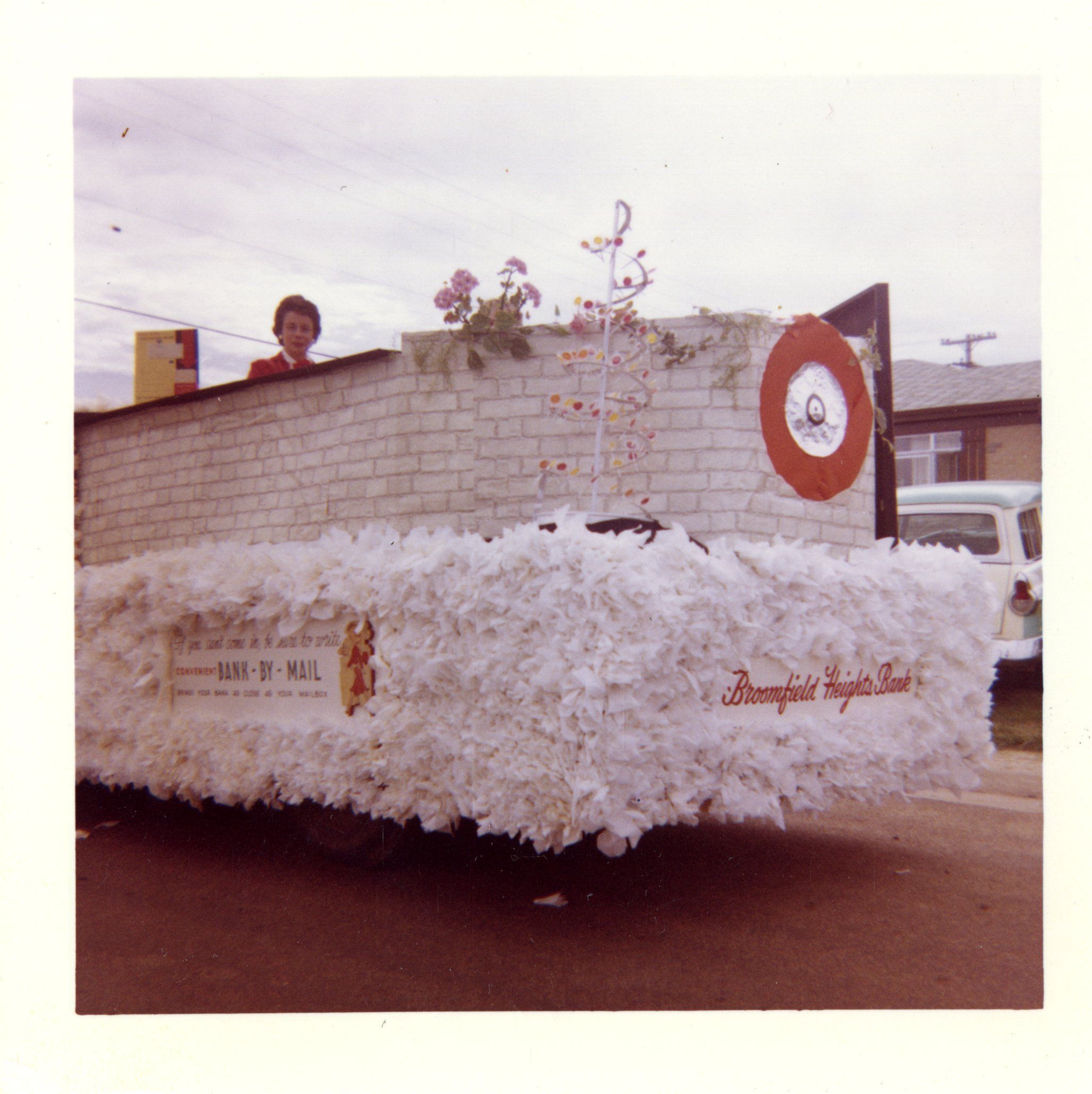 Lady seated at the top of the Broomfield Heights Bank float. Sign on float says "Bank by Mail".