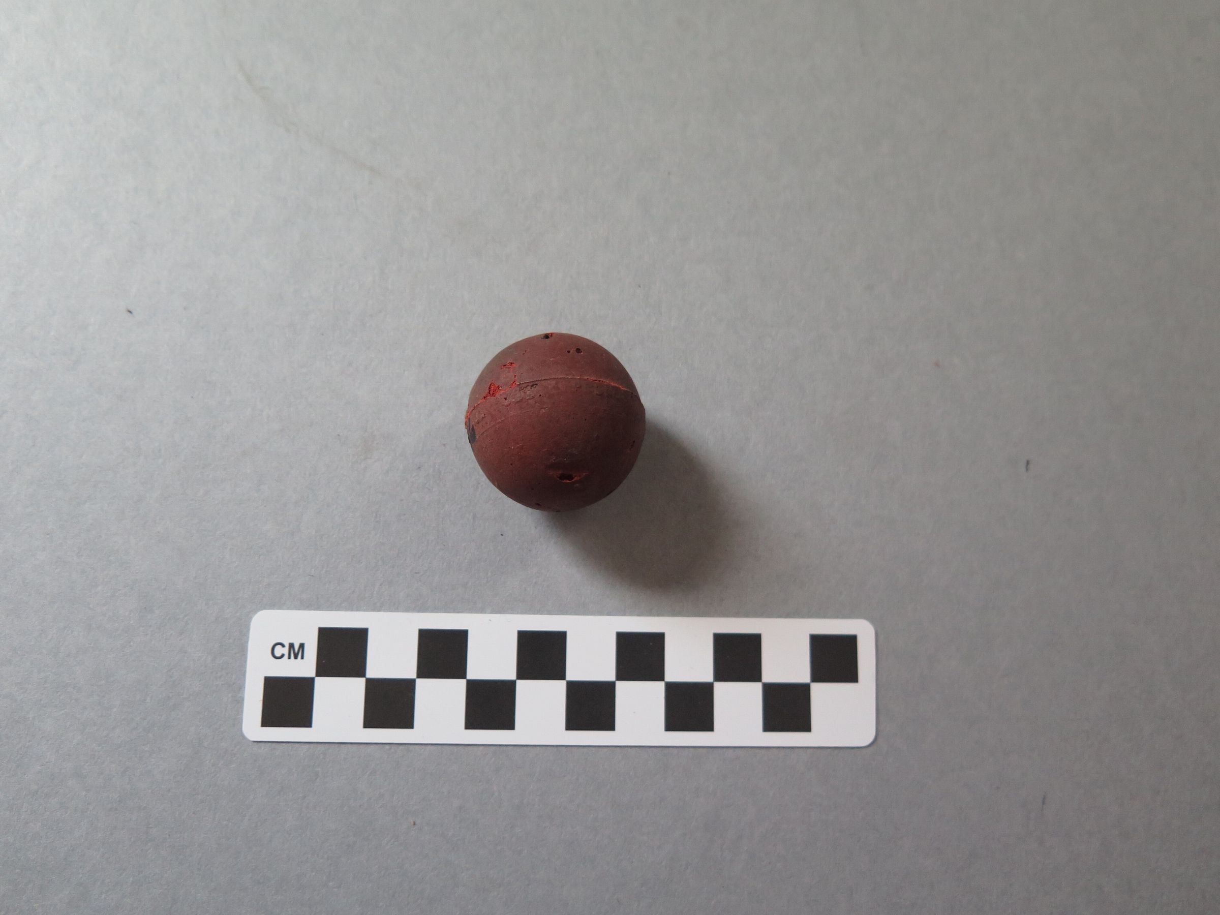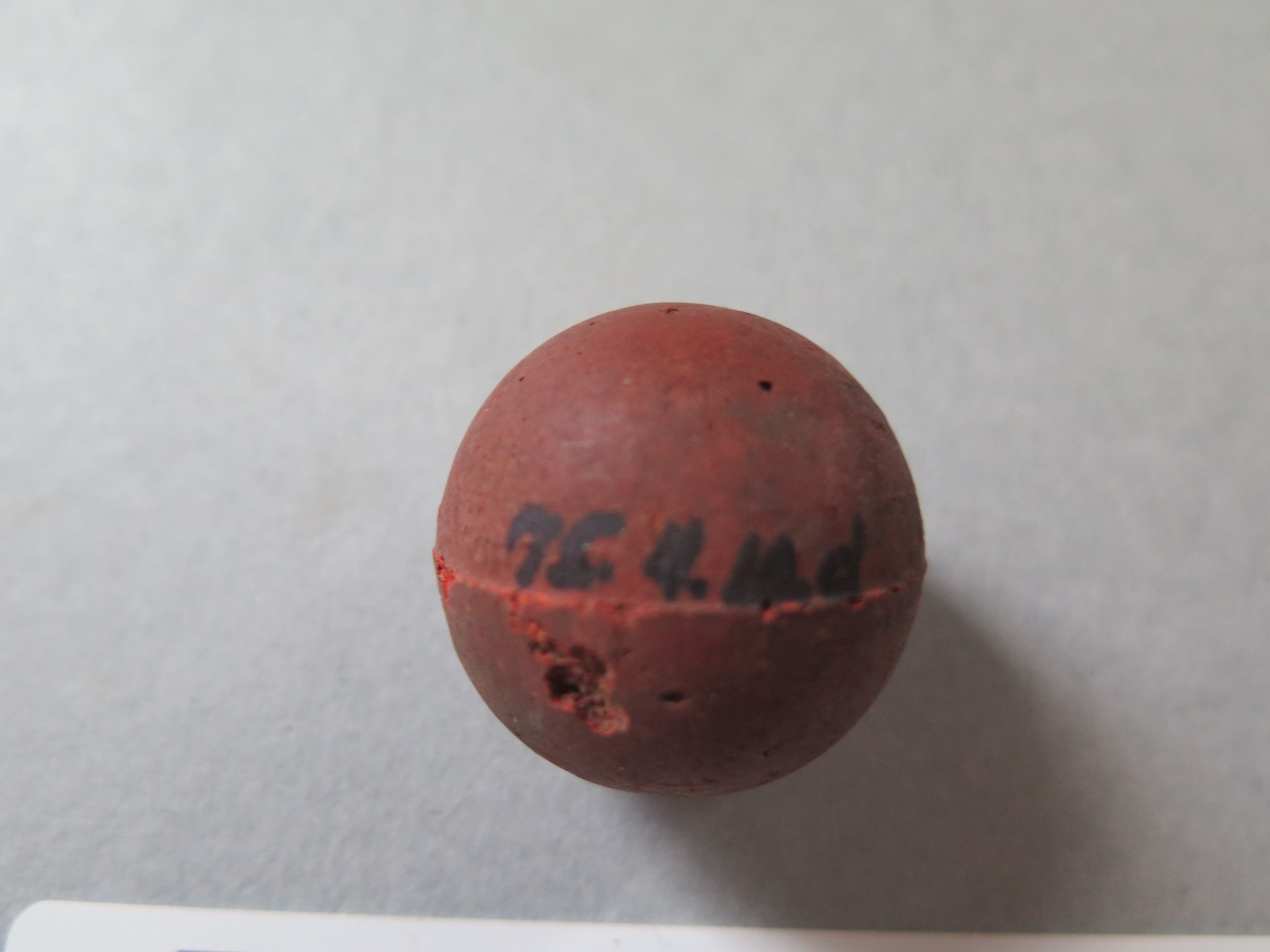 This is a hard rubber ball. The ball is red and has some small craters throughout, where the material has been chipped off. There are no markings on the ball to suggest who made it. The ball measures 4.5" (circum).Collection
