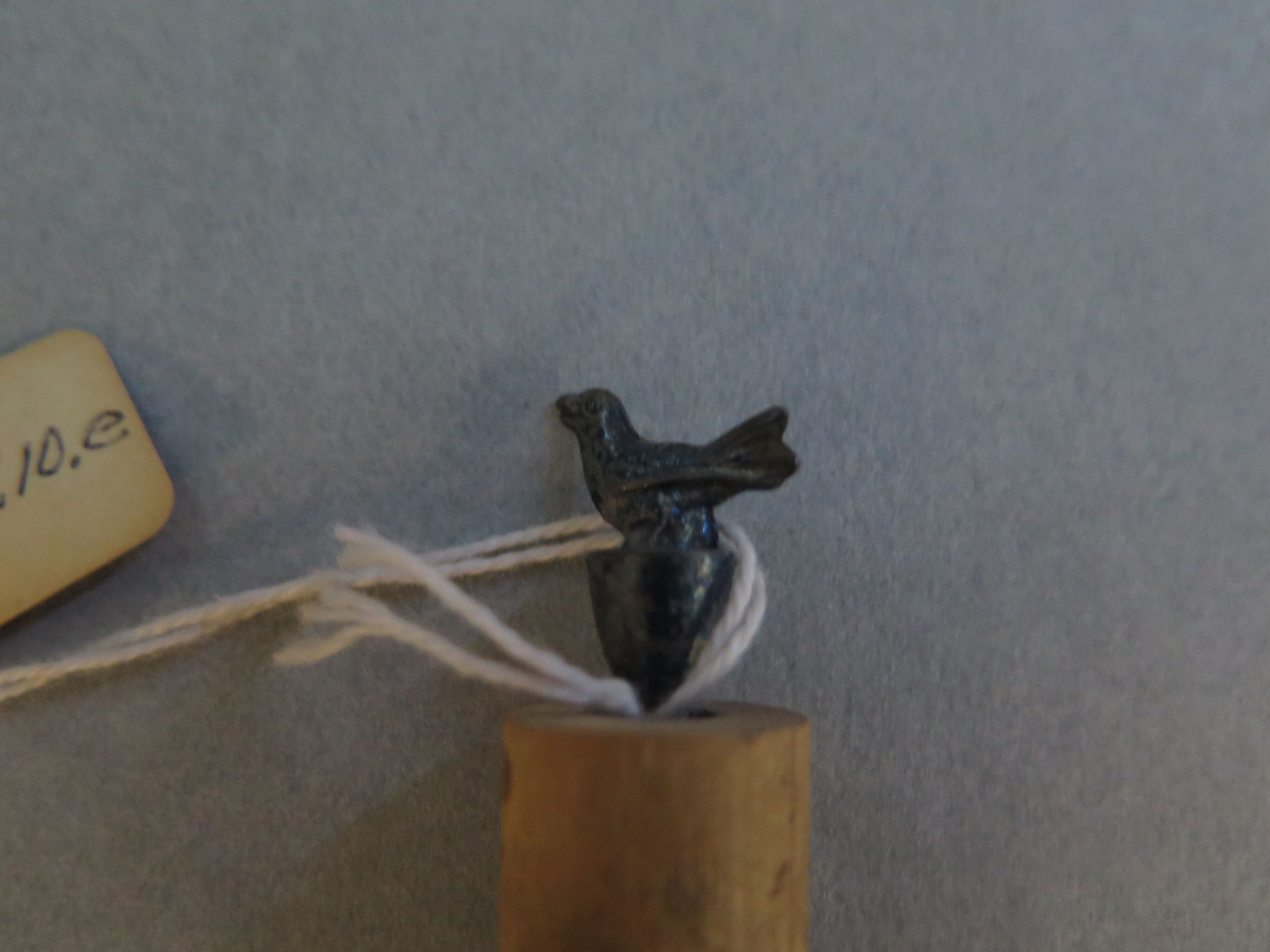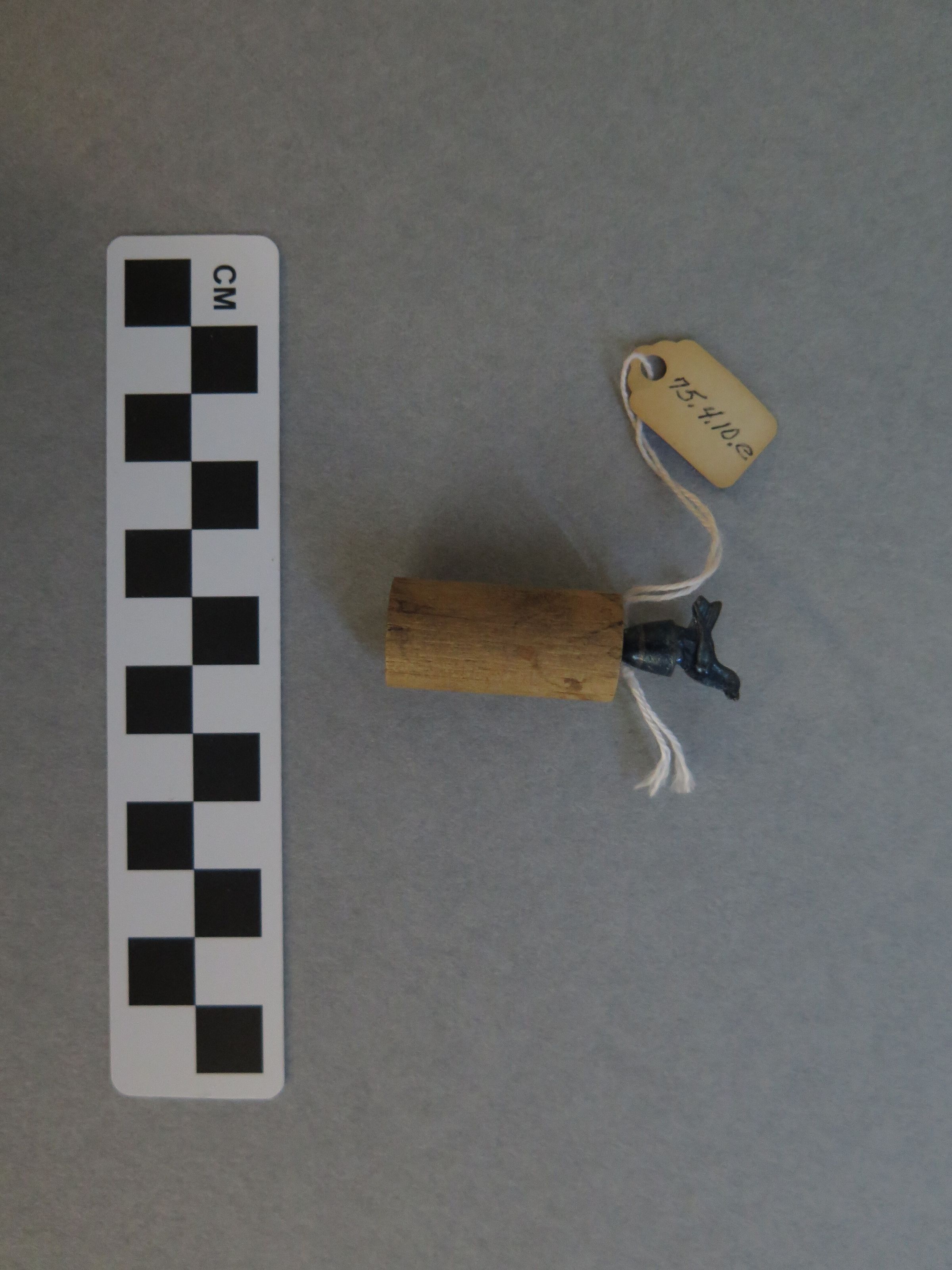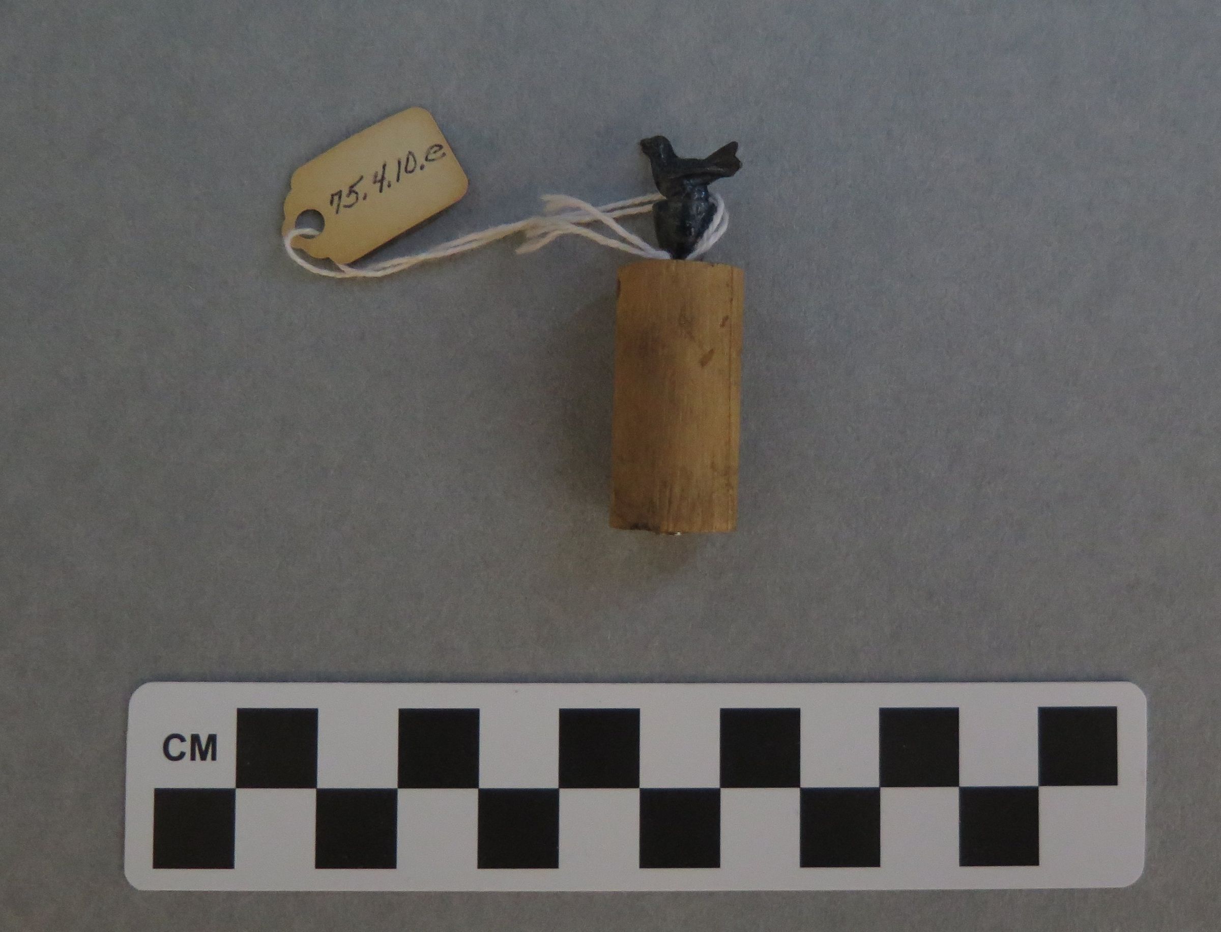 This is a bottle stopper made of a wood cylinder. A hole has been drilled through the cylinder so that a blue painted metal bird could be attached to the top of the stopper. The stopper measures 2" (h) x 0.5" (diam).Collection