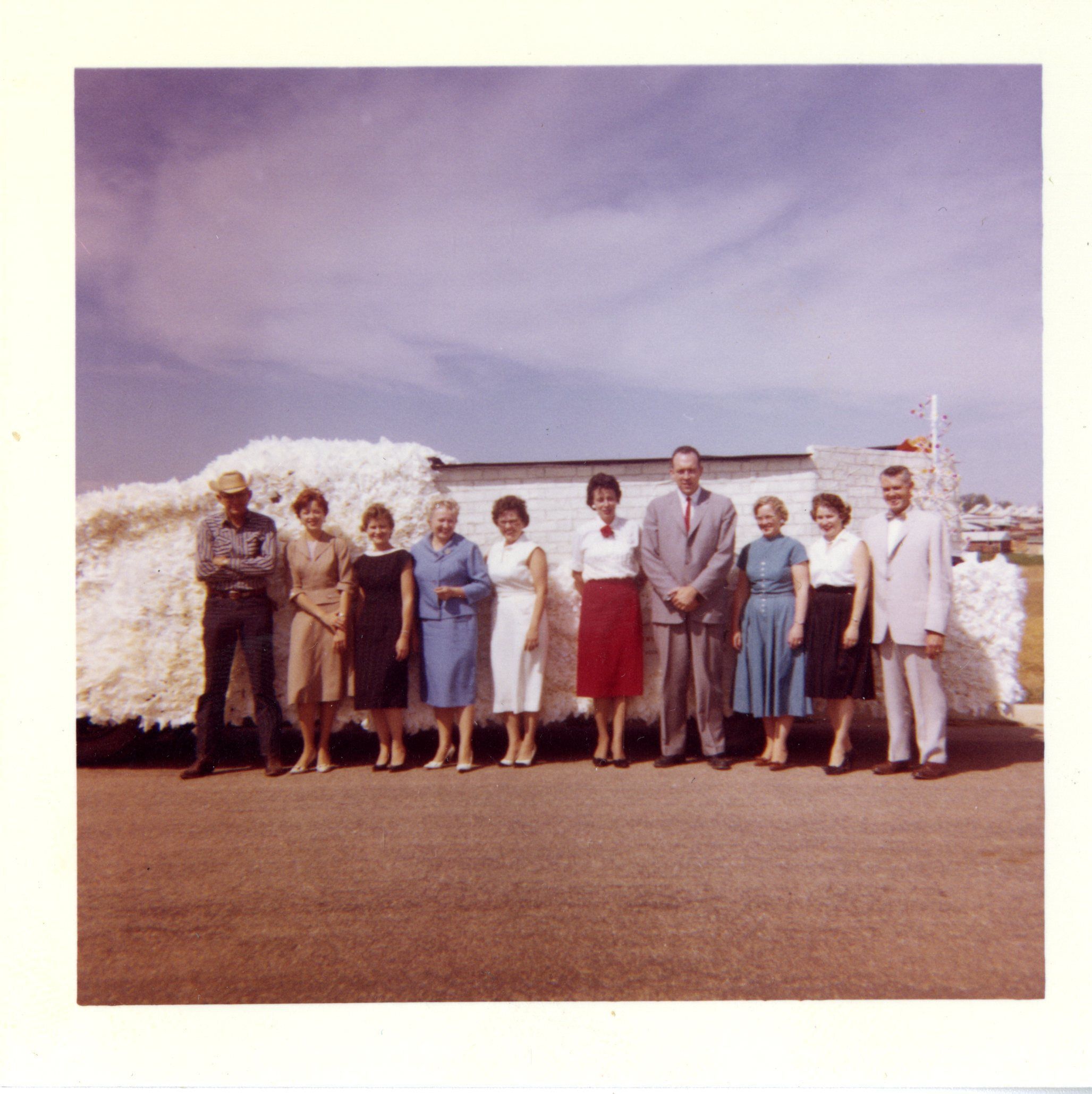 A group of 10 people standing alongside the float. Tractor driver, two men in suits. Broomfield Heights Bank. Man towards the center is "Doc" Pheifer (possibly, spelling is also uncertain).