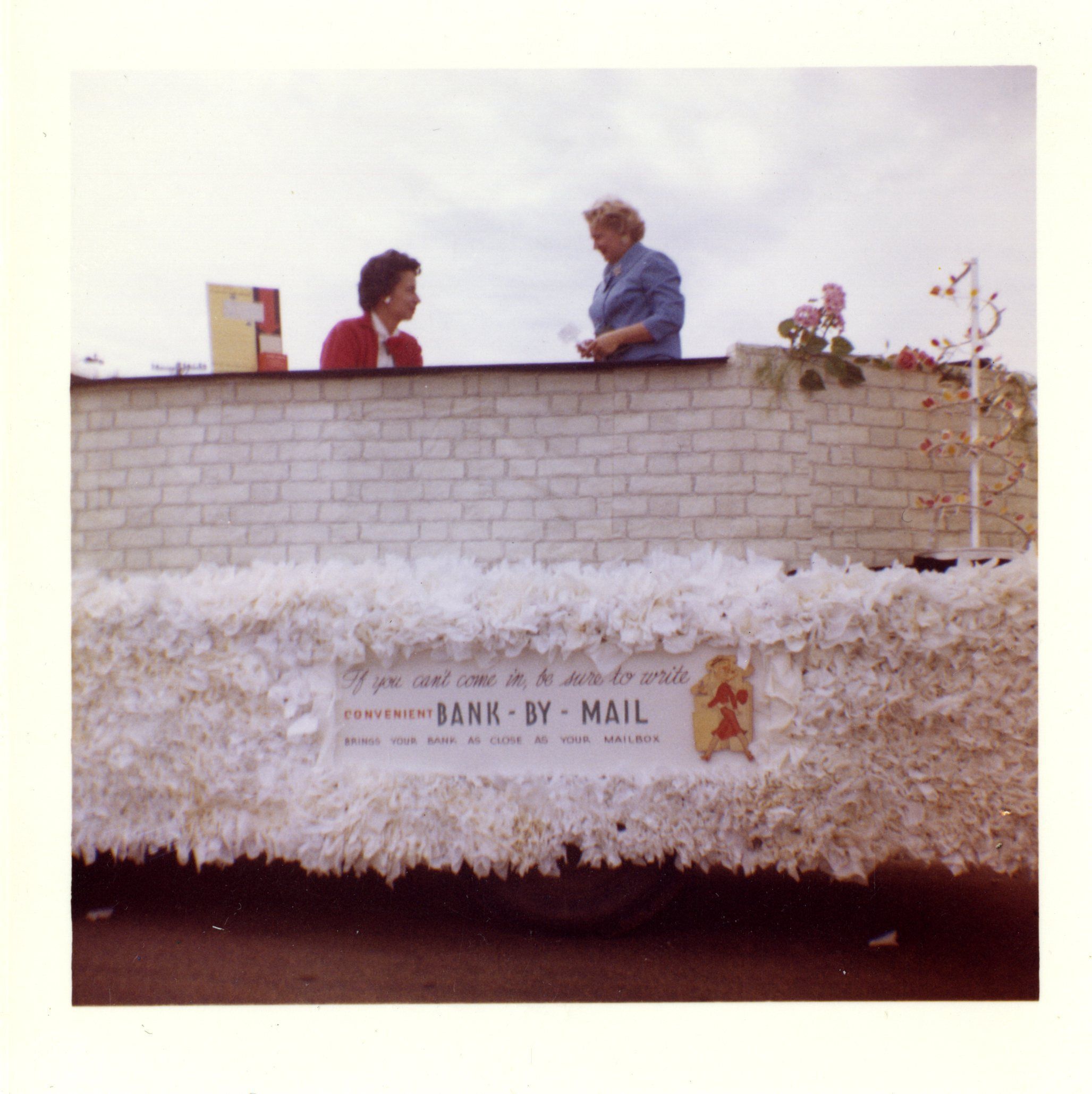 Two ladies standing at the top of the float. Broomfield Heights Bank. Sign on float says "If you can't come in, be sure to write, convenient Bank by Mail".