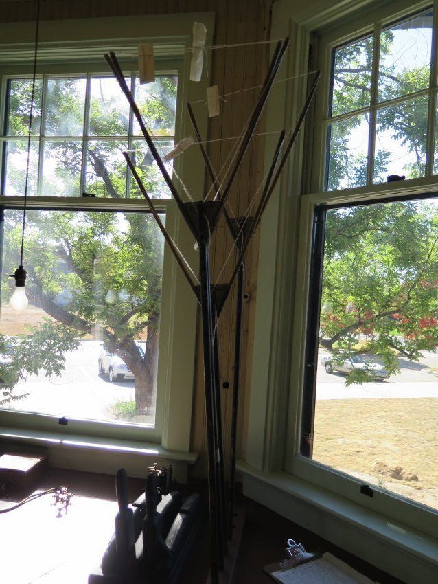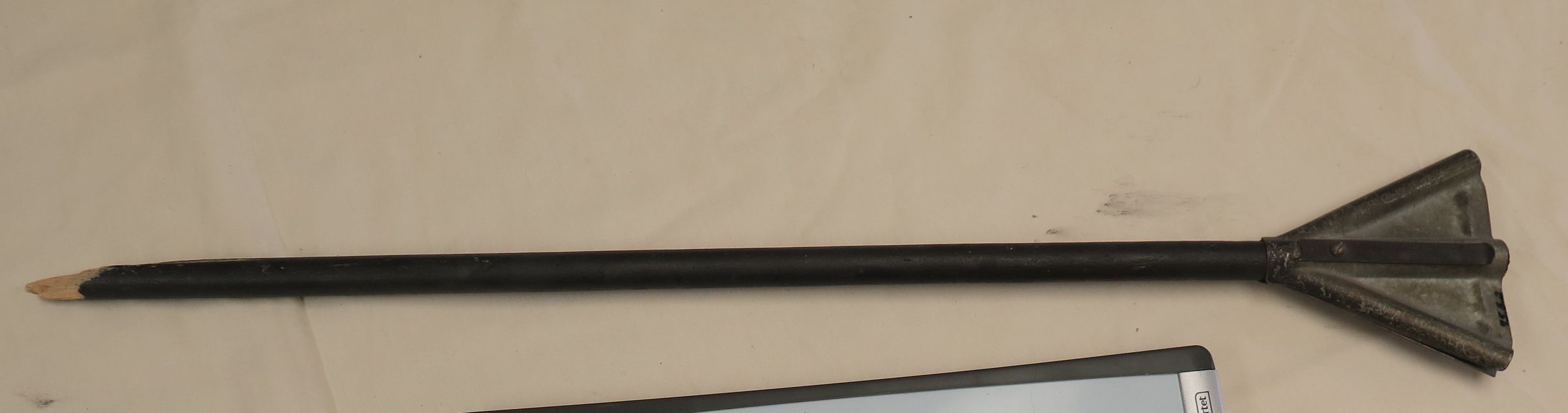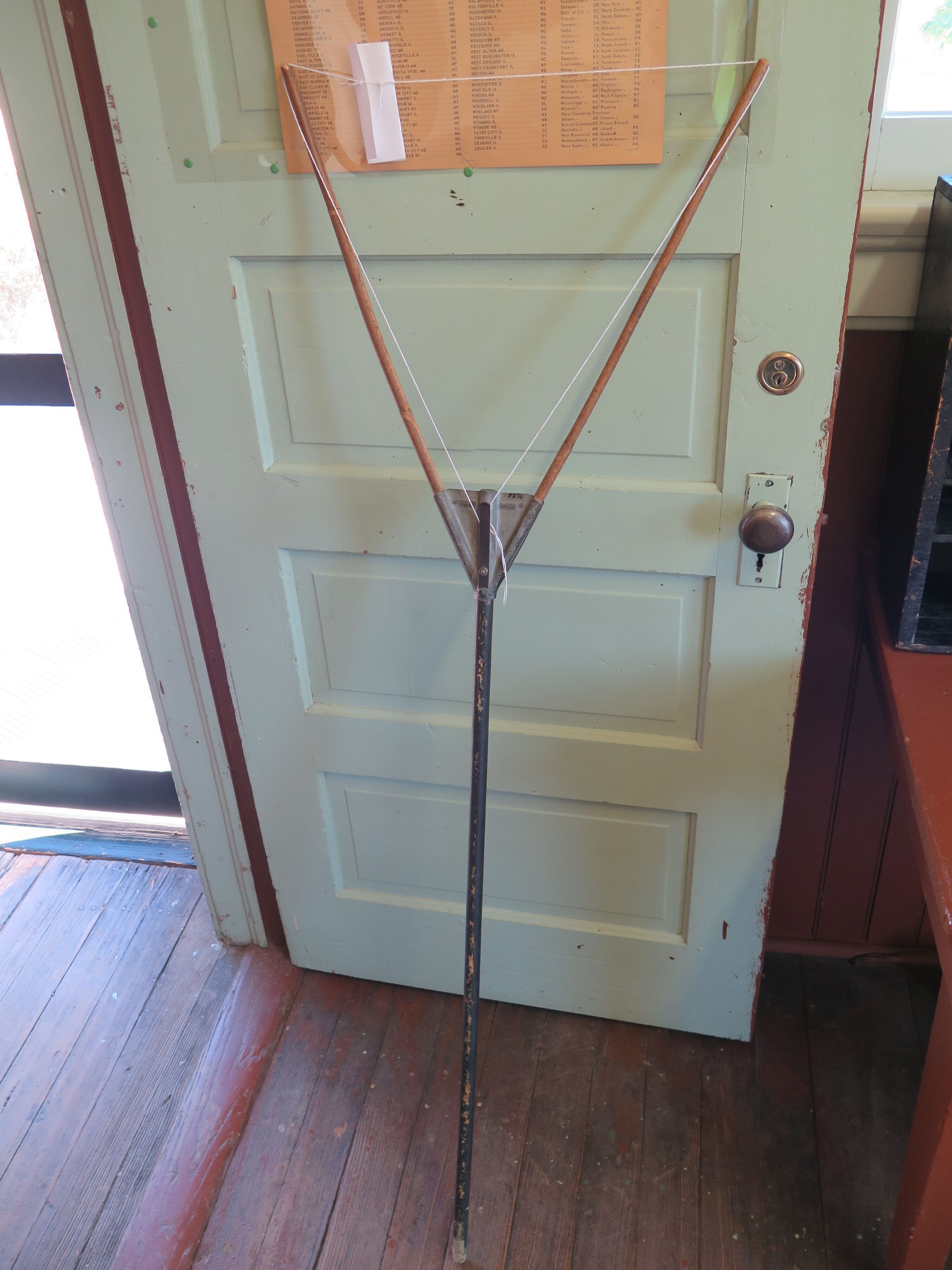 This is a set of 5 wooden train message forks. 1 fork is broken and stored in TB 103 in the basement of the Depot. The Ys are made of 2 tan wood rods attached to a metal Y, which holds the fork onto the black painted handle. On the metal string holder of 2 of the Ys is the text, "THE HI-SPEED DELY./ FORK CO./ SHELBYVILLE IND./ U.S. PAT. 1.902.669-CAN. PAT. 347483." One the metal of one of the Ys is different text, but it cannot be read. The Ys each measure 56" (h) x 18" (w) x 1" (d).