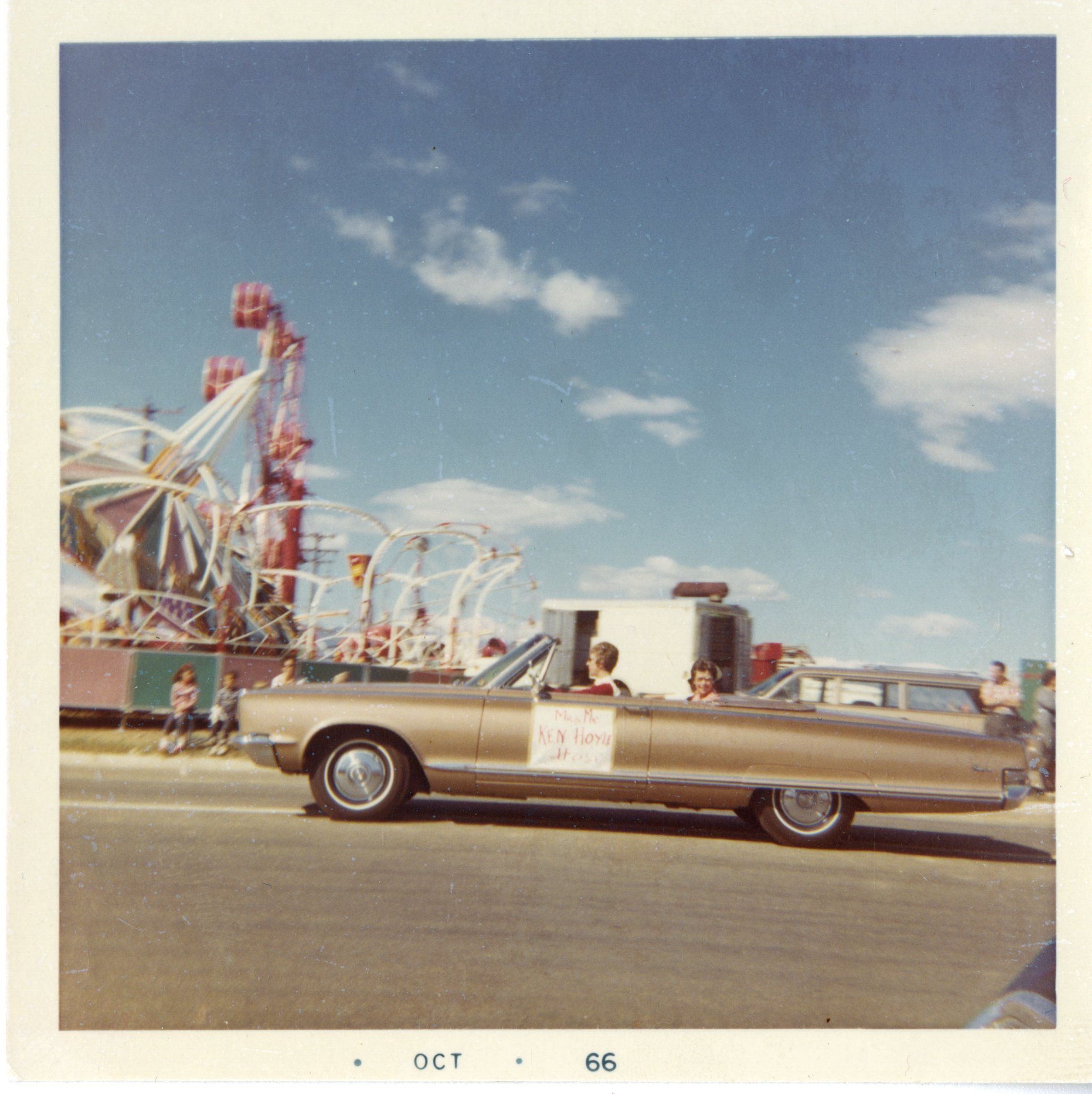 A lady driving a car with the top down. Possibly in a parade. People watching from the sidewalks. Carnival rides. Sign on car says Ken Hoyle