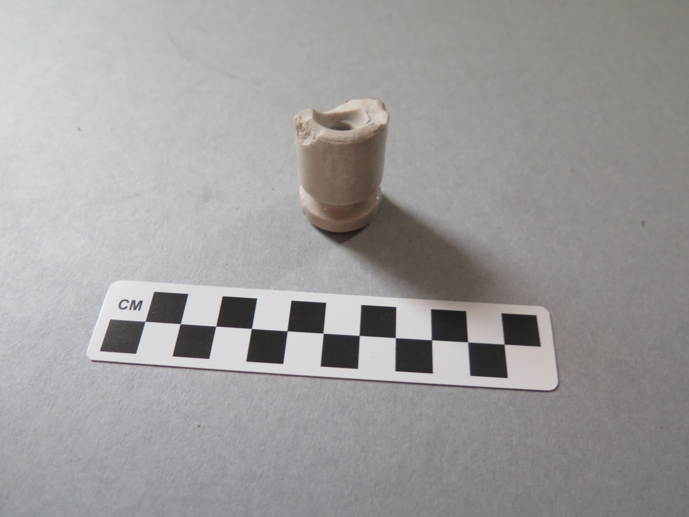 This is a white ceramic insulator. The end of the insulator is broken, leaving a jagged edge on one side. The insulator measures 1.5" (h) x 1" (diam).