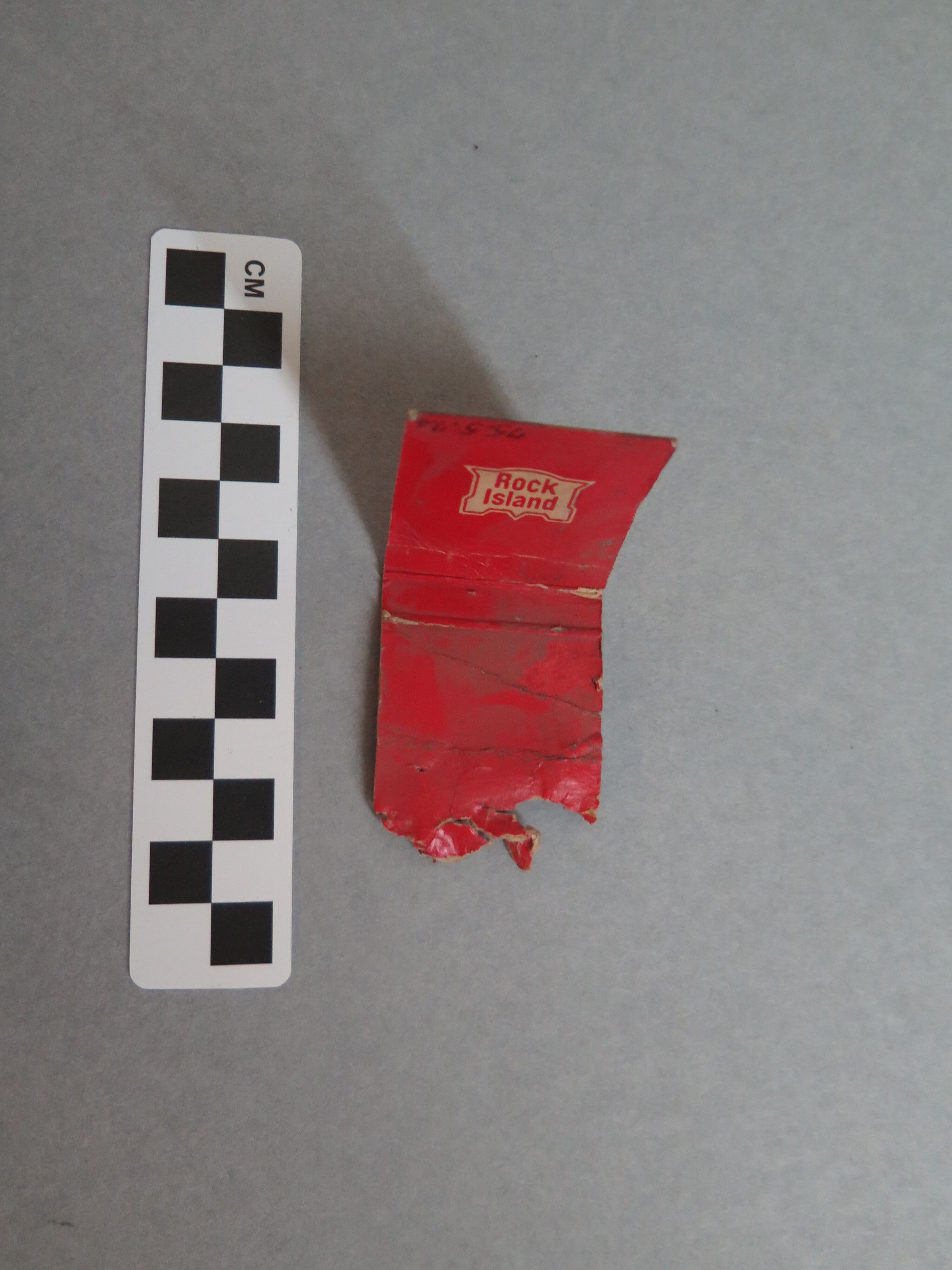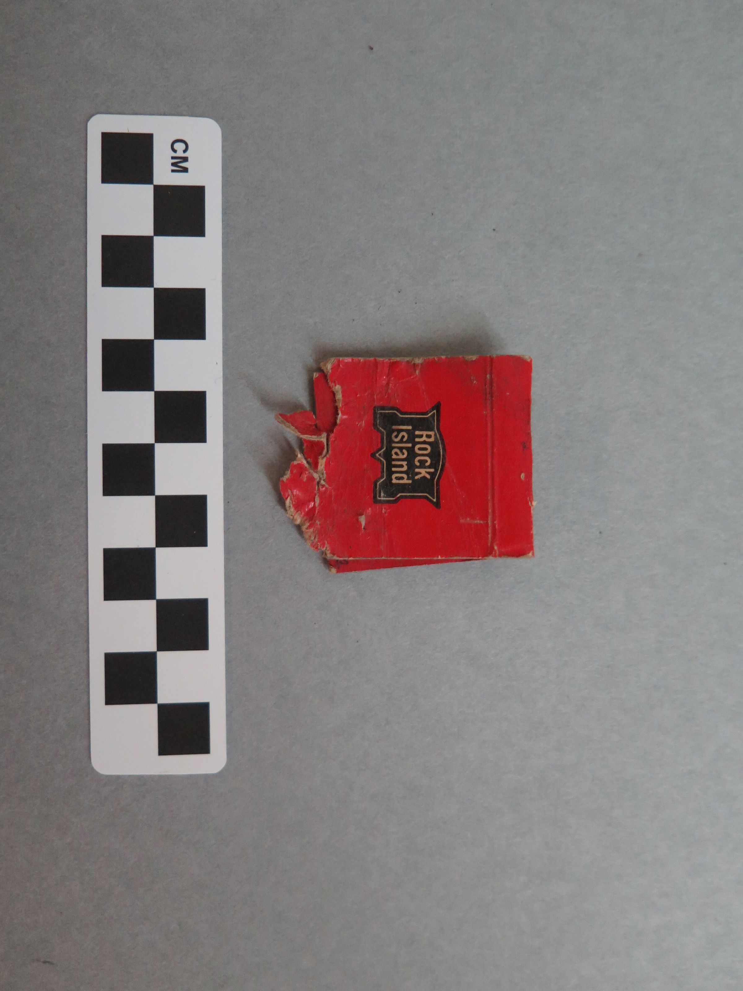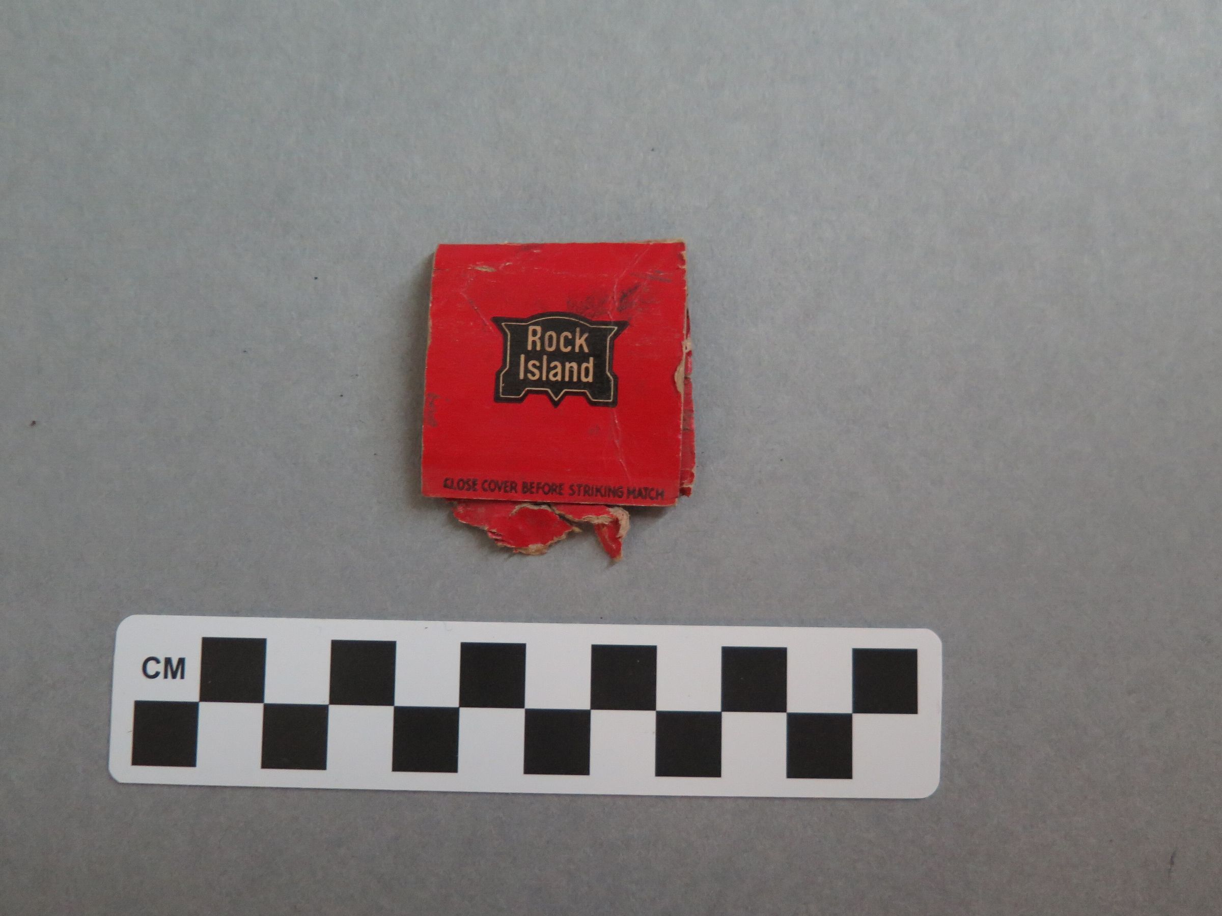 This is a cardboard matchbook. The matchbook is red with the Rock Island logo on either side. On the bottom of one side of the matchbook, the text "CLOSE COVER BEFORE STRIKING MATCH" is printed in black ink. The other side of the matchbook is torn on the bottom, with the whole strike plate missing. The inside of the matchbook has the Rock Island logo on the top. There are no matches remaining in the matchbook. The matchbook measures 1.5" (w) x 2" (l).