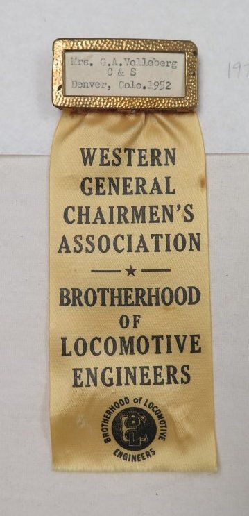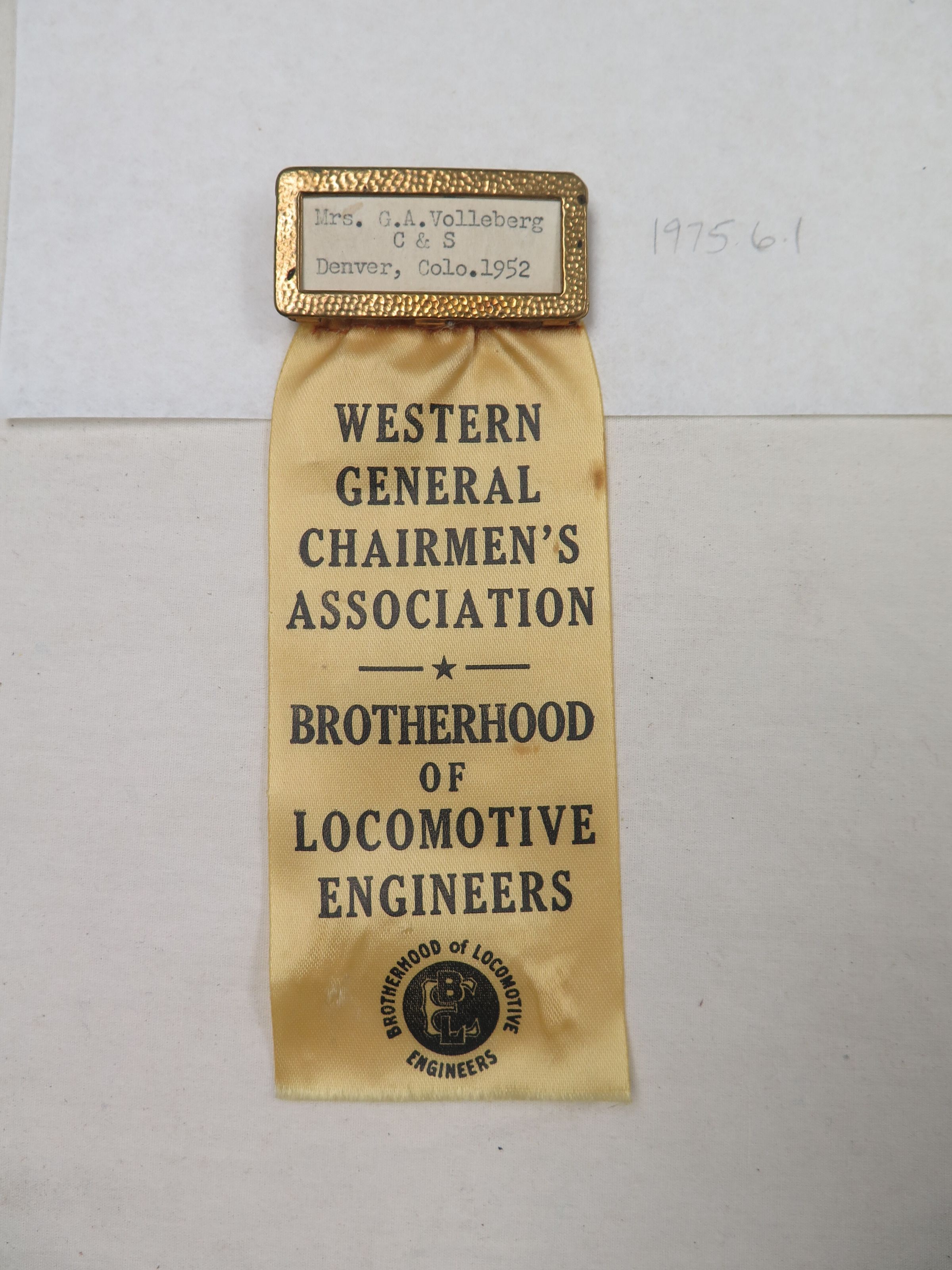 This is a yellow ribbon with black lettering affixed to a name badge for "Mrs. G.A. Volleberg, C&S Denver, Colo. 1952" The ribbon reads, "Western General Chairman's Association, Brotherhood of Locomotive Engineers." The ribbon measures 2.25" (w) x 6" (l).Collection