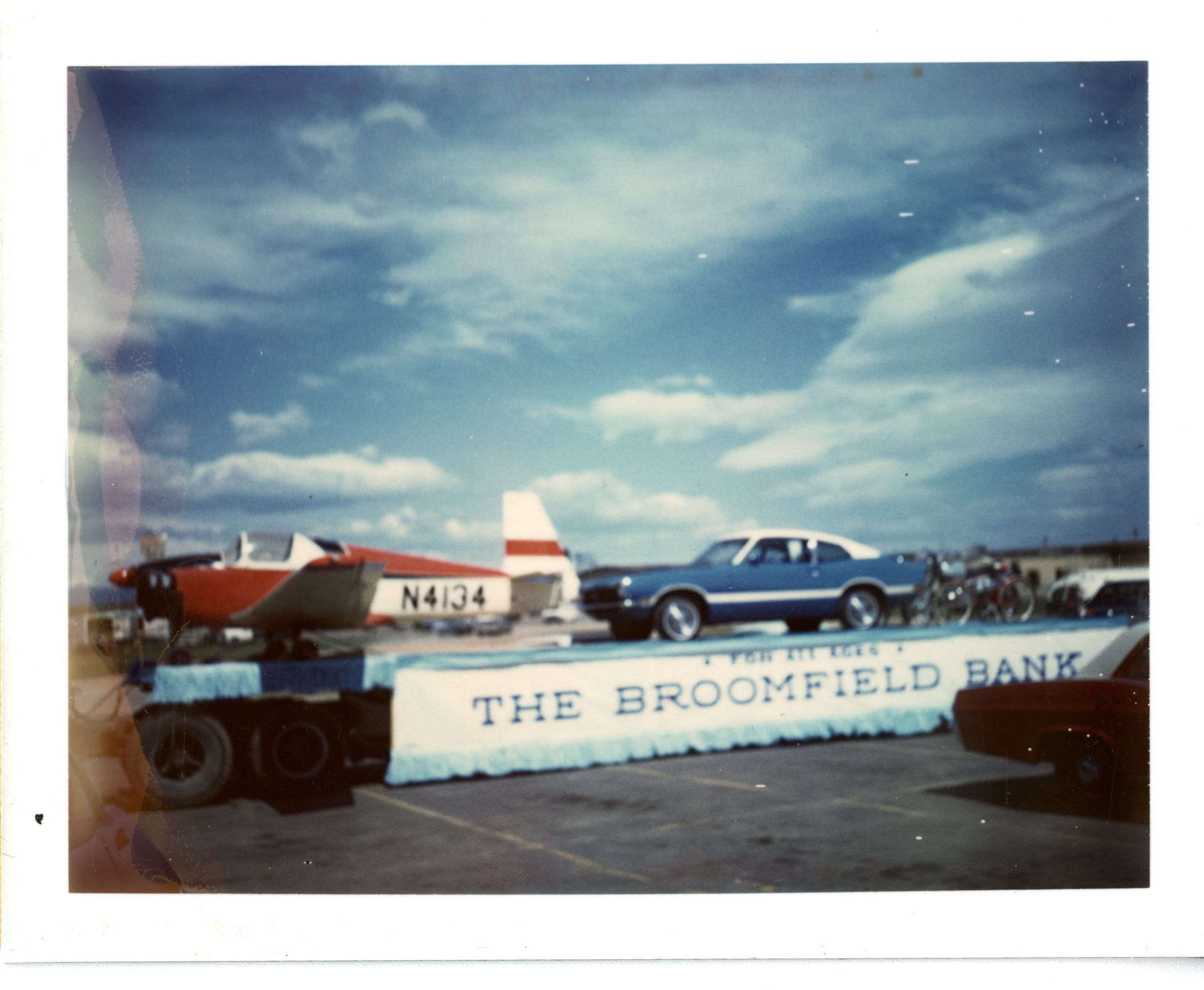 The Broomfield Bank Float with a car placed on top. A older small airplane is parked next to it. Garden Center parking lot?
