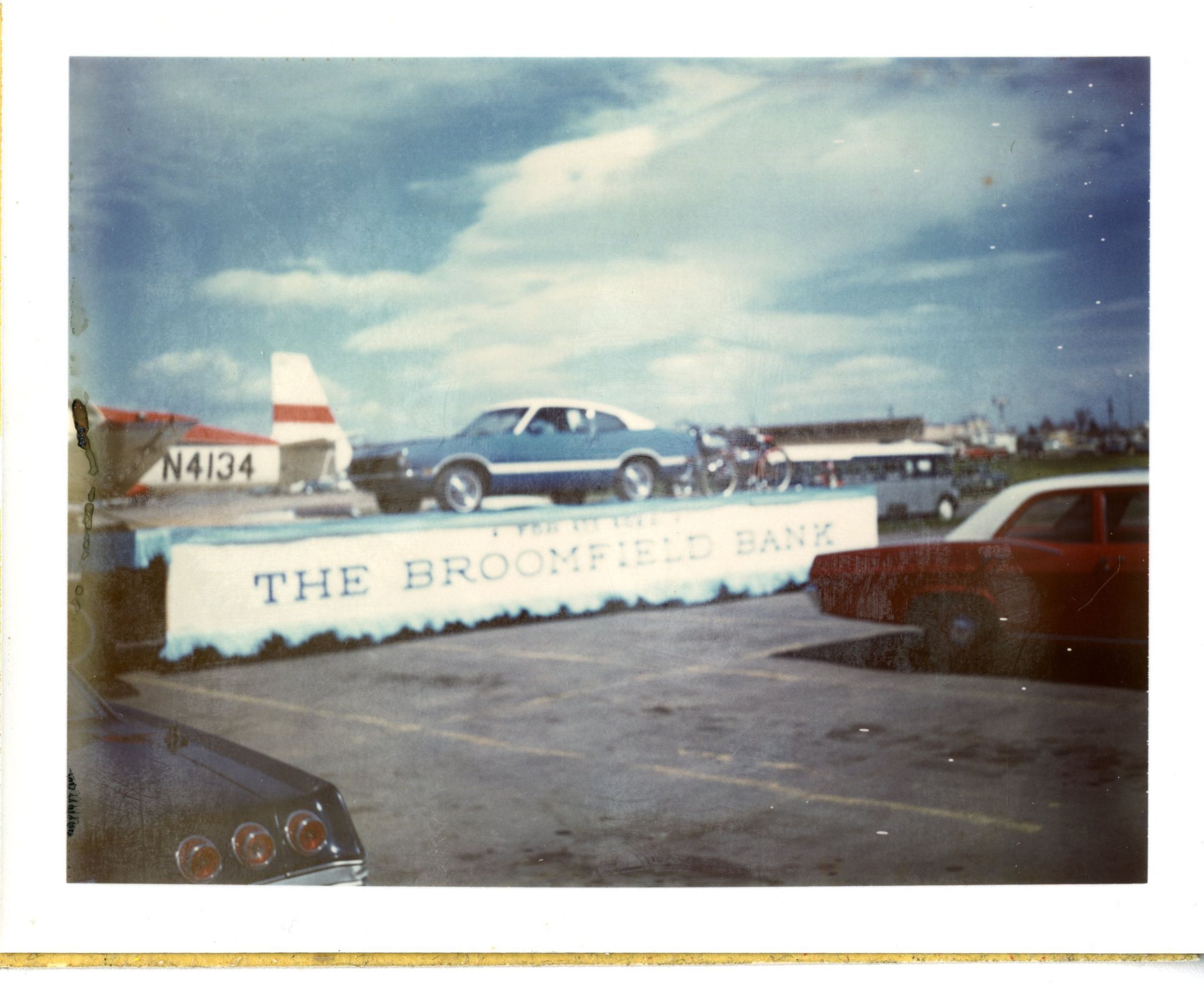 The Broomfield Bank Float showing a car placed on the float. A small early era airplane is parked next to the float. Garden Center parking lot?