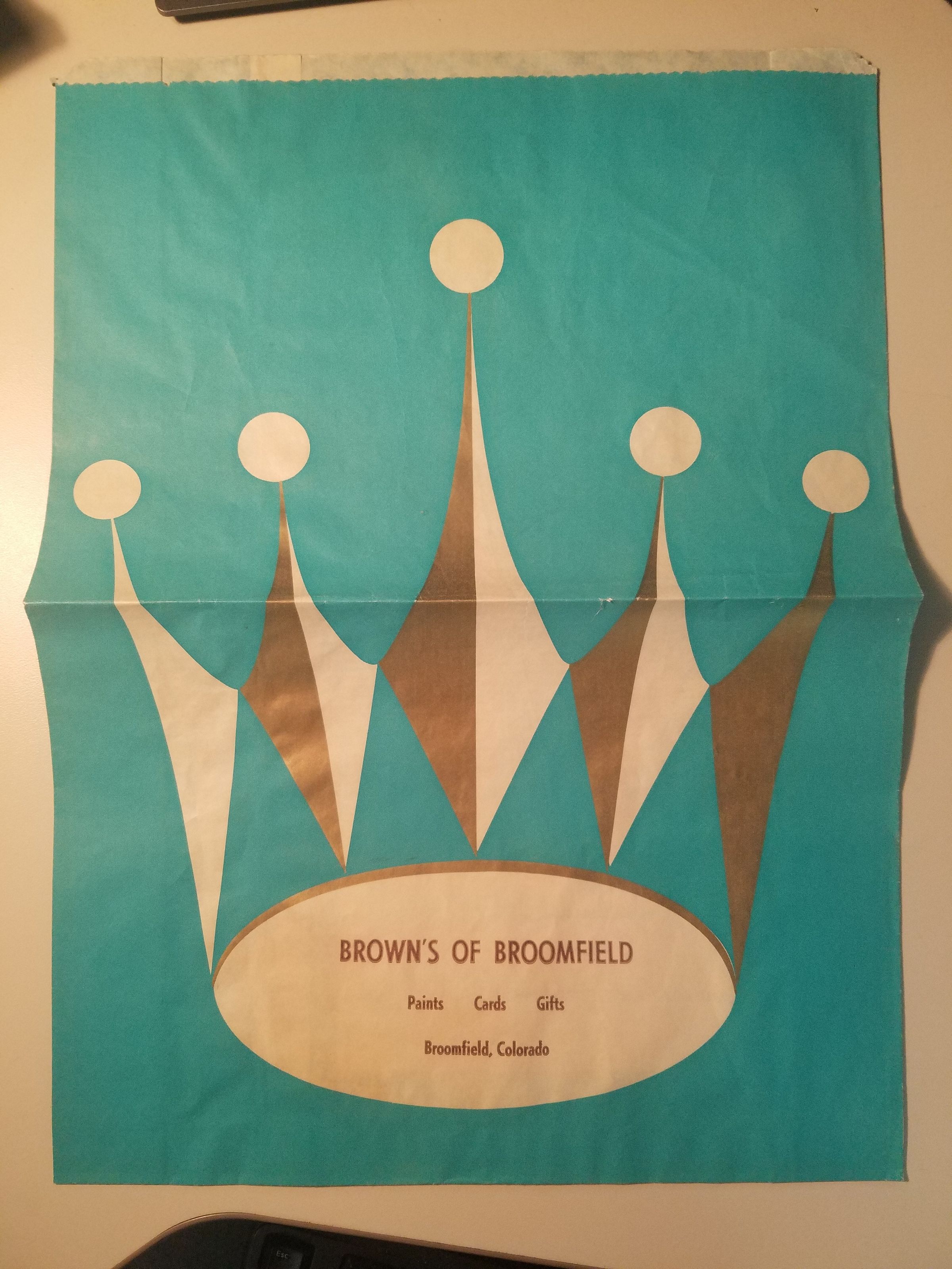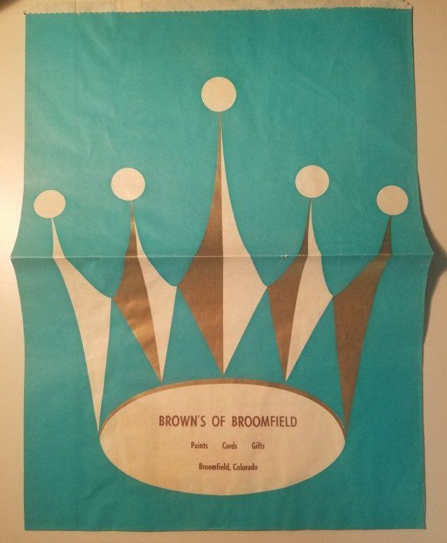 1 paper bag imprinted for business "Brown's of Broomfield" decorated with a large crown, and verbage on the back. On the front it reads "BROWN'S OF BROOMFIELD / Paints Cards Gifts / Broomfield, Colorado"Collection