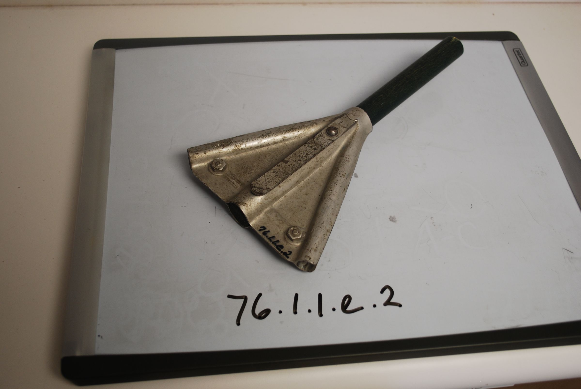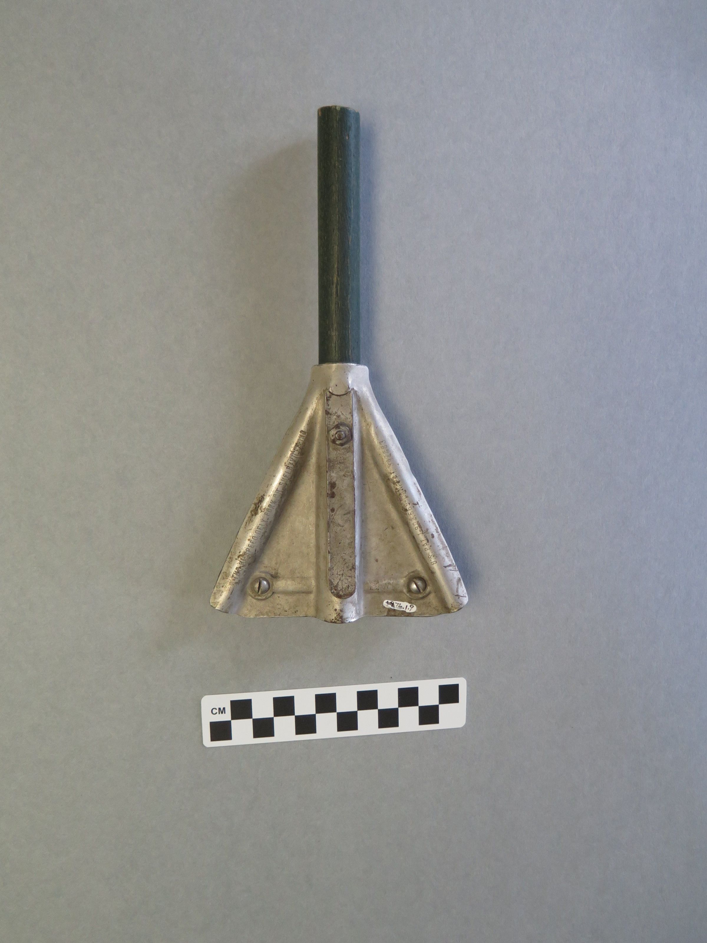 This is part of a train message hoop. The rest of the wood has been cut or broken off. The hoop or train Y is composed of wood and metal. It is from the Broomfield Station Depot. It was patented in 1935. The hoop fragment measures 9" (h) x 5" (w) x 1" (d).