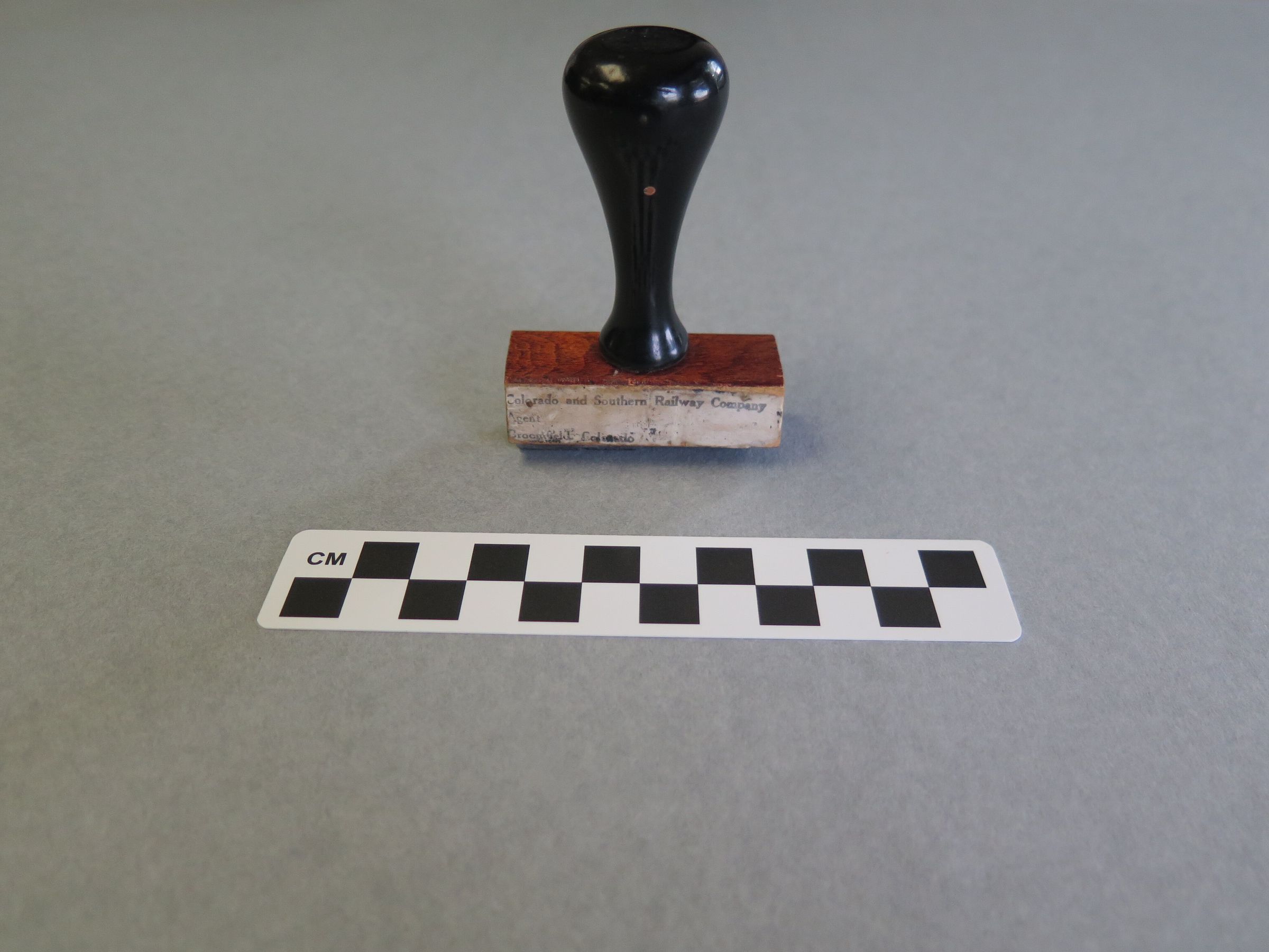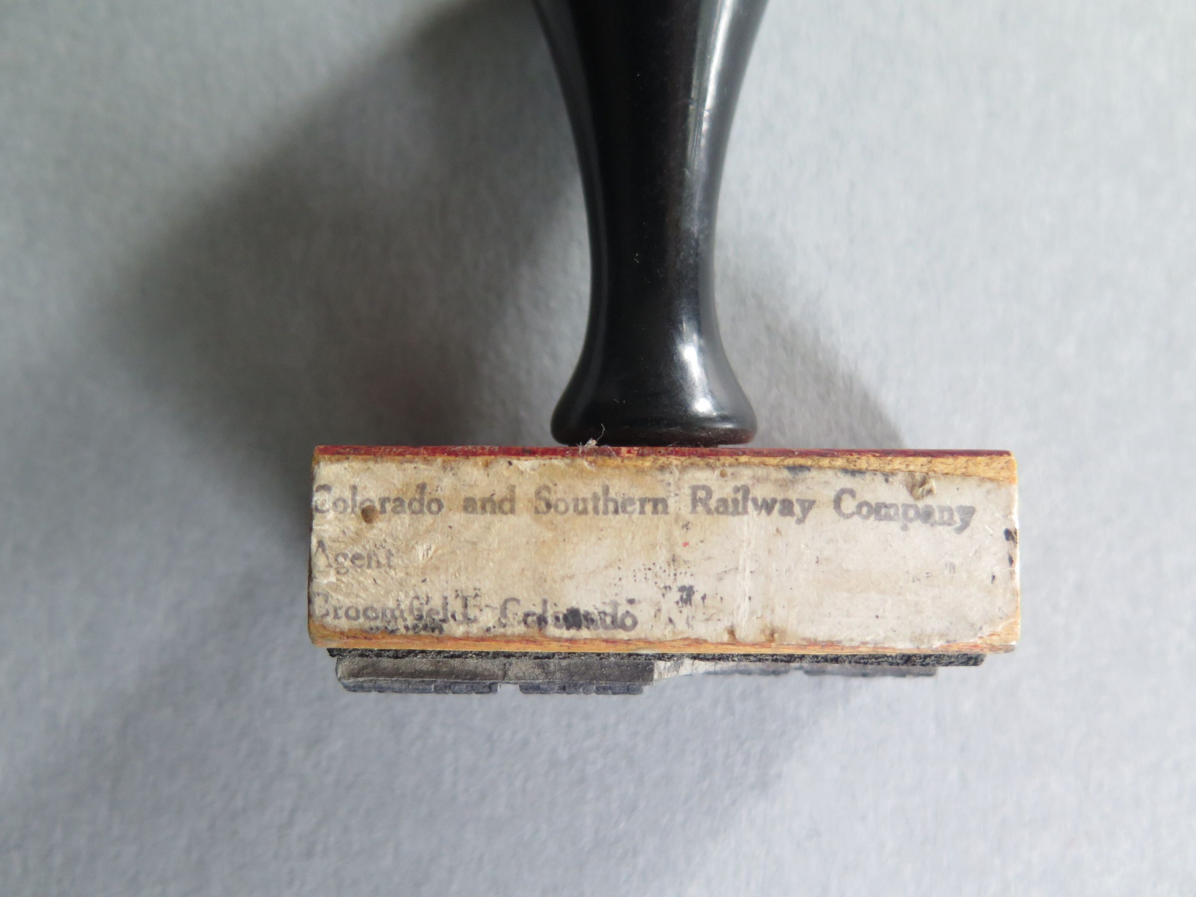 This rubber stamp has a wood base and a black wood handle. The stamp was used in the Broomfield Depot. The text on the stamp: "Colorado and Southern Railway Company /Agent /Broomfield, Colorado." The stamp measures 3" (h) x 2" (w) x 0.75" (d).