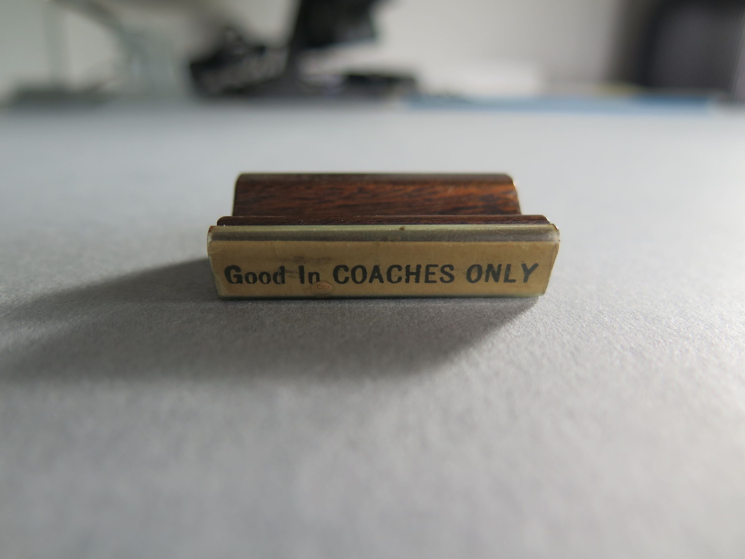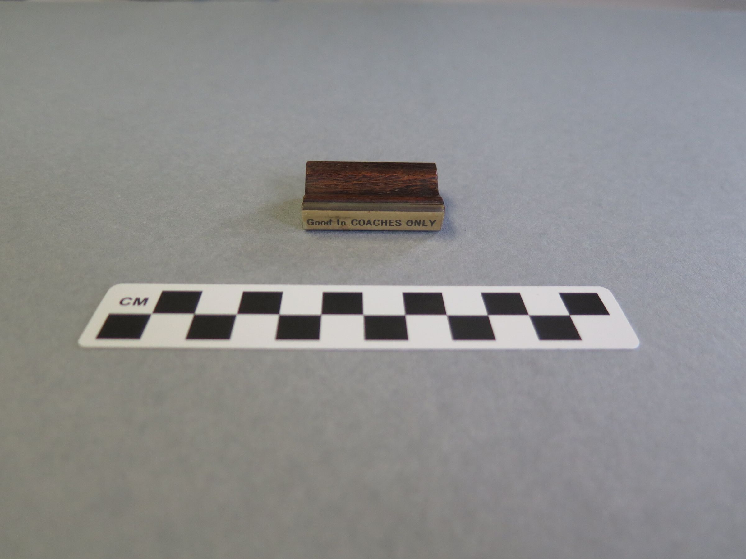 Rubber stamp on wood base from the Broomfield Depot. Text says: "Good in COACHES ONLY." The stamp measures 1.5" (h) x 1.5" (w) x 0.5" (d).