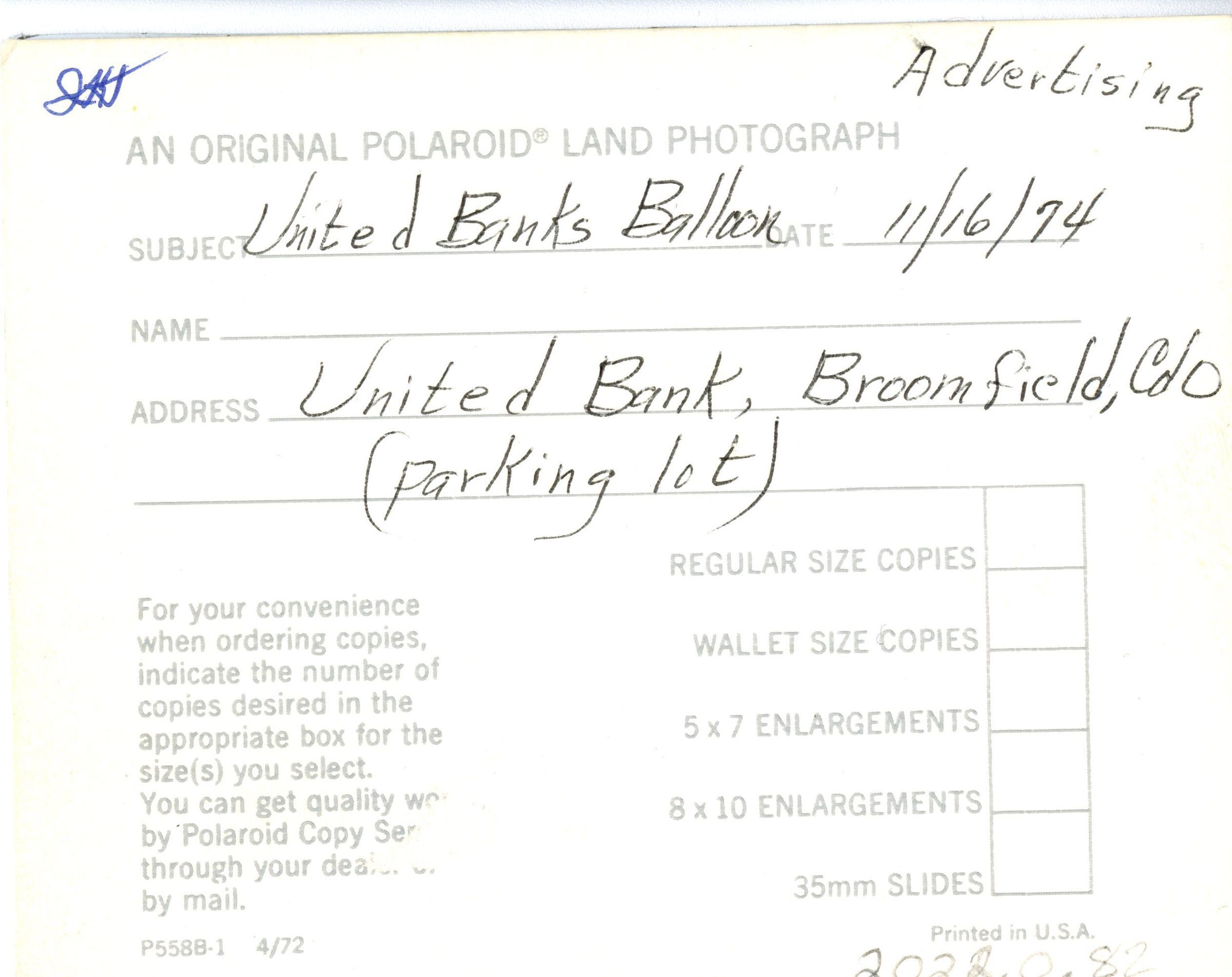 Color polaroid land photograph of United Bank's Balloon in the United Bank parking lot, Garden Center. Cars in foreground. Balloon rides. Balloon is blue and white with United Bank logo.