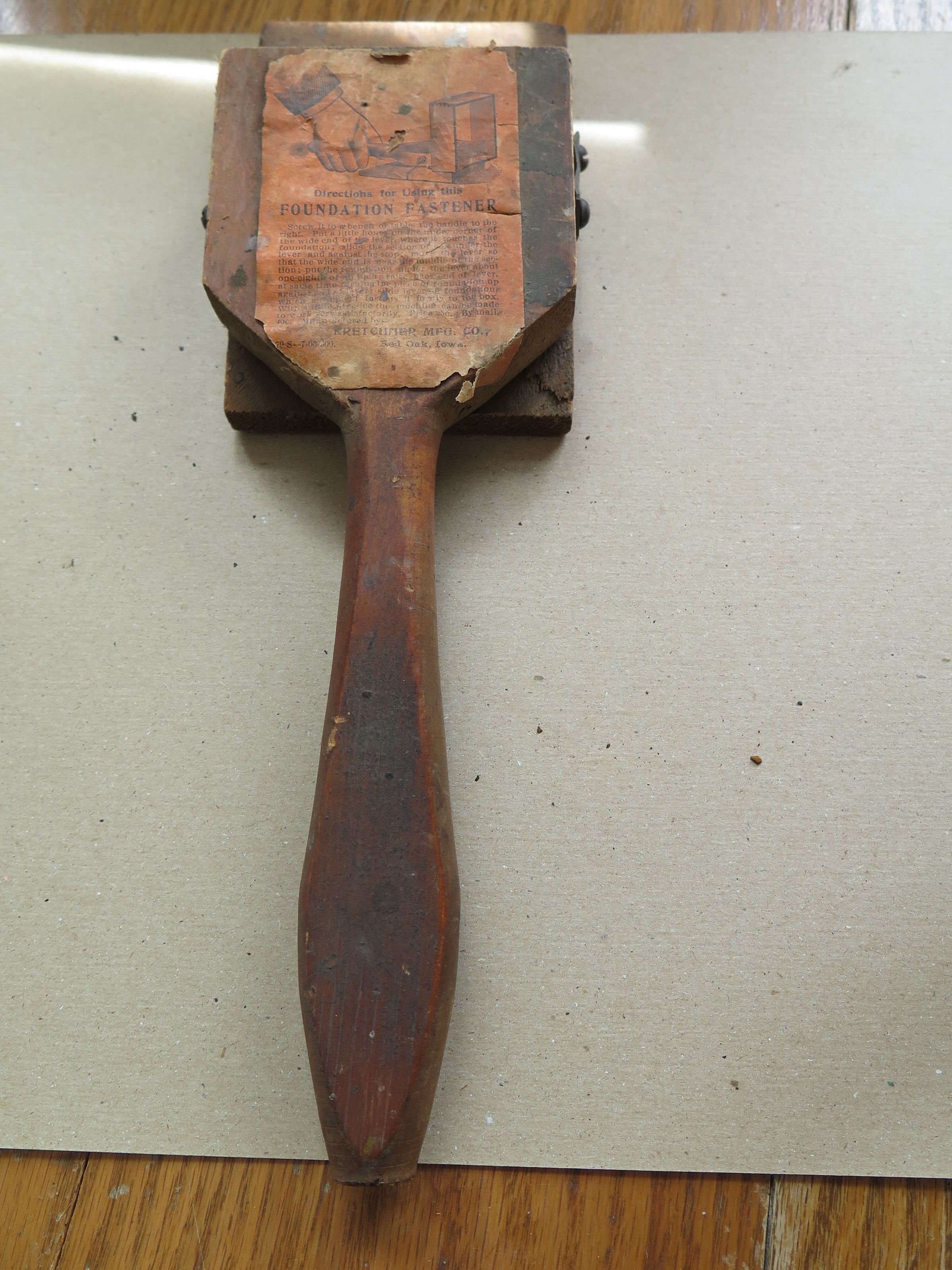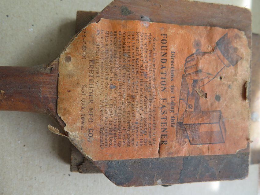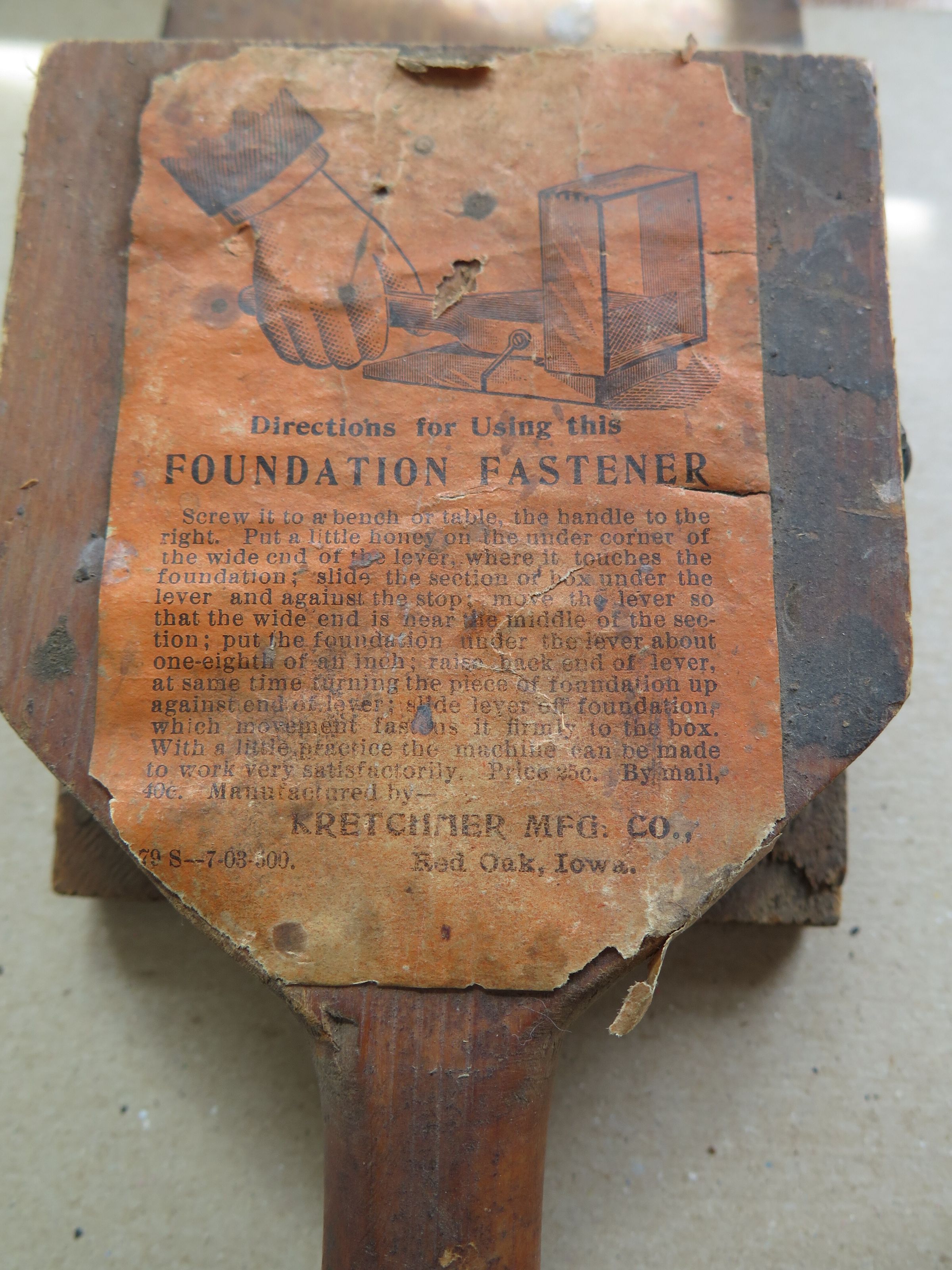 This is a wooden honeycomb box foundation fastener. It is made from two blocks of wood, one made with a handle. The blocks are connected with a piece of metal that loops around both. The label reads "Kretchmer mfg co. Red Oak, Iowa." The fastener measures 2" (h) x 11" (l) x 3.75" (w).Collection