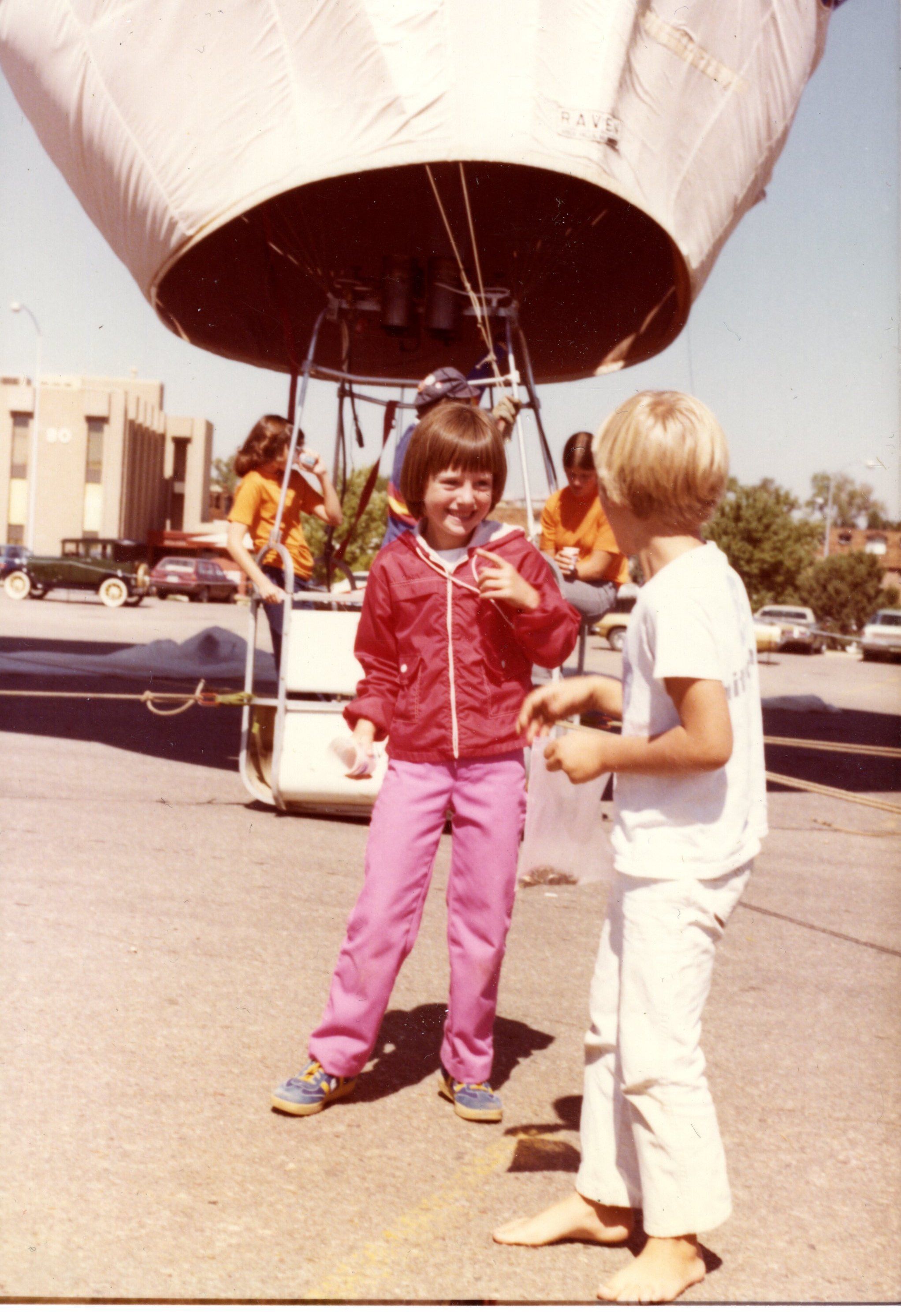 Color picture of United Bank hot air balloon basket with kids standing in front of and in basket in Garden Center parking lot.