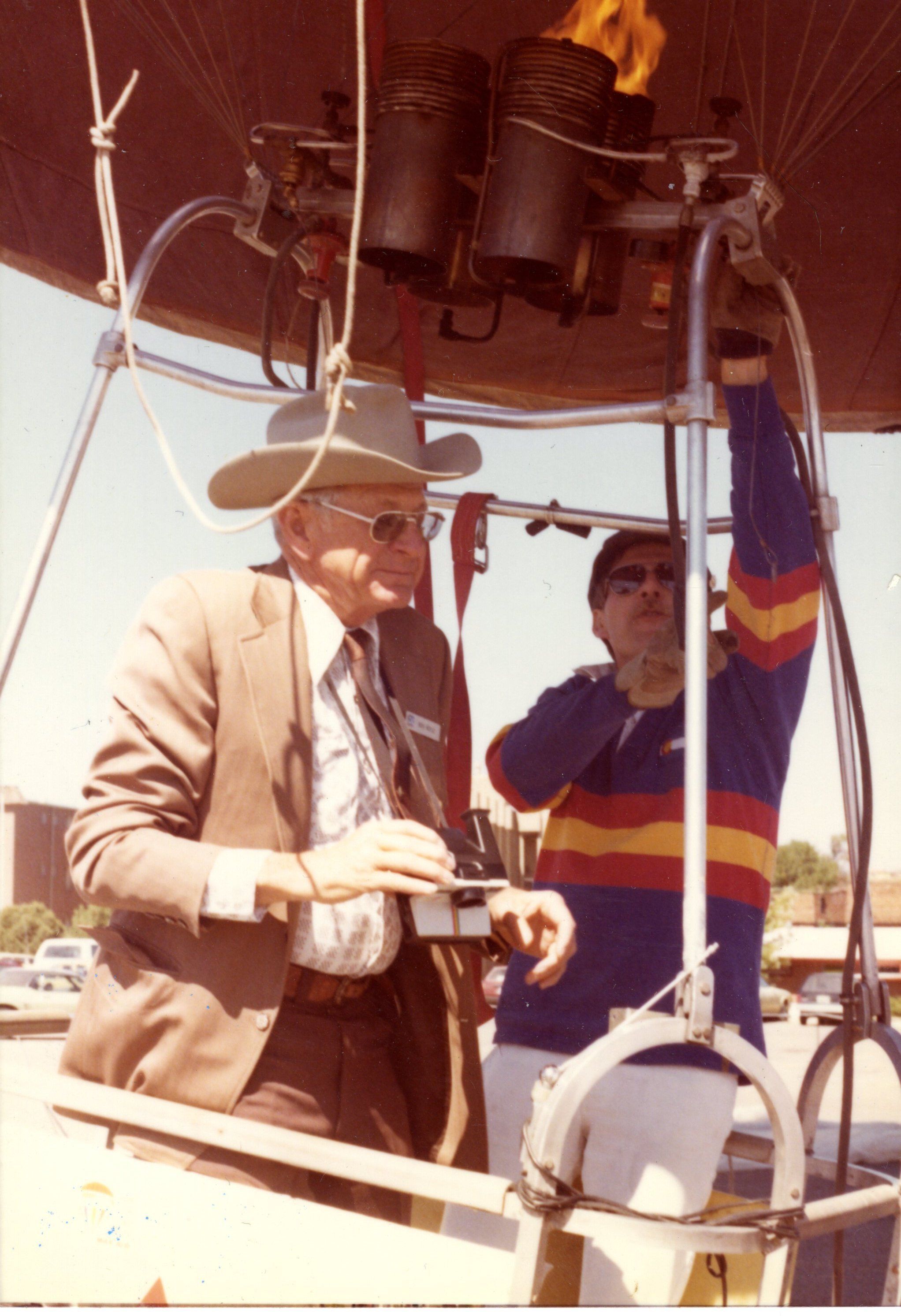 Color photo of United Bank hot air balloon basket. One man in basket dressed in suit jacket and hat, the other man is the operator. Garden Center parking lot.