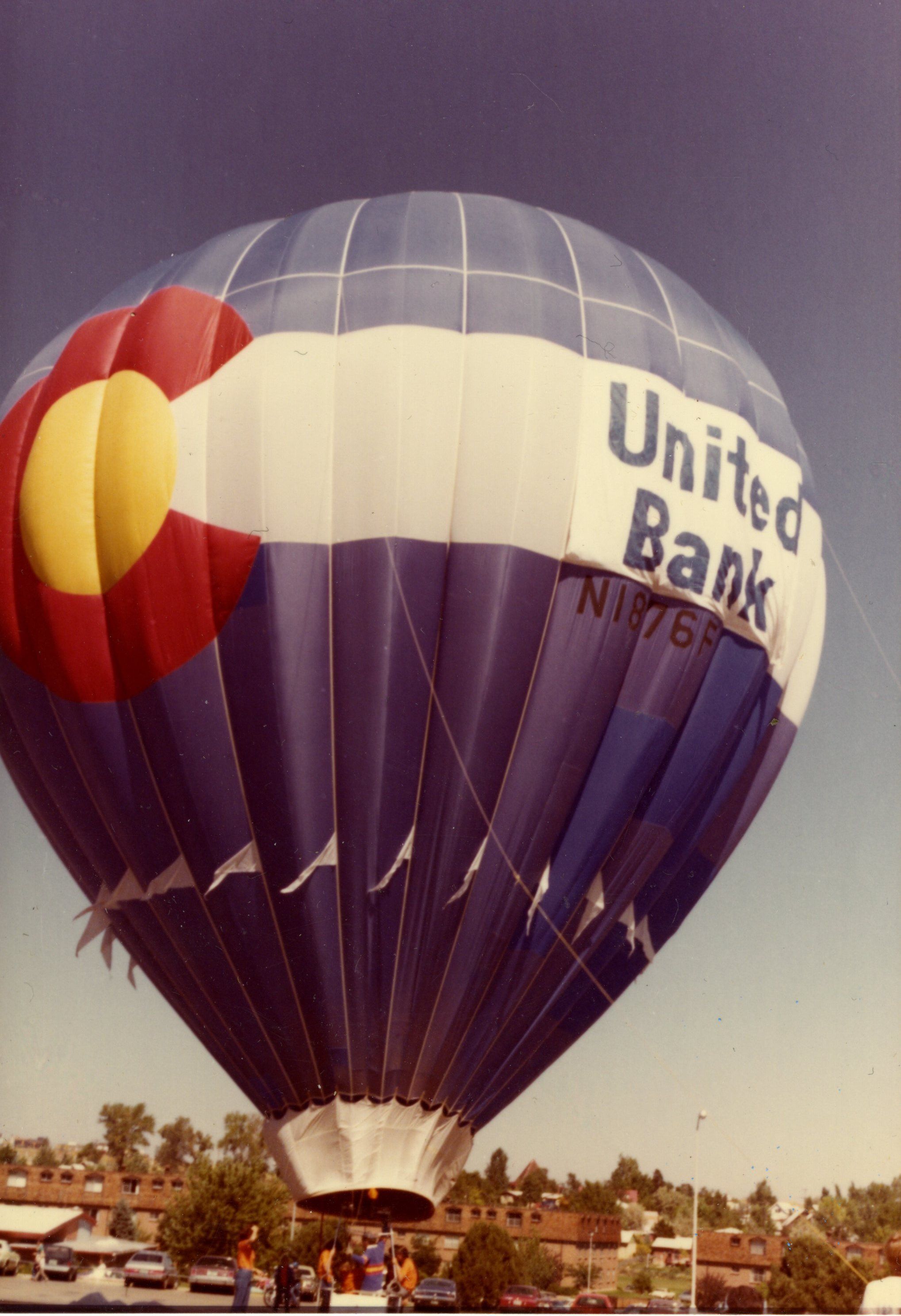 Color picture of United Bank hot air balloon in United Bank, Garden Center parking lot. Balloon is blue and white with United Bank and Colorado "C" logo.