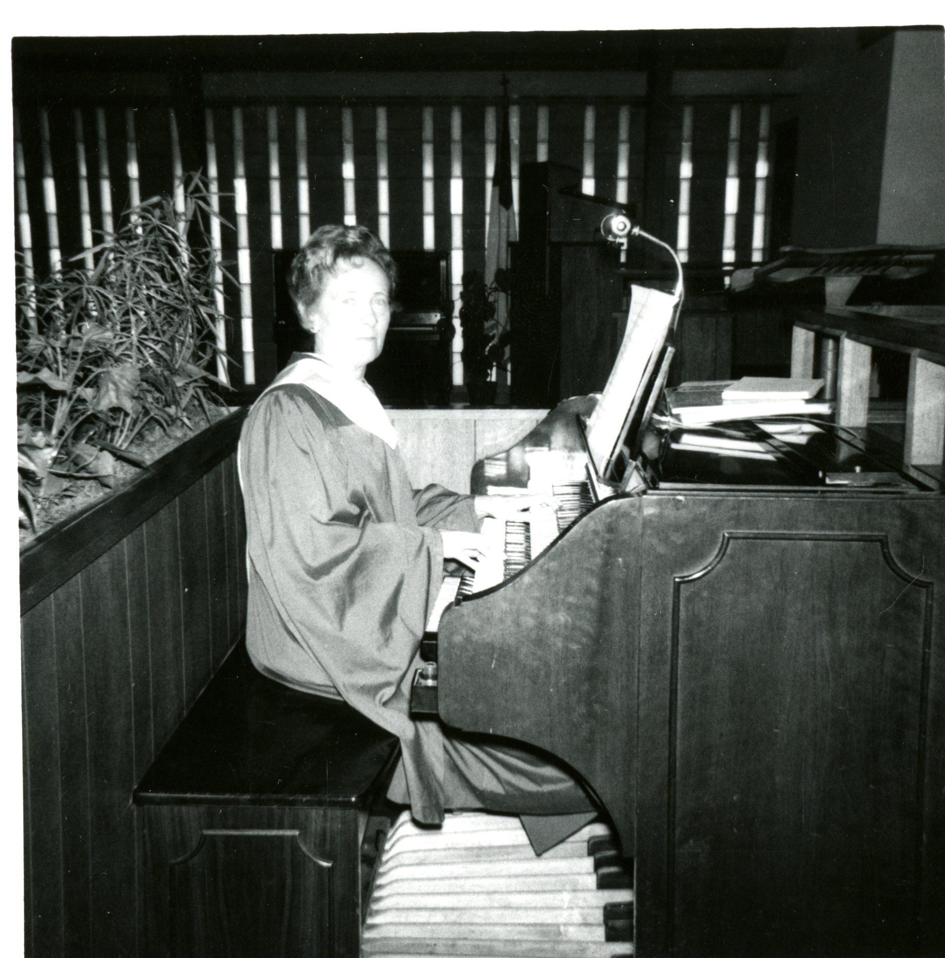 Black and white photo of woman in recital gown playing organ. Photo came with Broomfield Bank photos.