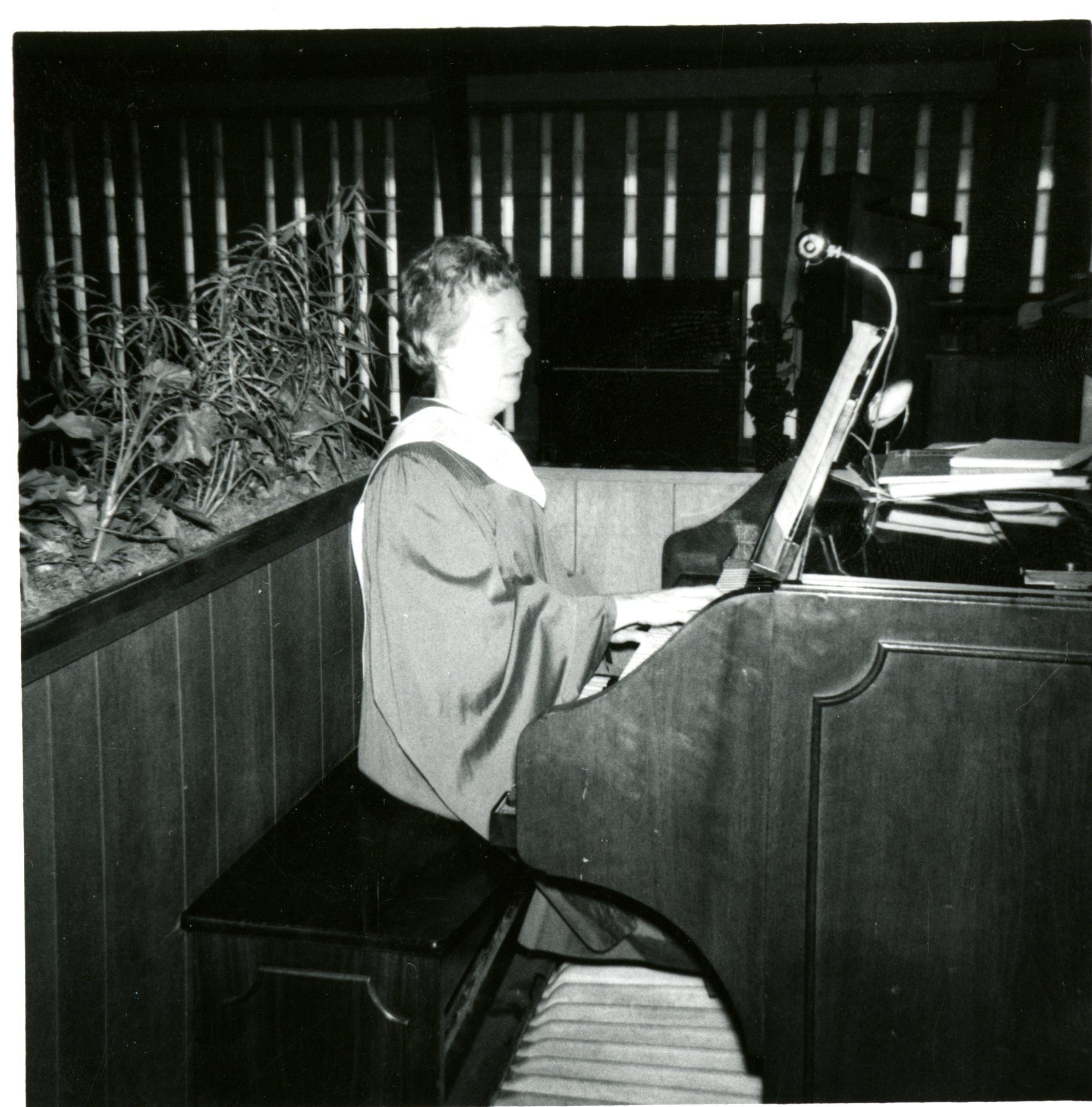 Black and white photo of woman in recital gown playing organ. Came with Broomfield Bank photo.
