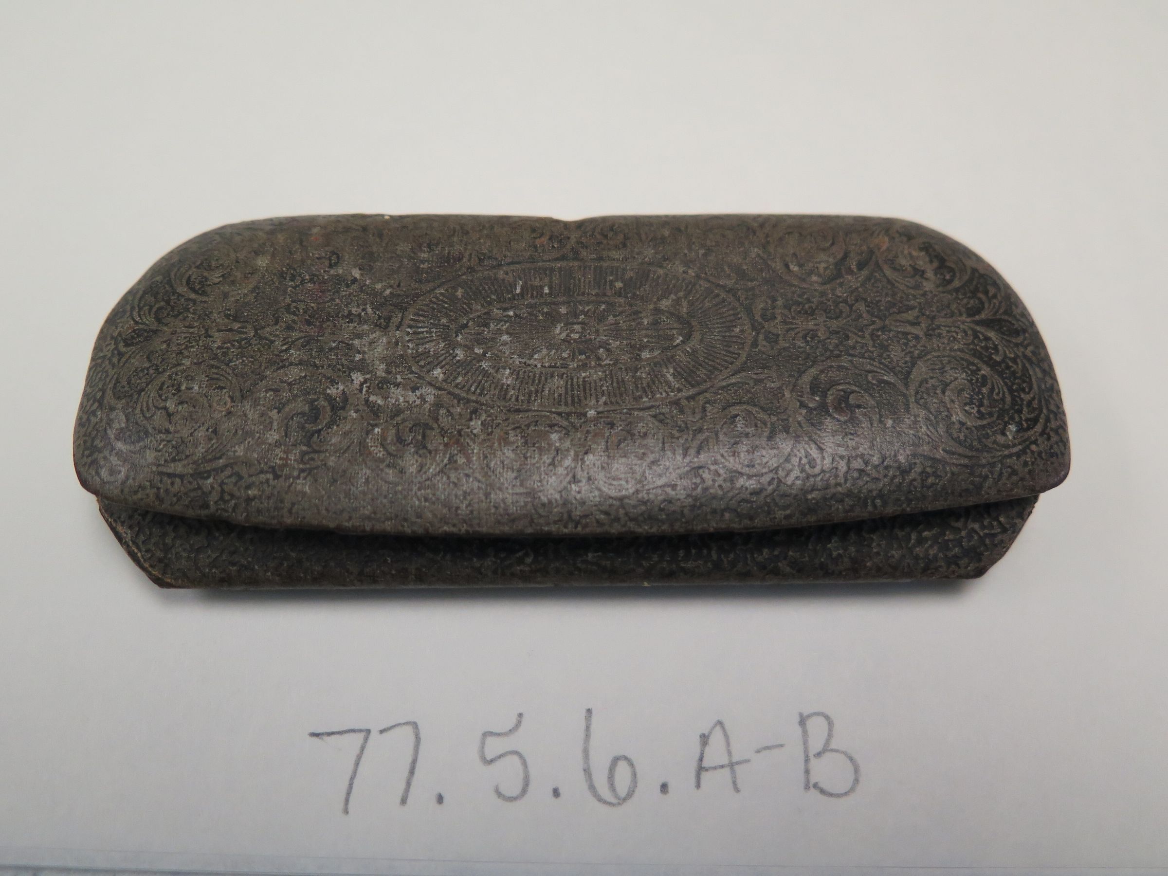 This is a black leather covered eyeglass case. The case has a pattern on the outside that looks like paisley. Inside of the case is a pair of eyeglasses (1977.5.6a). The case measures 0.25" (h) x 5.25" (w) x 2.25" (l).