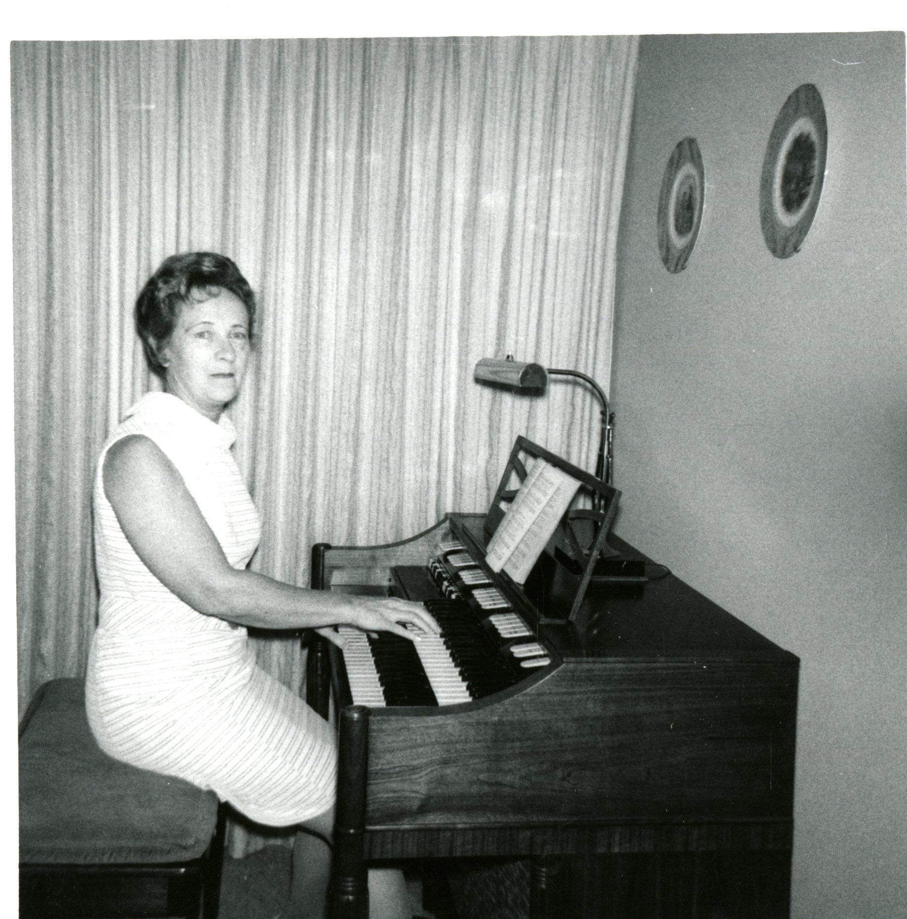 Black and white photo of woman sitting at organ in dress. Came with Broomfield Bank photos.