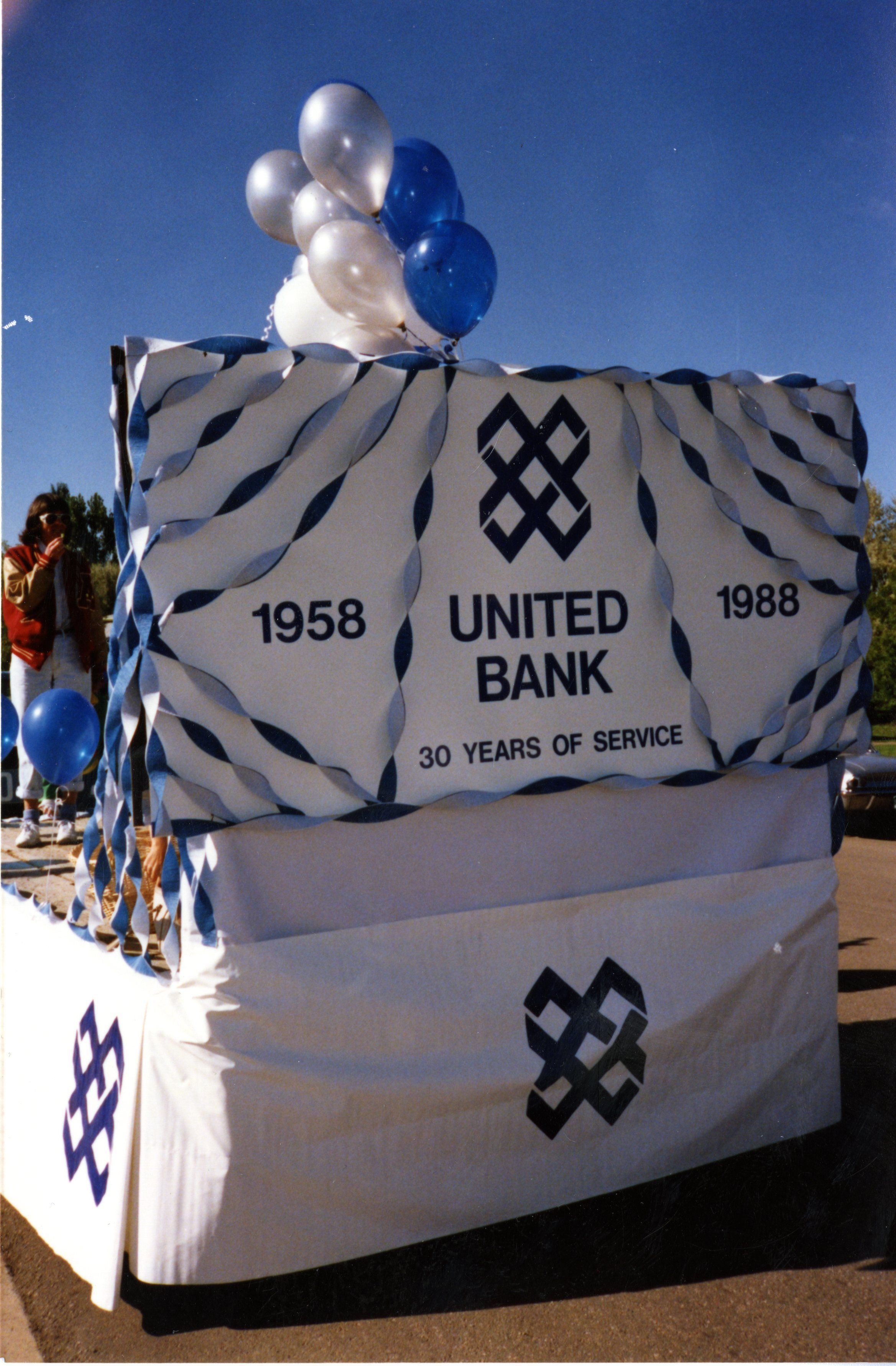 Color photo of United Bank float. Reads 1958, United Bank 30 years of service, 1988. Possibly Broomfield Days parade.