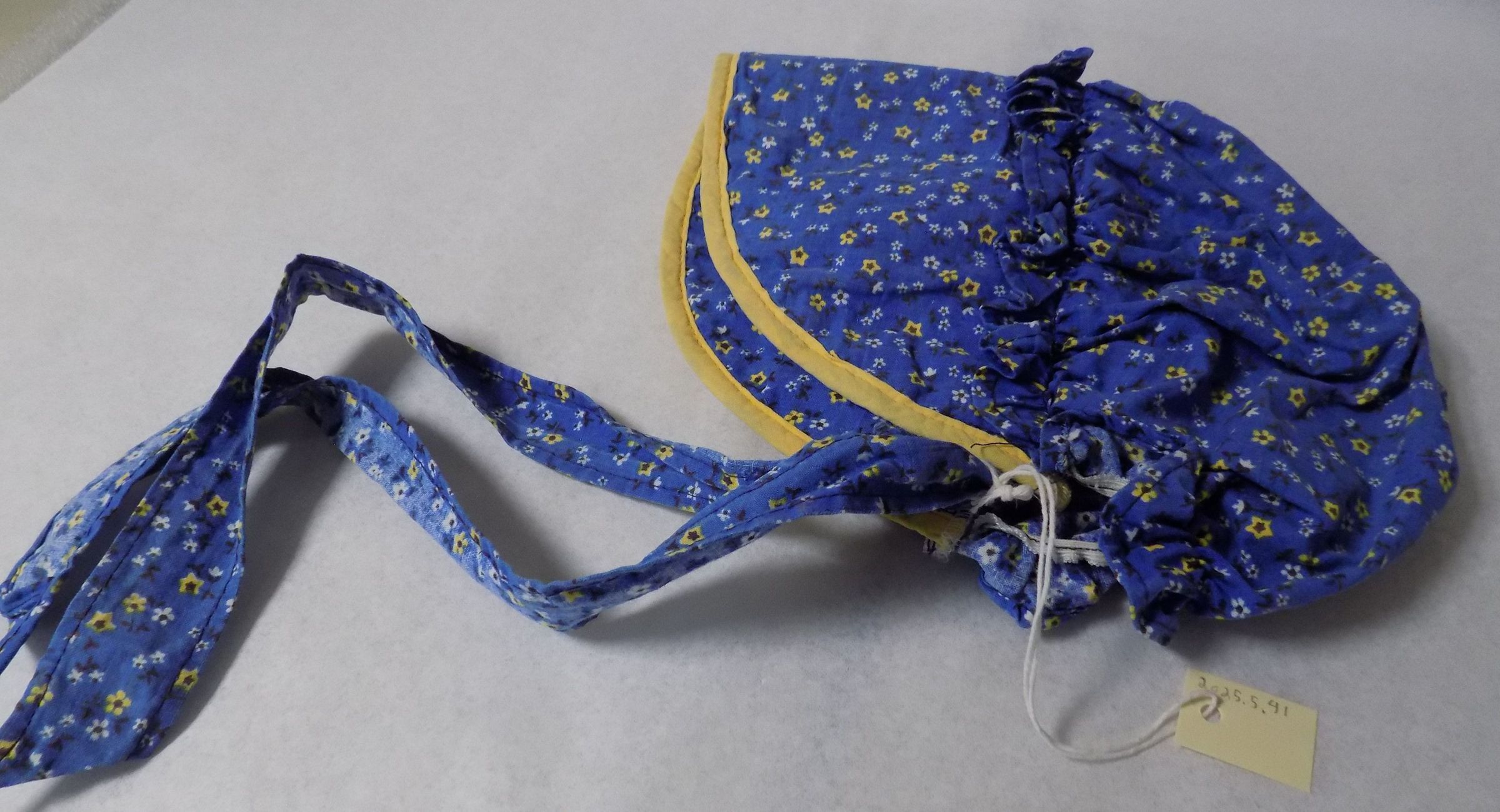 Item is a ruffled baby bonnet, likely from the 1970s, made of dark blue fabric patterned with miniature yellow and white flowers. The hood of the bonnet is stiff and has a yellow border, ending with two strips of fabric that could be tied together. The back of the bonnet is elastic, and the edges are slightly frayed.