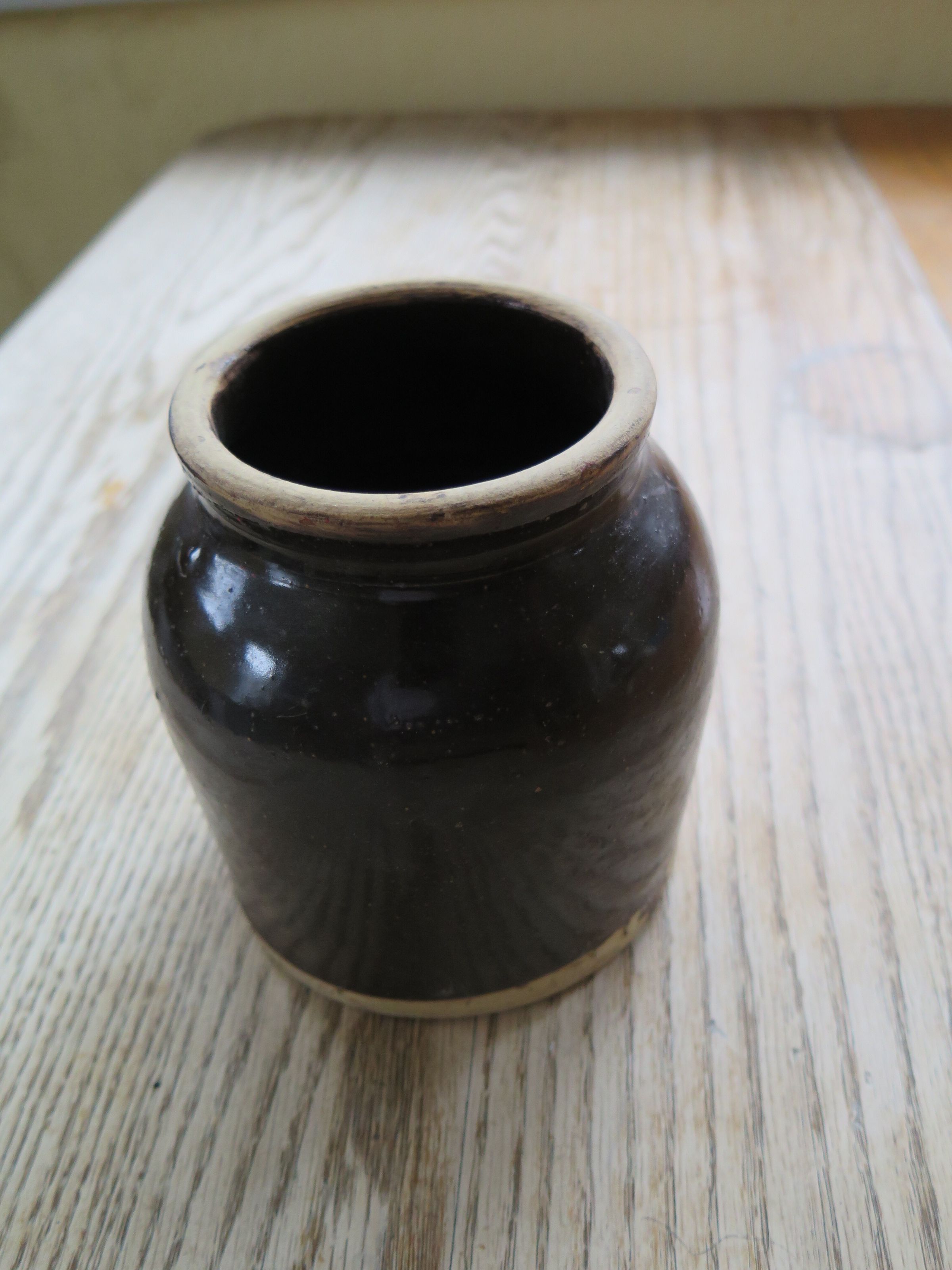 Ceramic that has been painted brown and glazed. The crock measures 5.5" (h) x 4.5 " (diam).