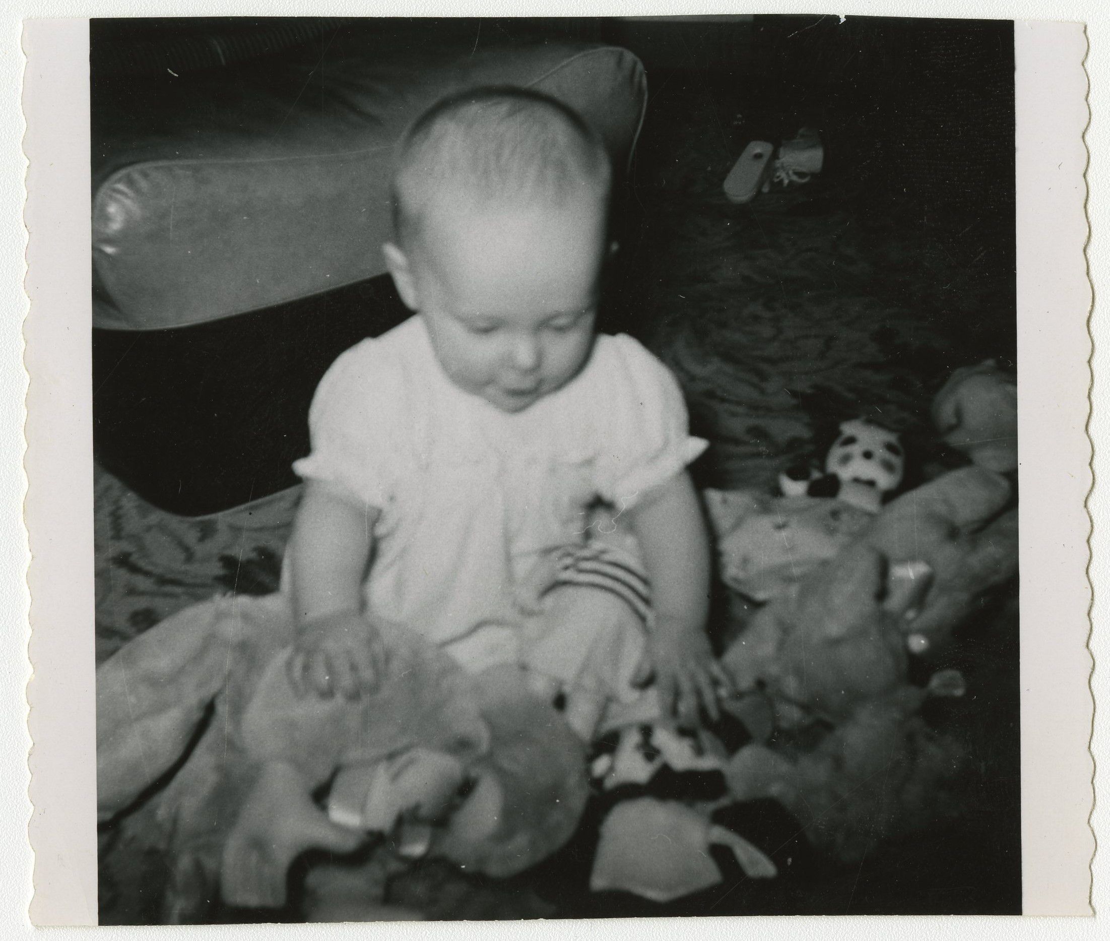 Black and white photograph of a baby surrounded by plush animals.