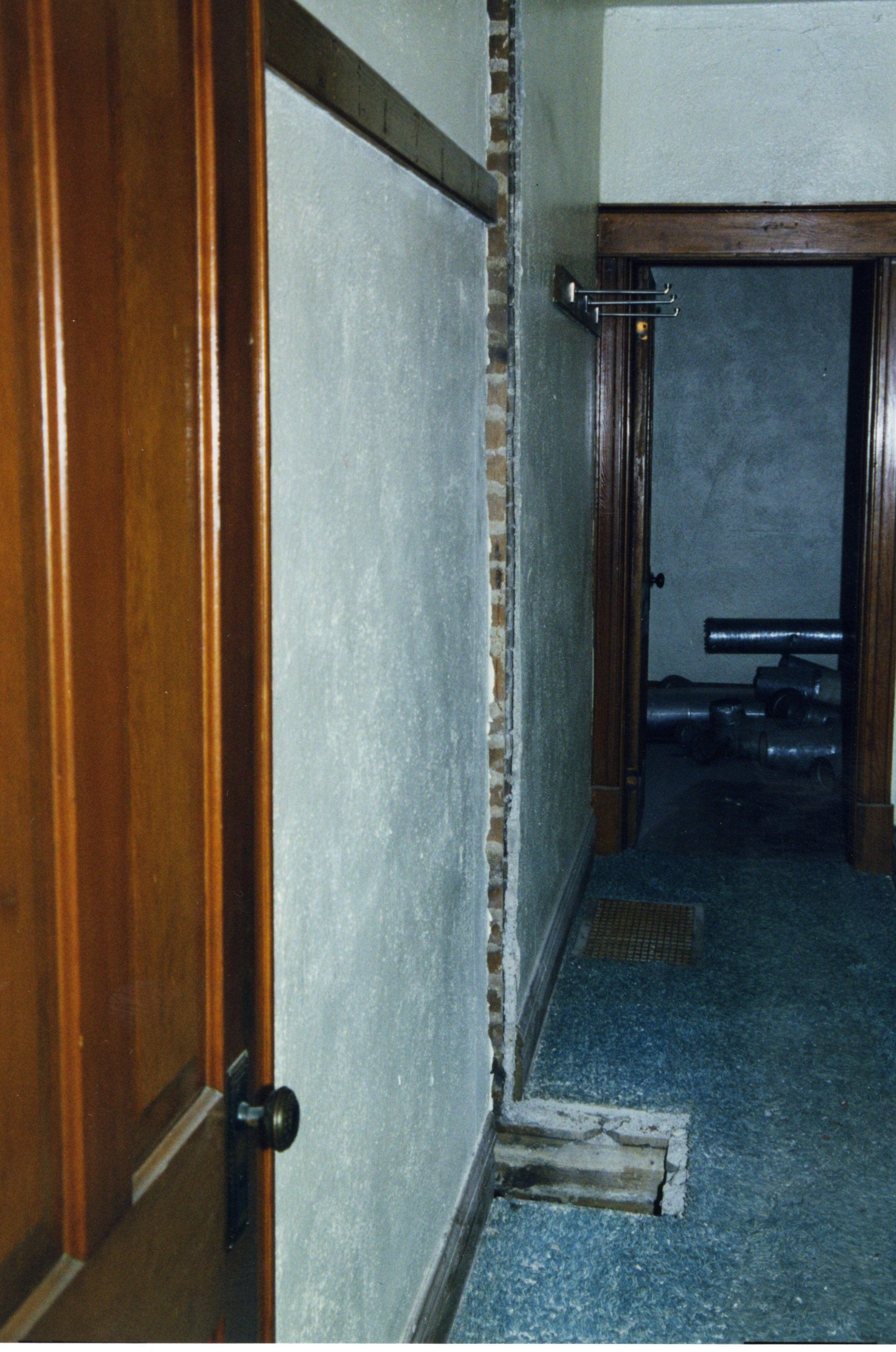 Brunner house. Interior view of hallway. Wood door on left side. Open door at end of hallway.