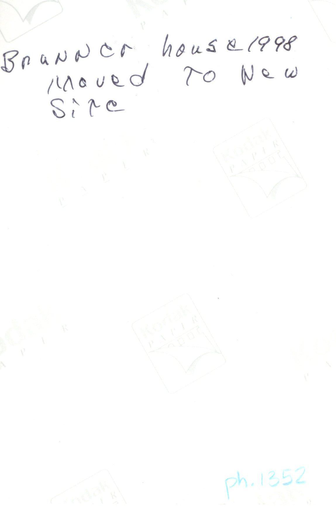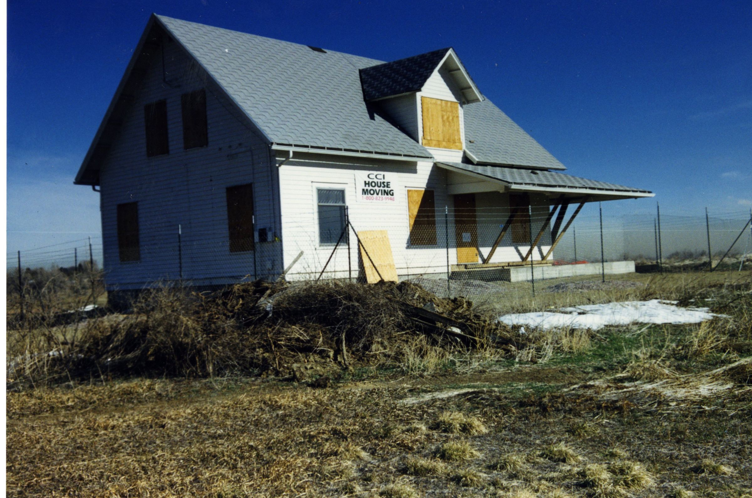 Brunner house. Moved to new site in the field. Door and windows boarded. Fence around house. "CCI House Moving" sign on front of house.