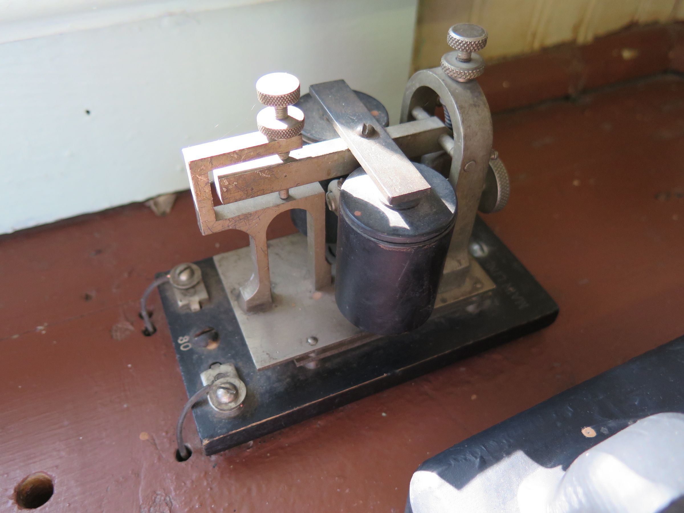 The sounder is the part of telegraph which made the clicking sounds for the telegraph operator to hear and transcribe. The sounder measures 4.5" (h) x 5.5" (w) x 3" (d).