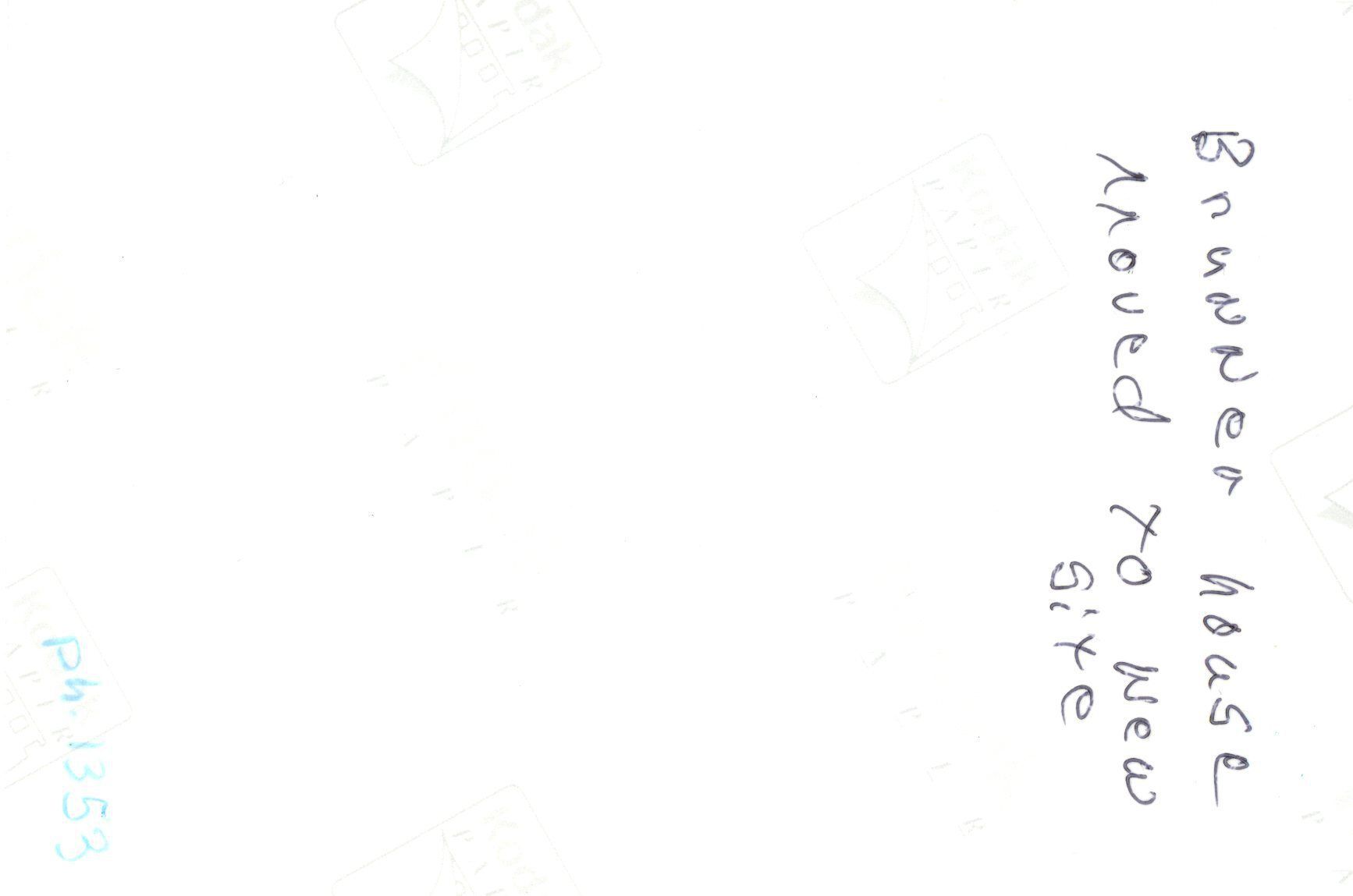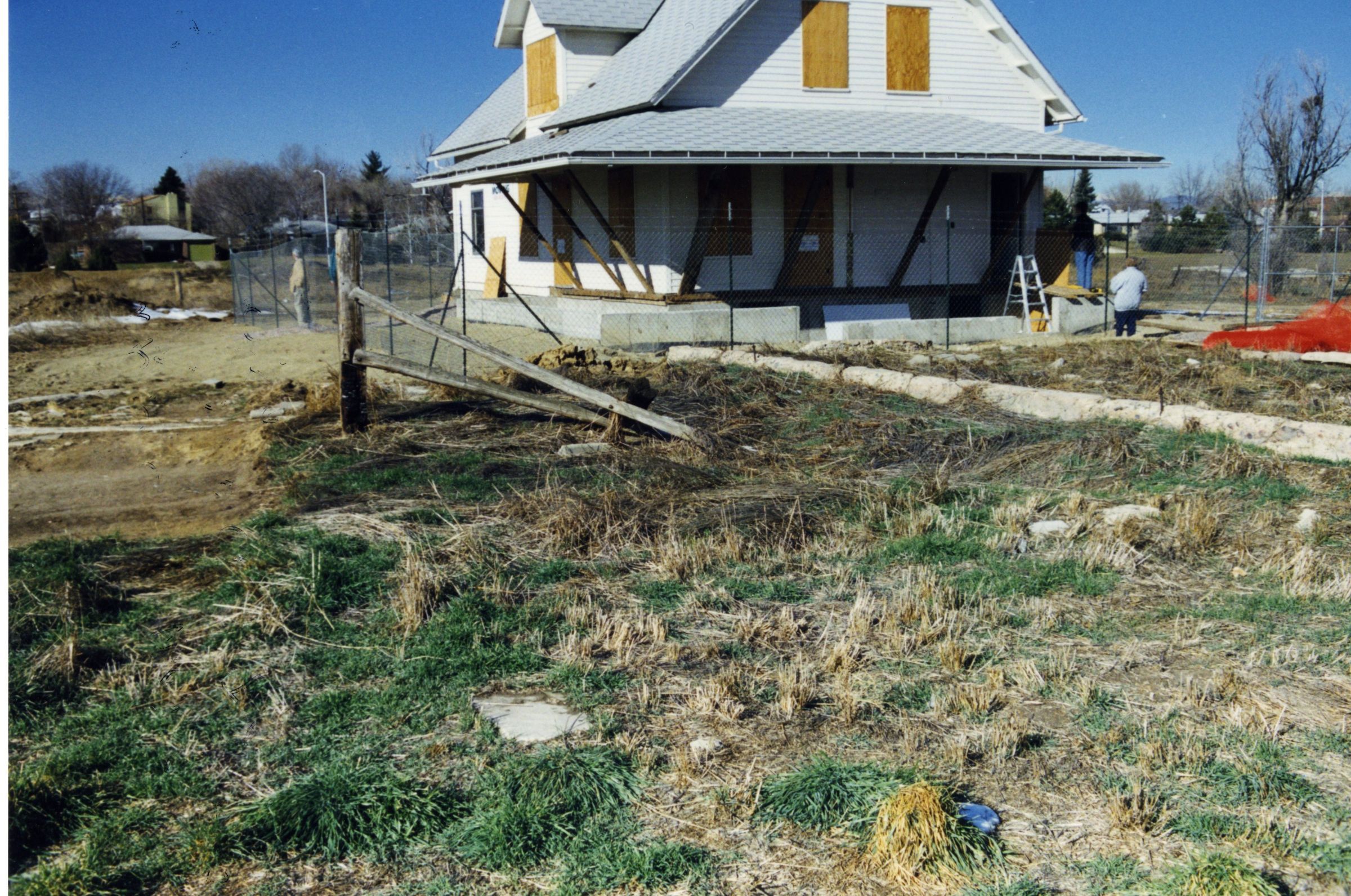 Brunner house at new site in the field. Doors and windows boarded. Fence around house. Three men by the house.