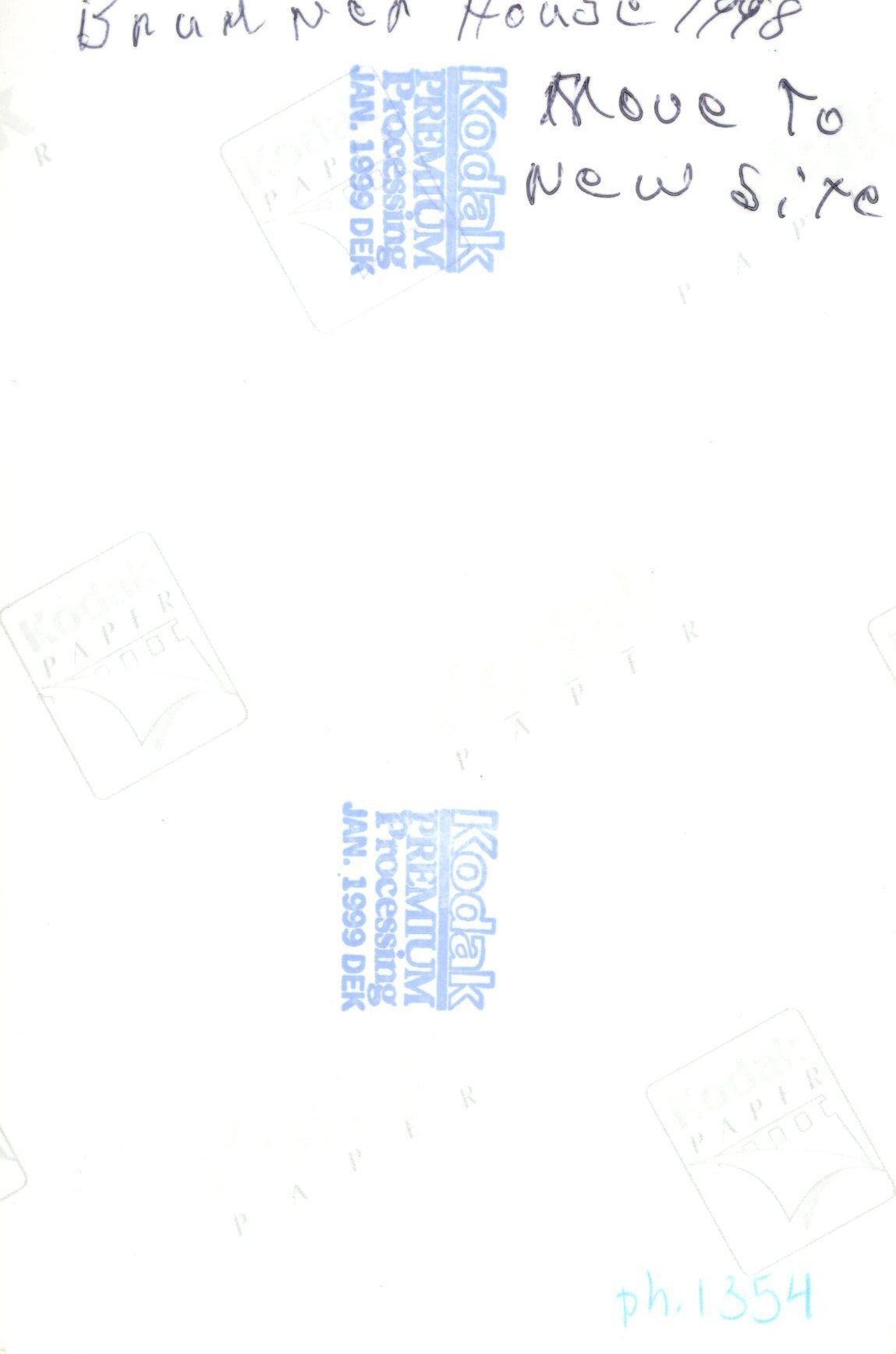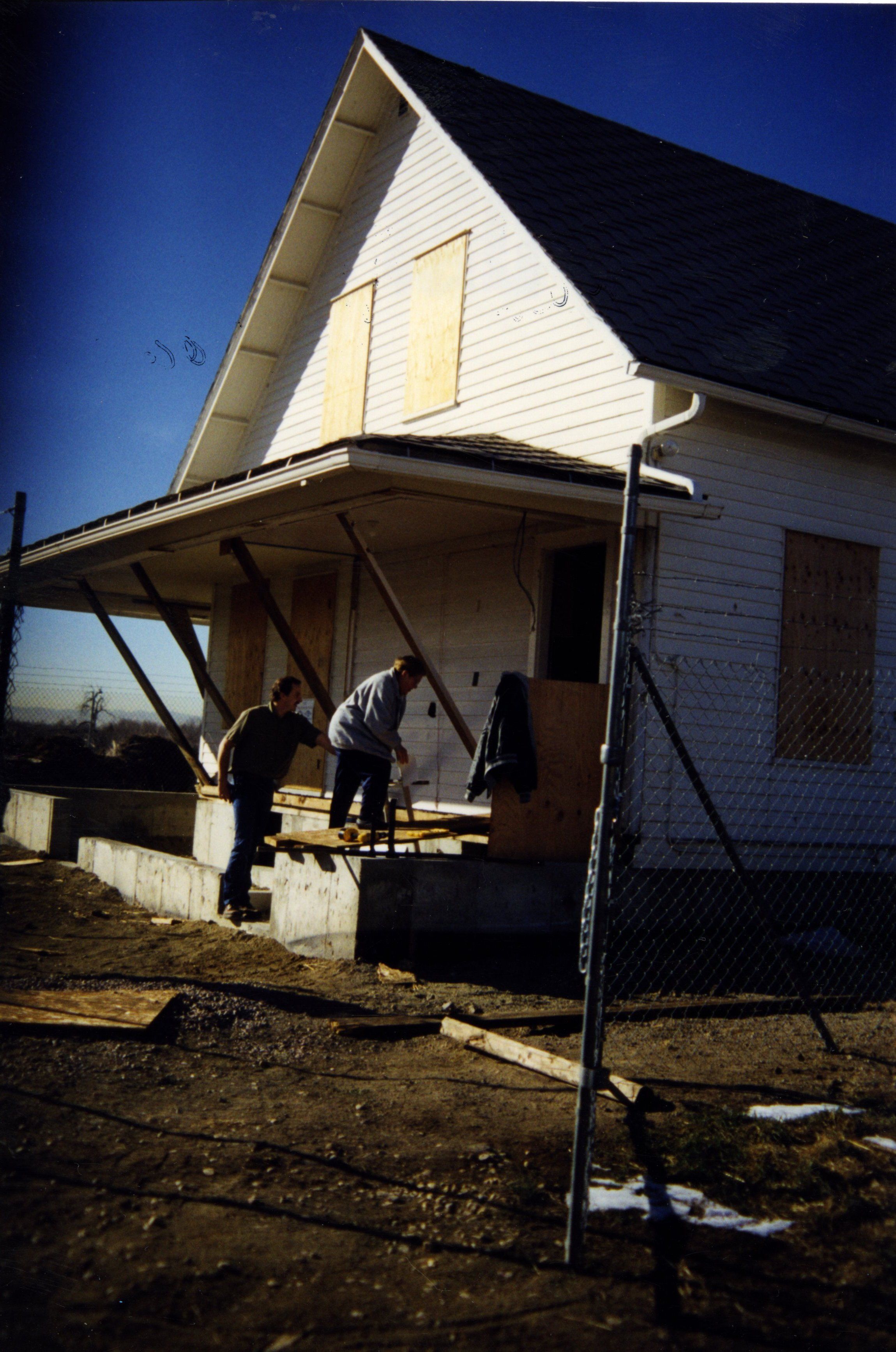 Brunner house at new site in field. windows boarded. One man and one woman in front of house. Fence in foreground.