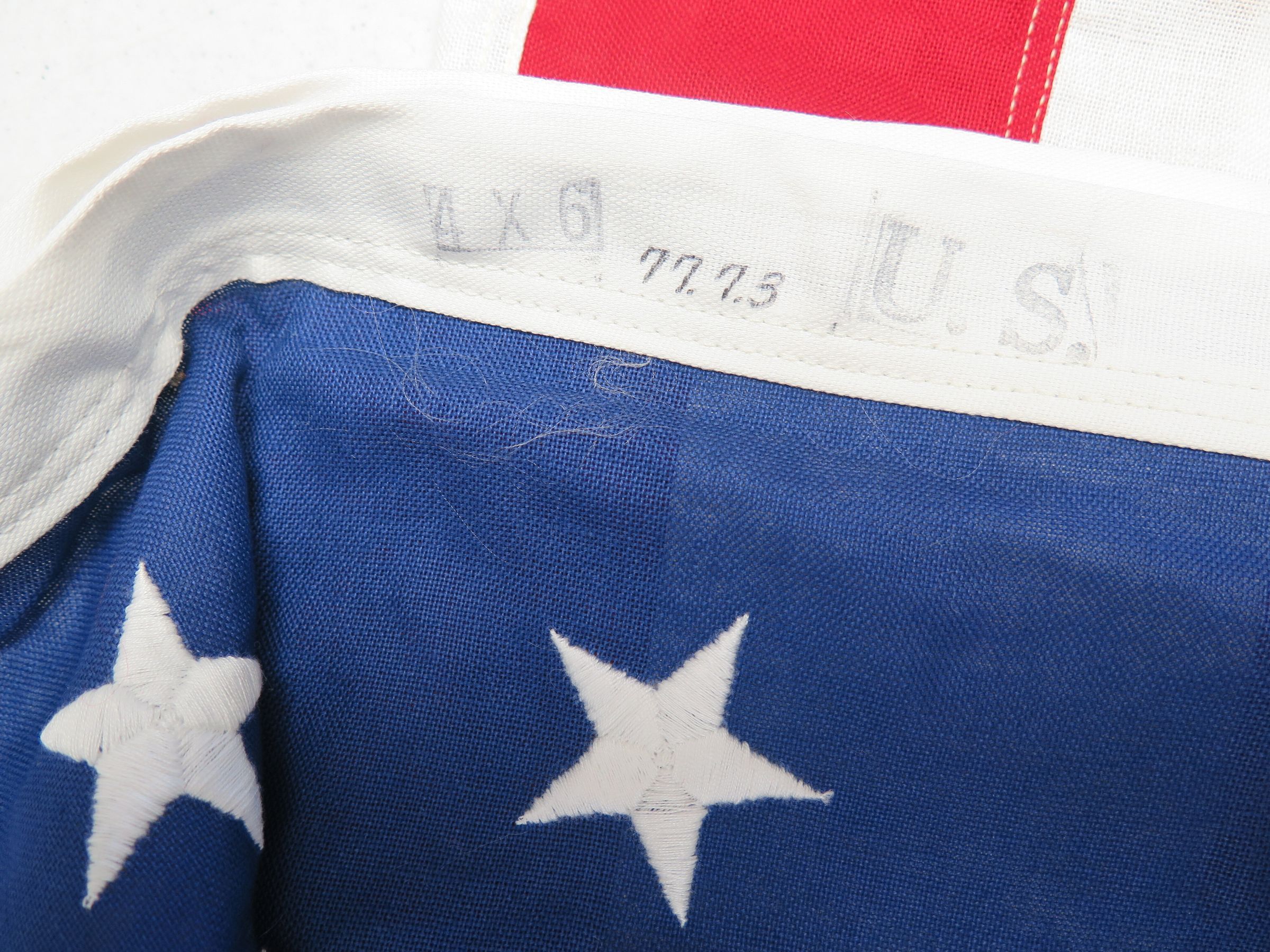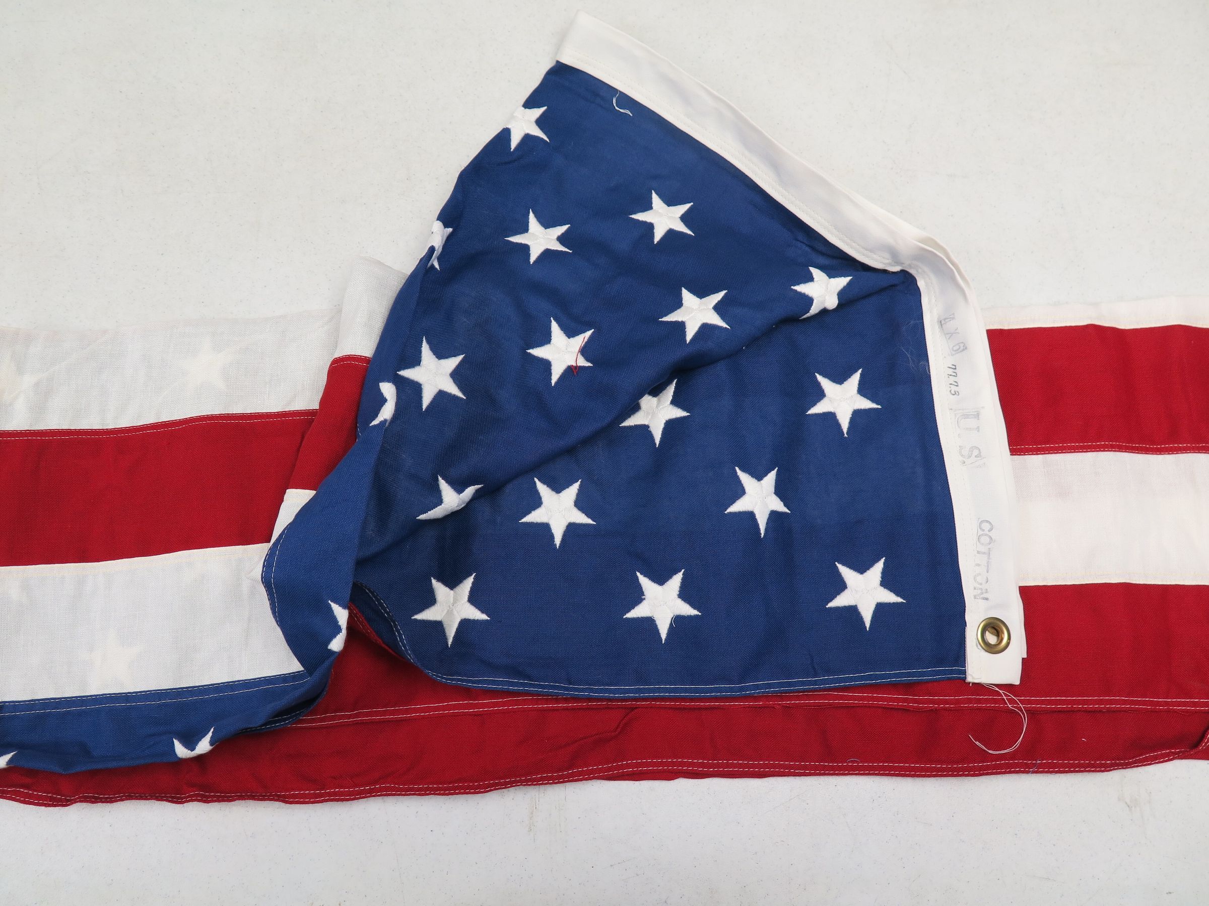 This is a U.S. flag. The top left corner of the flag is a blue material with 50 white embroidered stars. The remainder of the flag consists of 13 red and white stripes. The flag measures 48" (w) x 72" (l).
