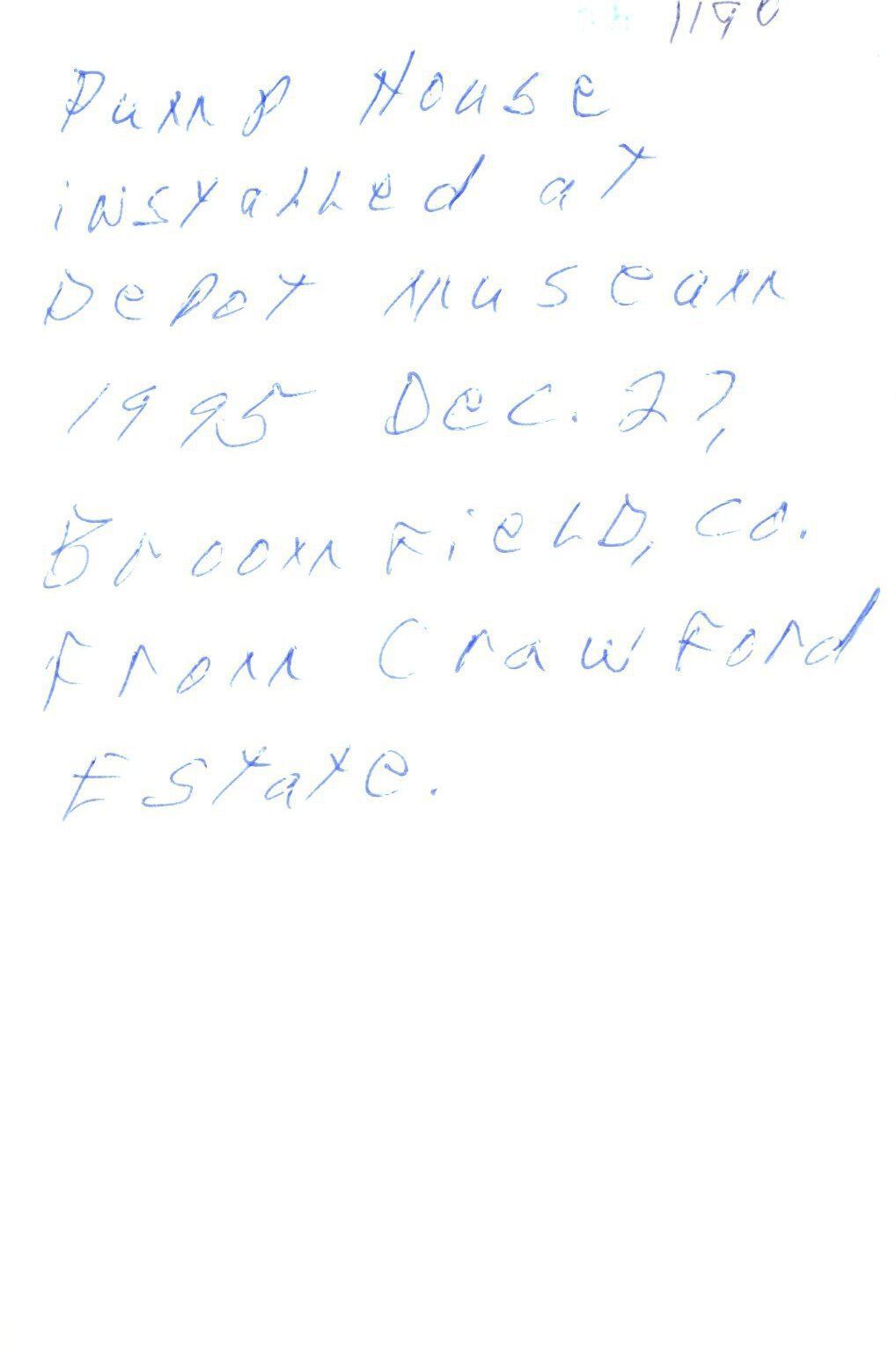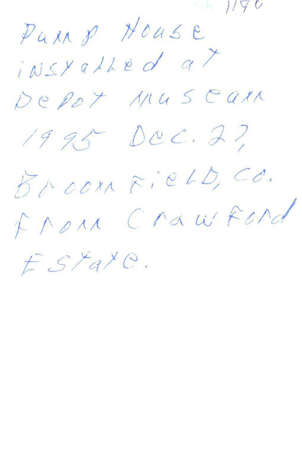 Pump house installed at Depot Museum. December 27, 1995 in Broomfield, Colorado. From Crawford Estate.
