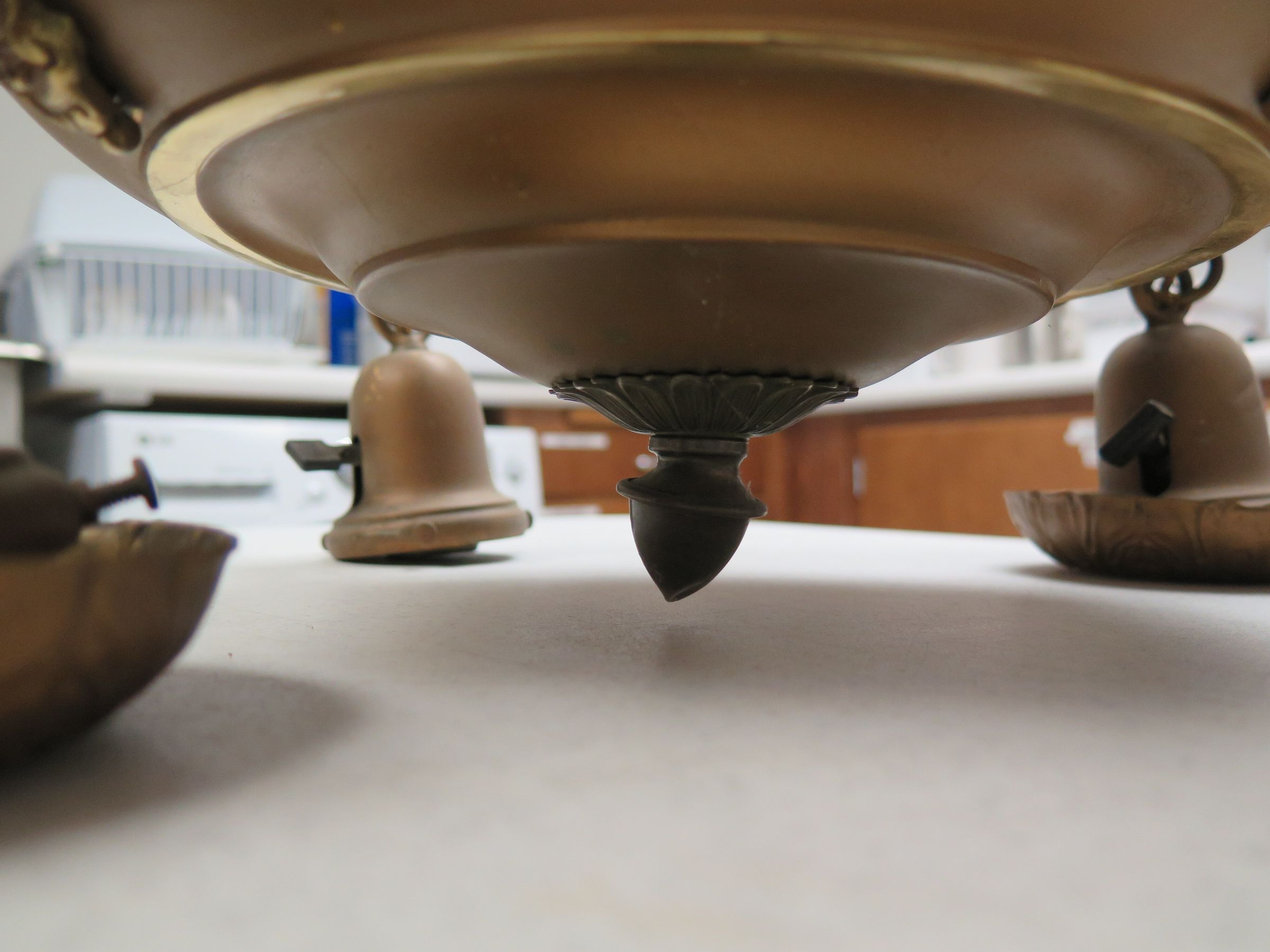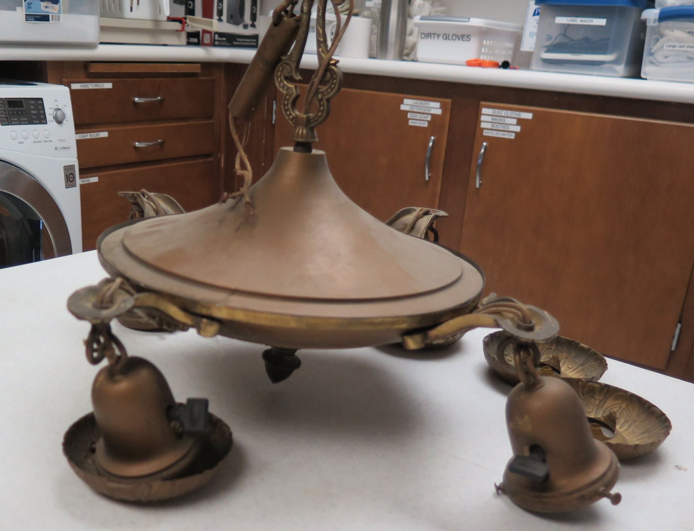 This is a metal hanging light fixture with 4 pendant light receptacles. 13"(H) x 17"(Dia) It is bronze in color.