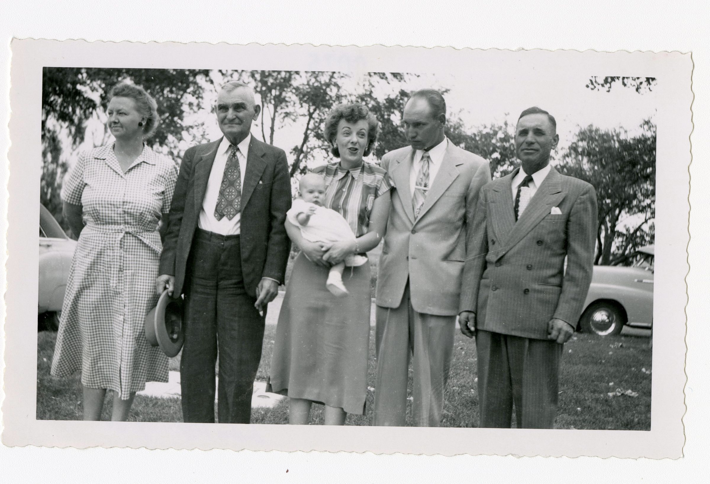 Black and white photograph of six people. Five are adults and the last person is a baby. The people in the image are identified as Lib Brunner, Albert Brunner, Ila ?, Gib ?, and baby Lester C Brunner.
