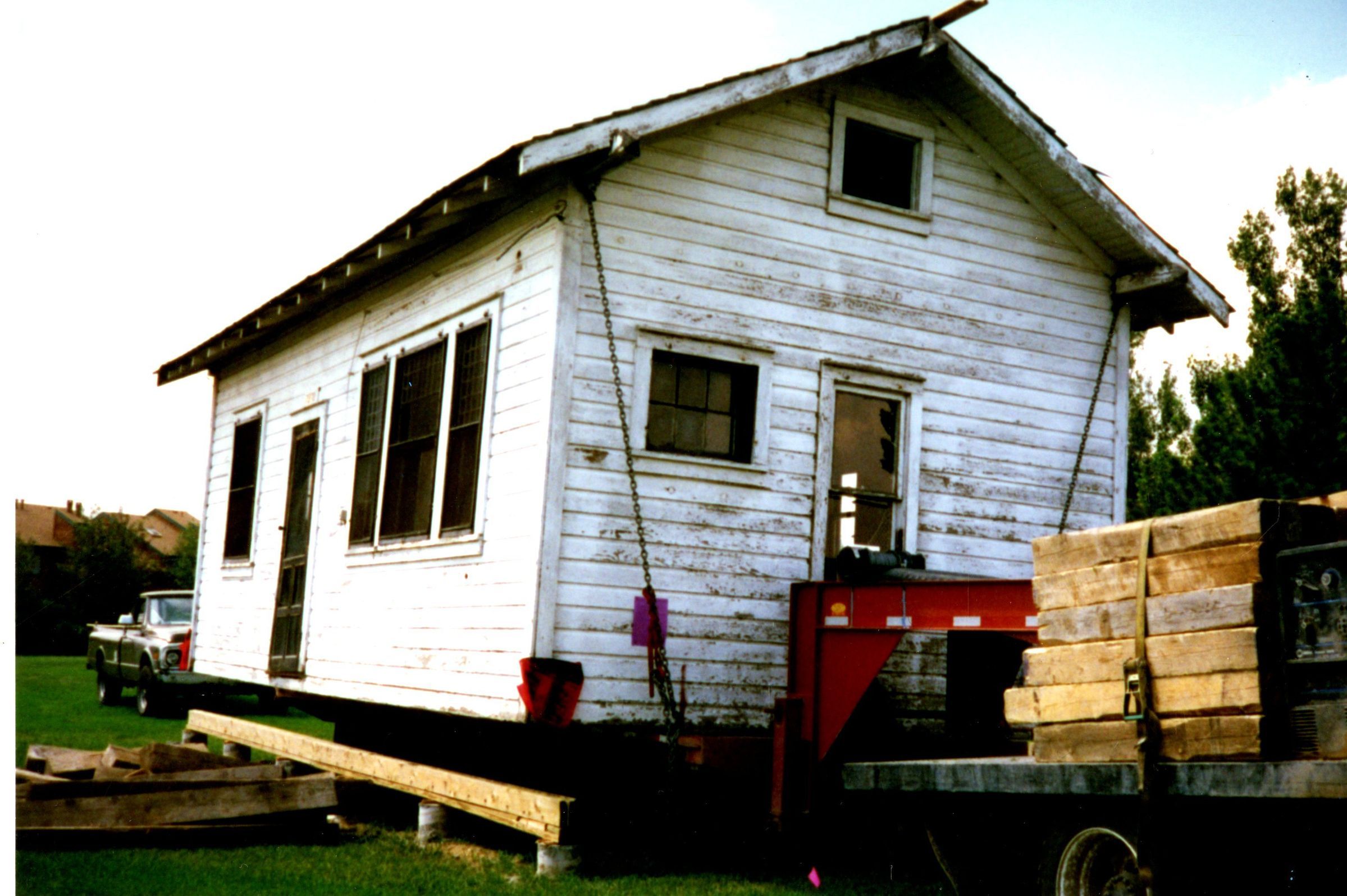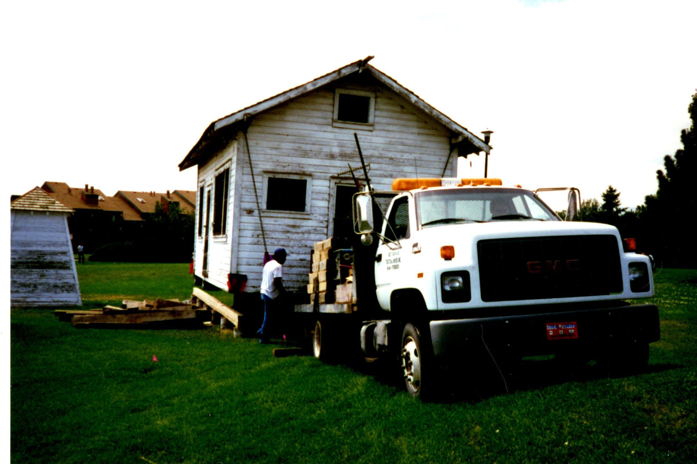Moving the Honey House on truck at Zang Spur Park. Front view.