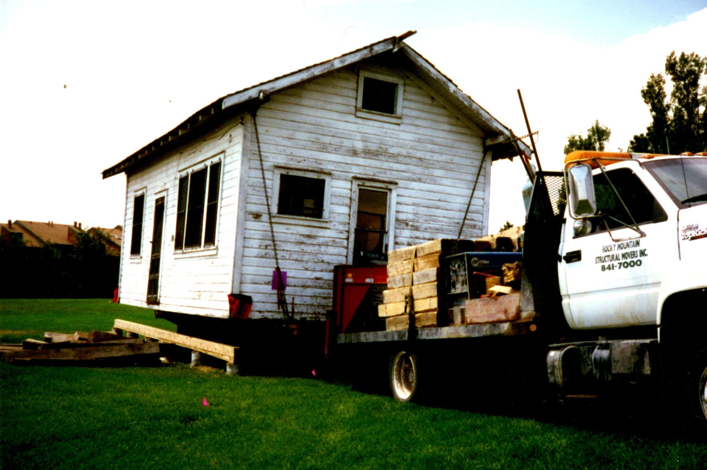 Moving the Honey House on truck at Zang Spur Park. Front view.