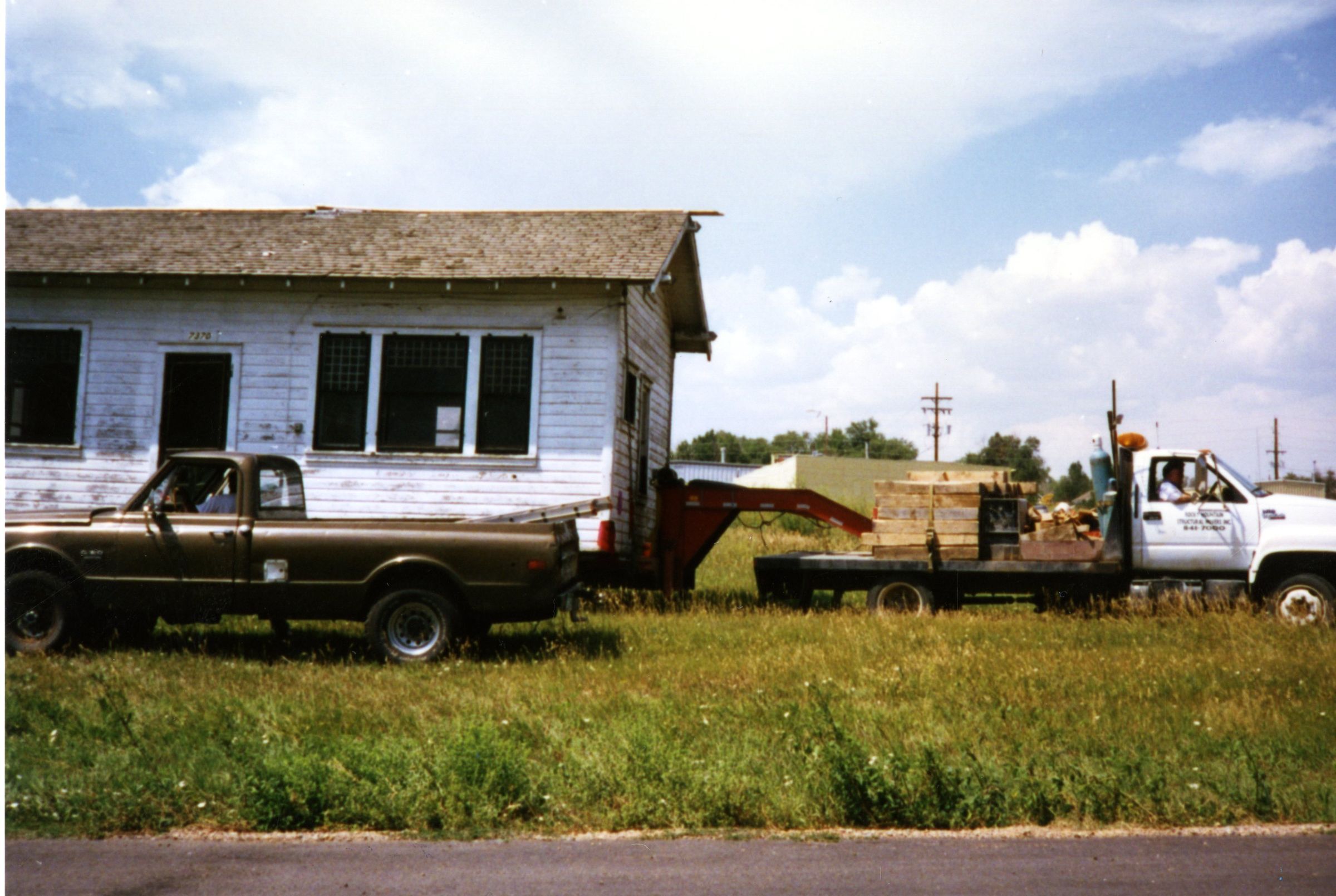 Moving the Honey House on trailer in field. Front side view.
