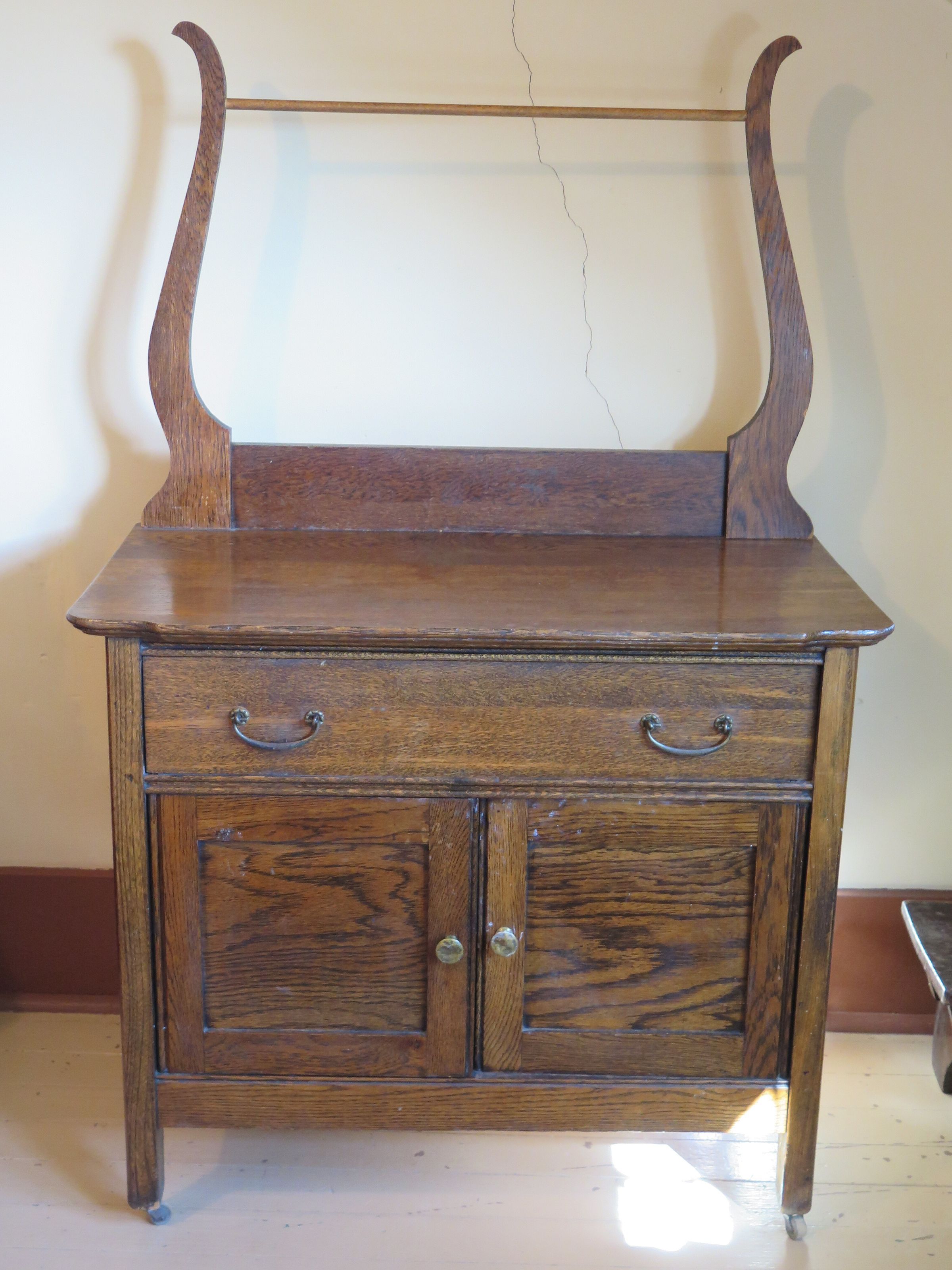 Wooden short cabinet with top towel rack at top. A large bowl and pitcher would have sat on top, the pitcher would hold water which was poured out into the bowl to wash your face/shave in the morning. Towel held on rack would be used to dry. Popular before there were bathrooms for everyone in a house. The washbasin measures 51" (h) x 33" (w) x 17" (d).