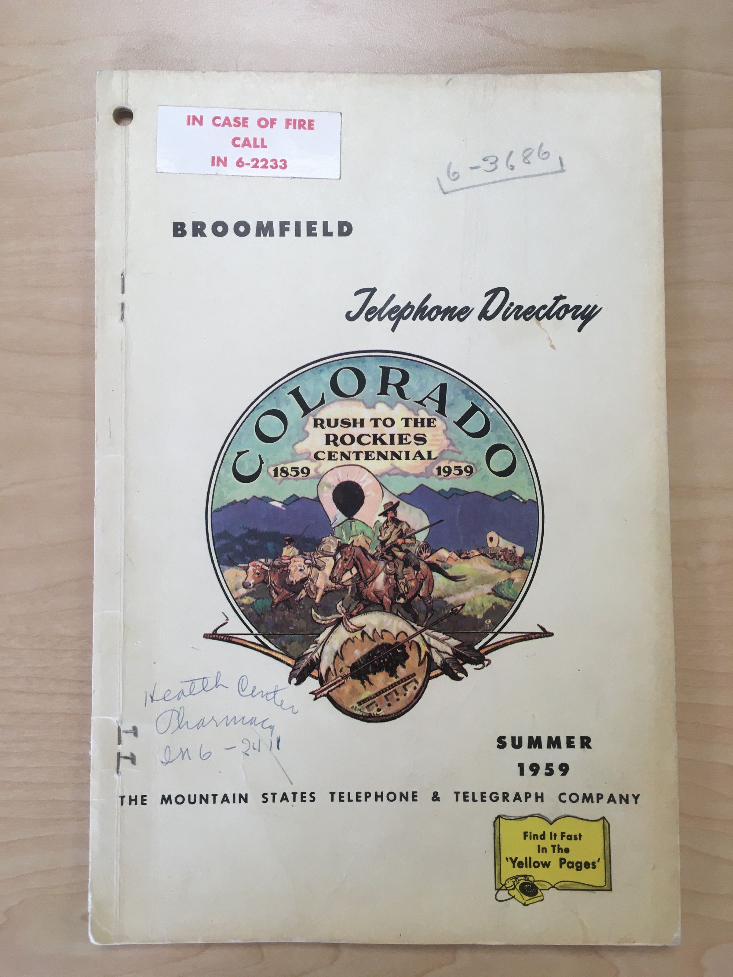 Broomfield Telephone Directory from the summer of 1959 made by The Mountain States Telephone and Telegraph Company. Yellow Pages edition. News clipping ("New Scedule for Bus Stops is Annouced" taped to the first page. Cover and inside yellowed with age. Writing on front cover.