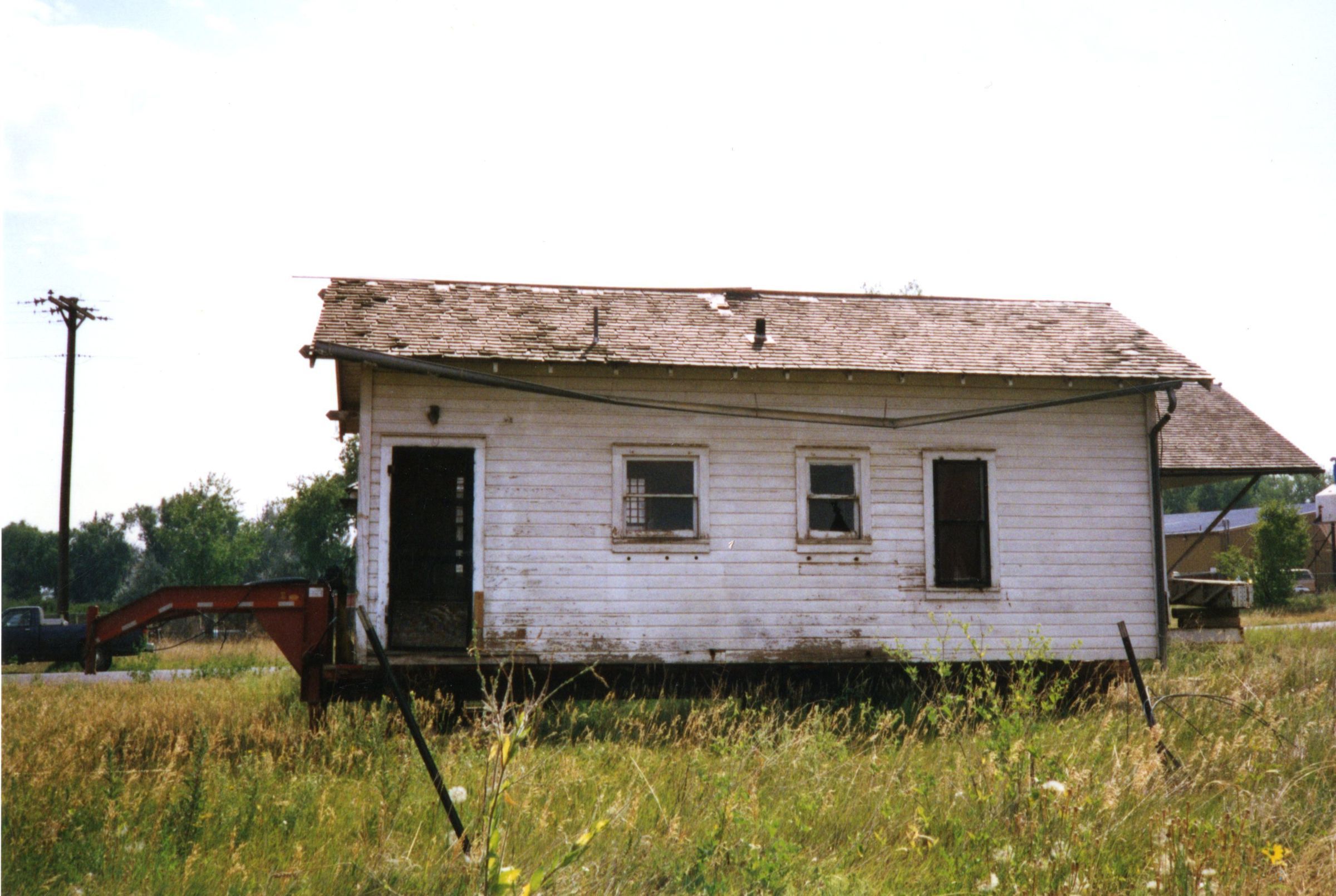 Moving the Honey House on trailer in field. Side view.