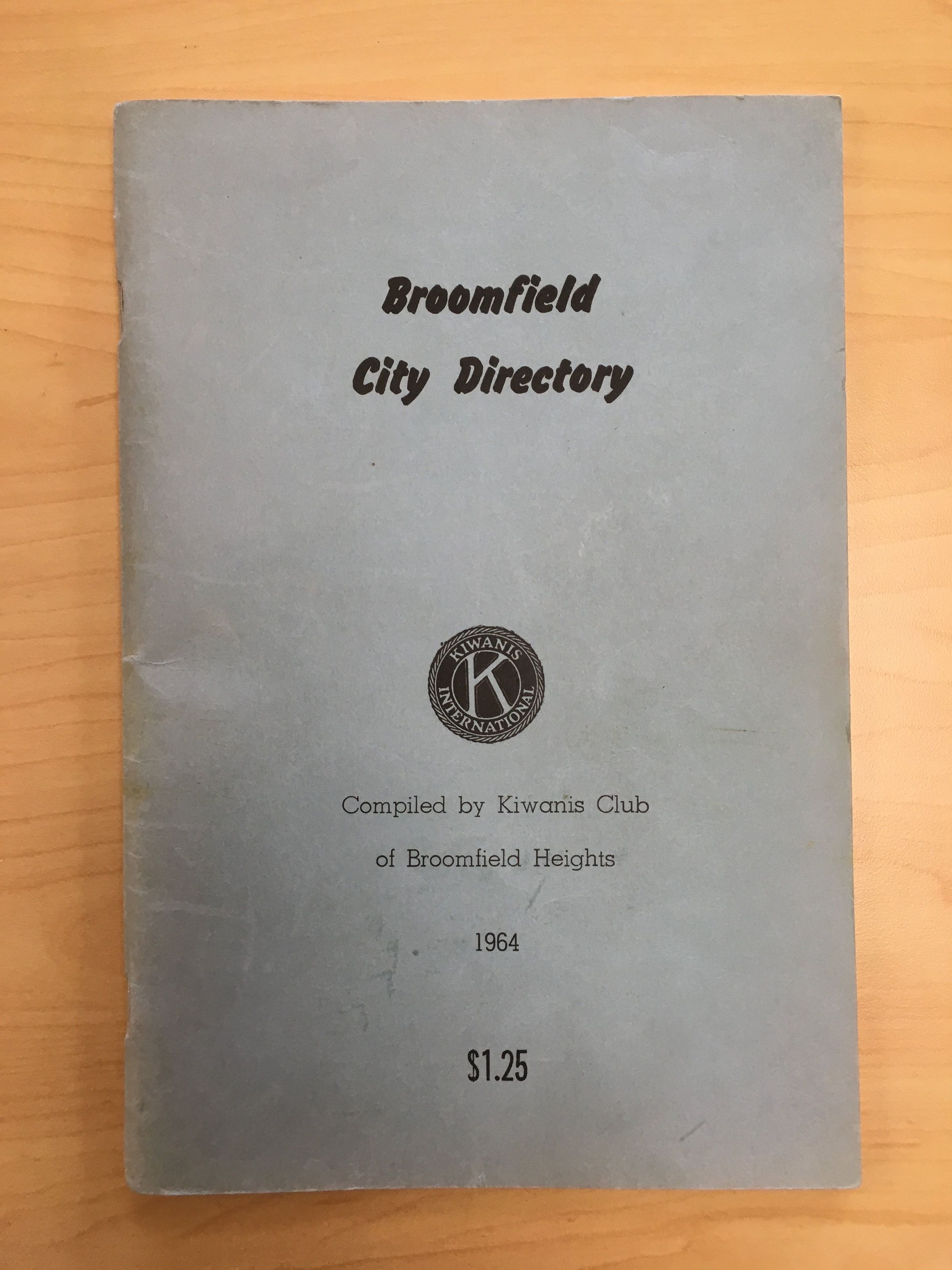 Broomfield City Directory compiled by Kiwanis Club of Broomfield Heights from 1964. The binding has some discoloration and the inside page has some writing on it, but it is otherwise in good condition